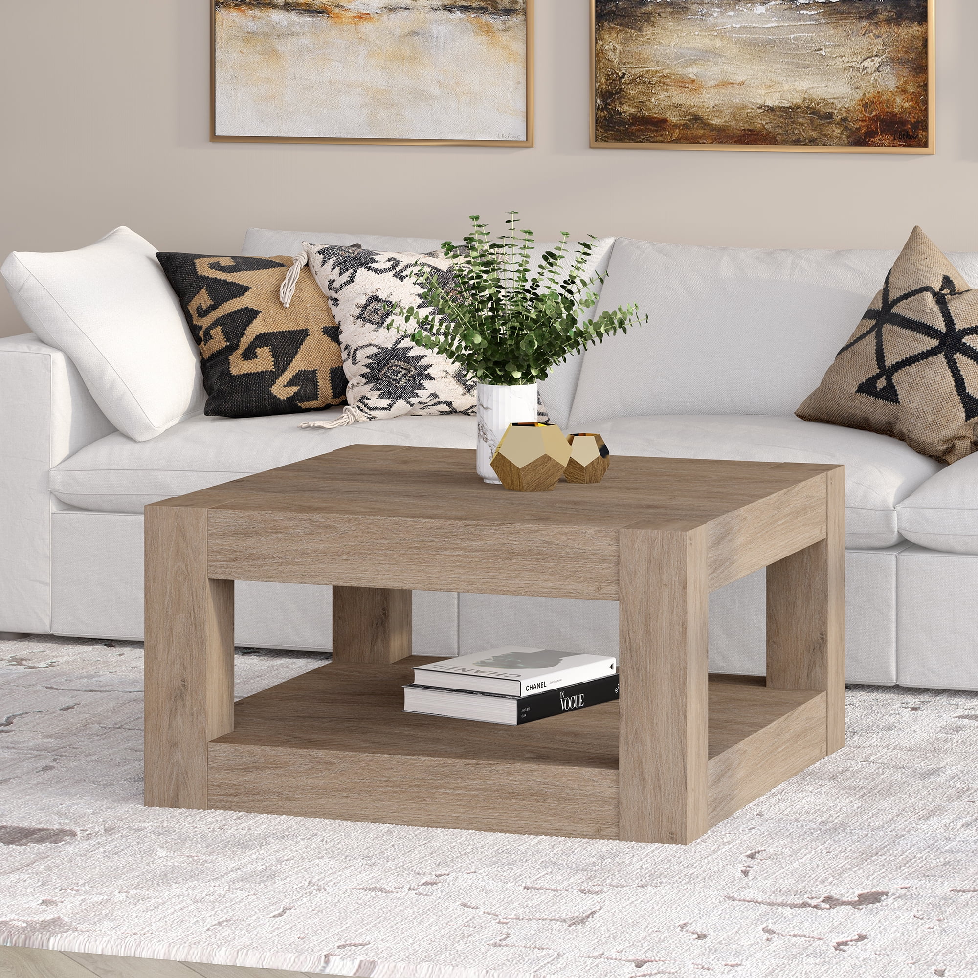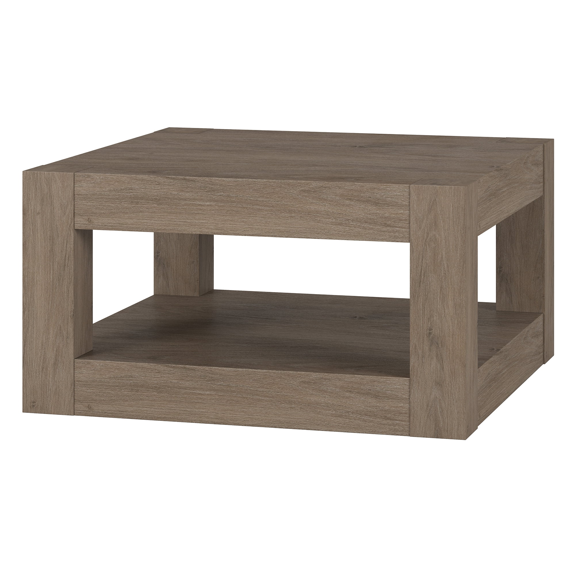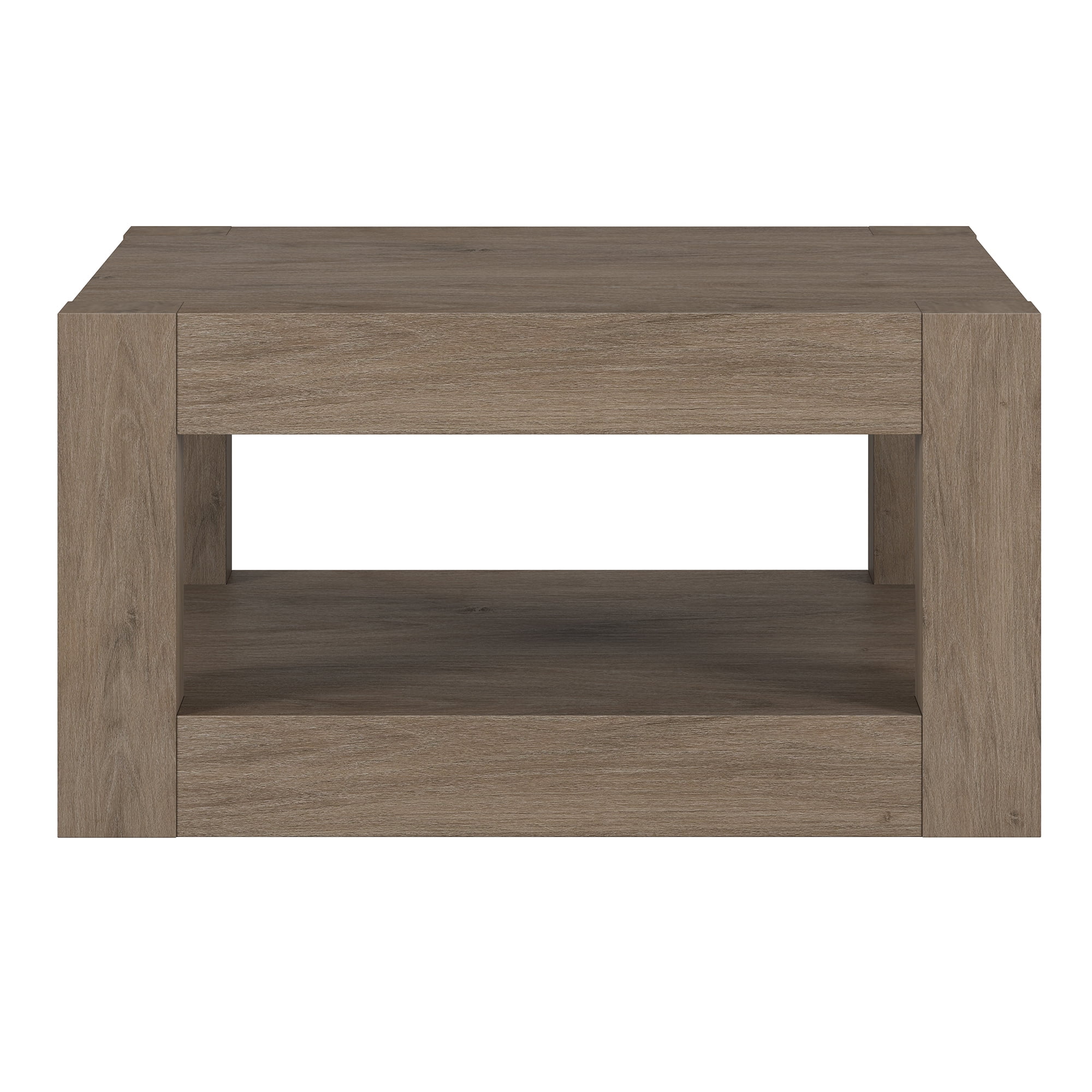 A minimalist contemporary design for your living room, den, and more. Finished in wood-look antiqued gray oak. Table is made of high-quality and durable MDF materials. Tabletop and lower shelf each feature a weight capacity of 50 lbs. Features easy assembly. Clean with a soft, dry cloth; no harsh chemicals or abrasive cleaning materials.