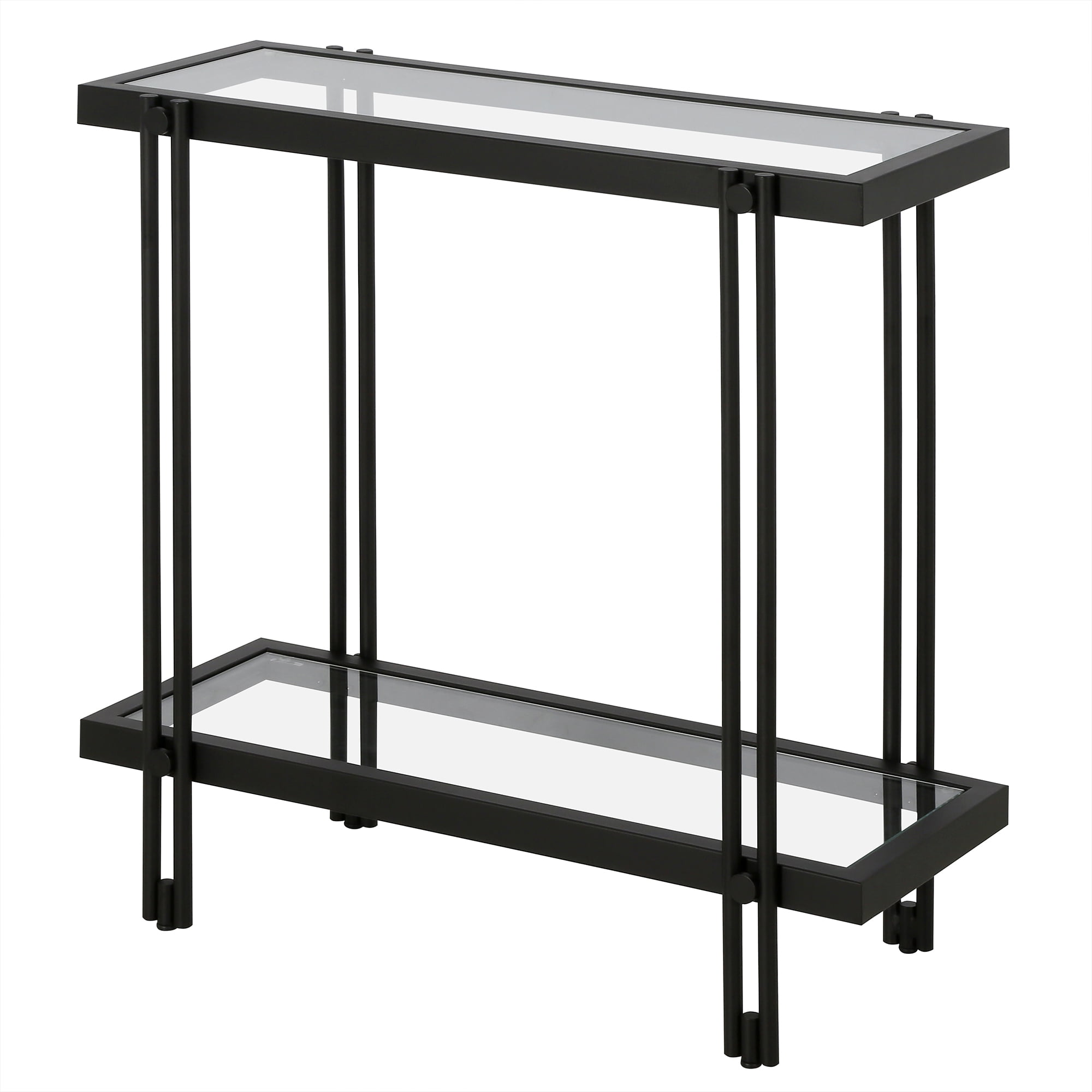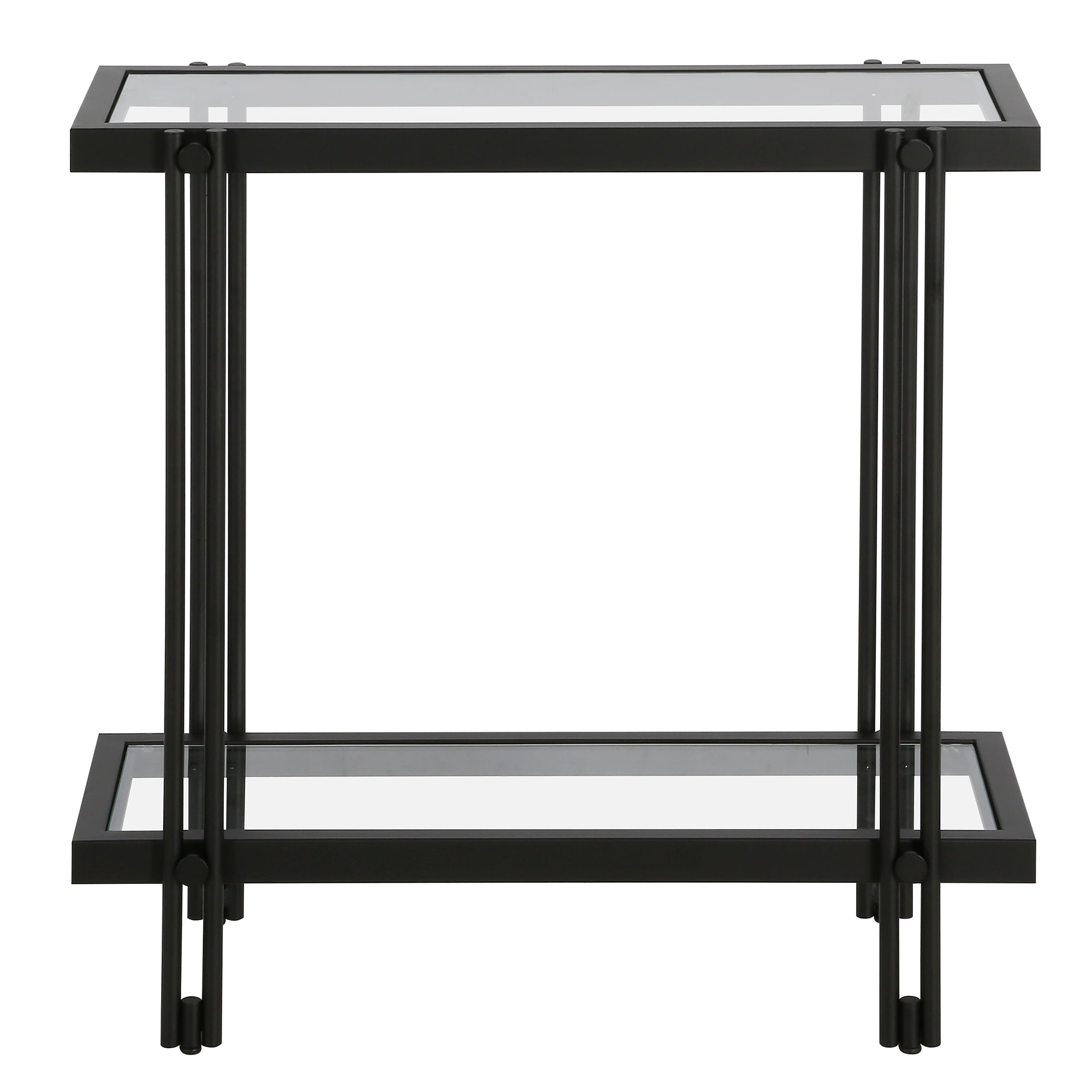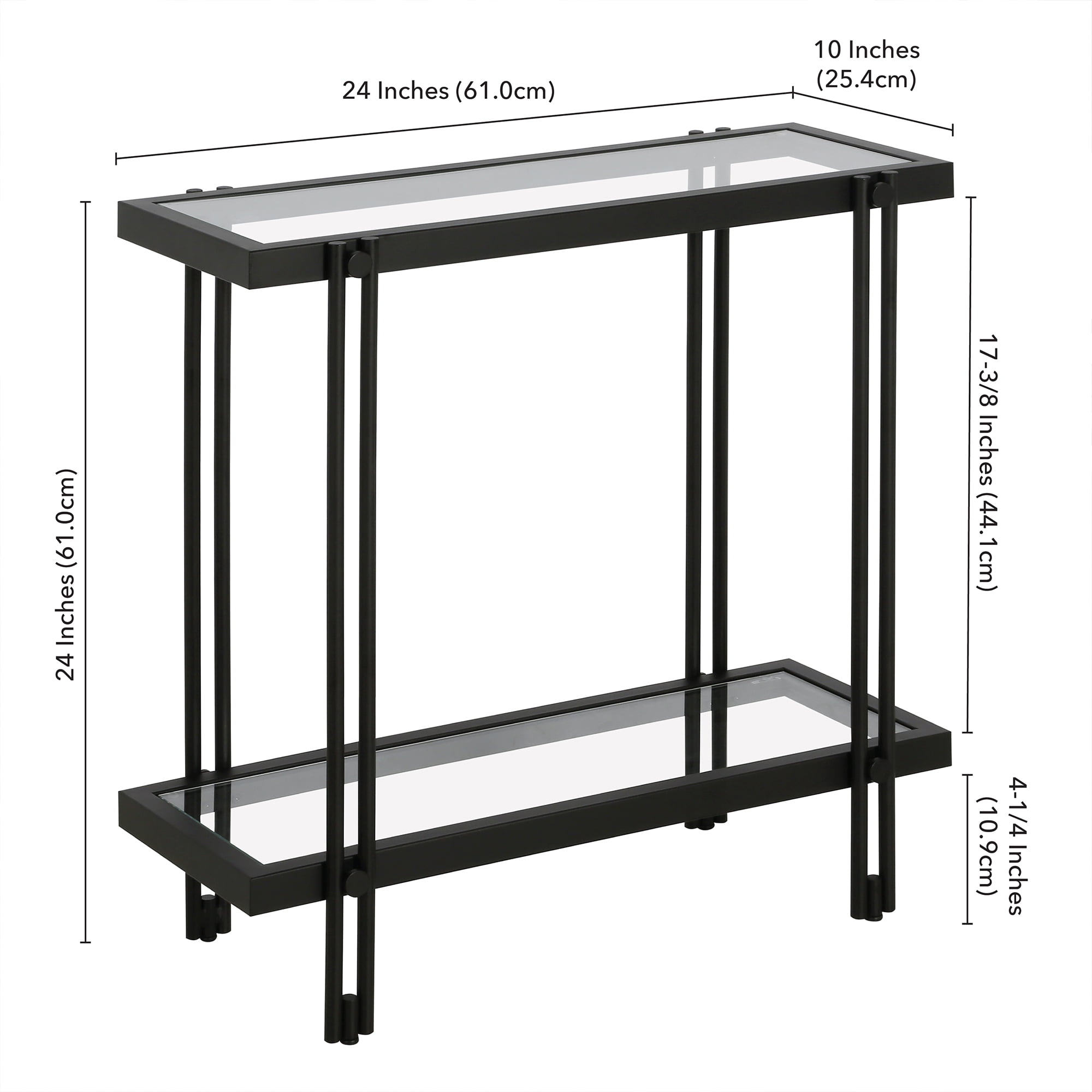 Tabletop and shelf are made of durable tempered glass Handcrafted finish is applied to the steel frame Tabletop and shelf each have a weight capacity of 20 lbs Features easy assembly. Clean with a soft, dry cloth; no harsh chemicals or abrasive cleaning materials.