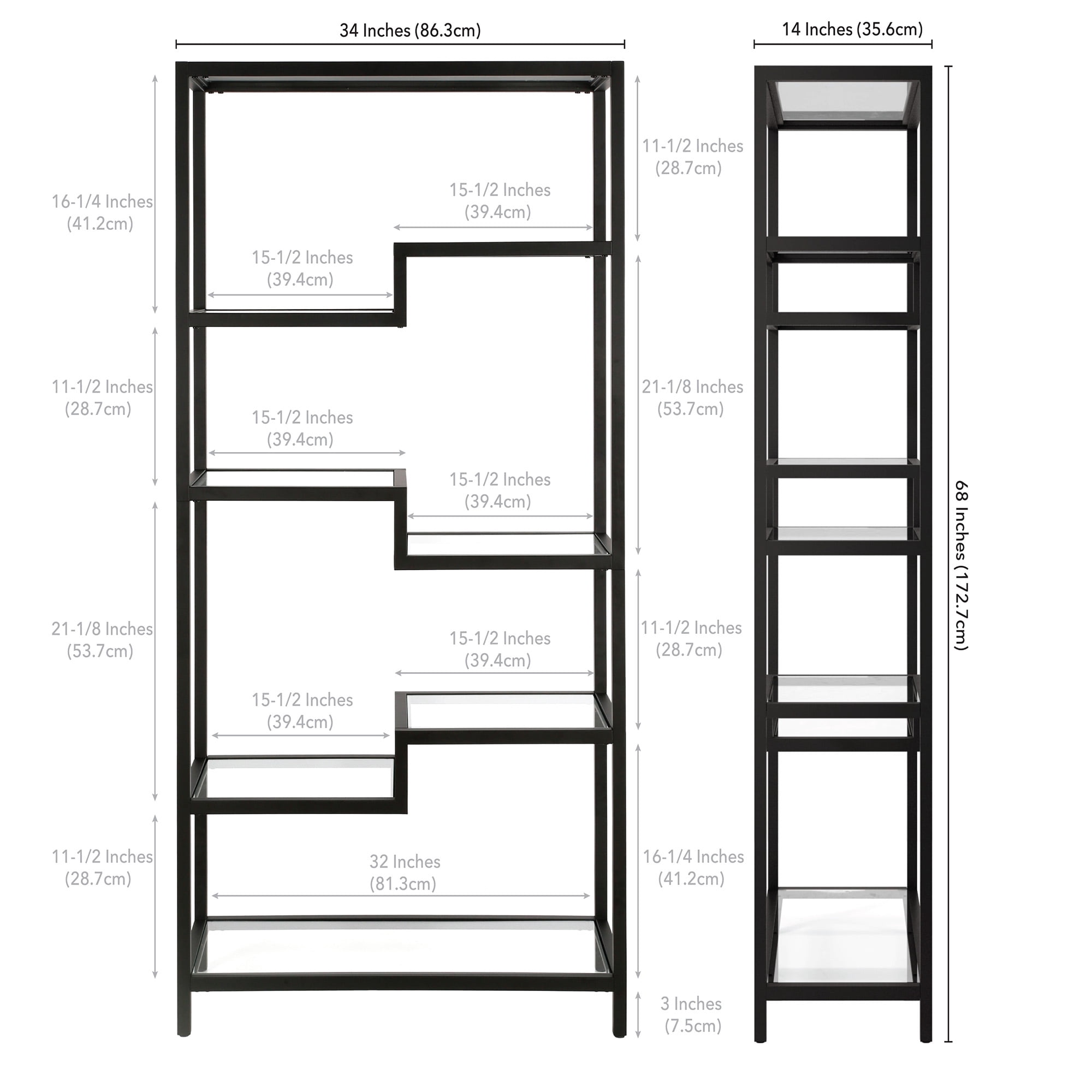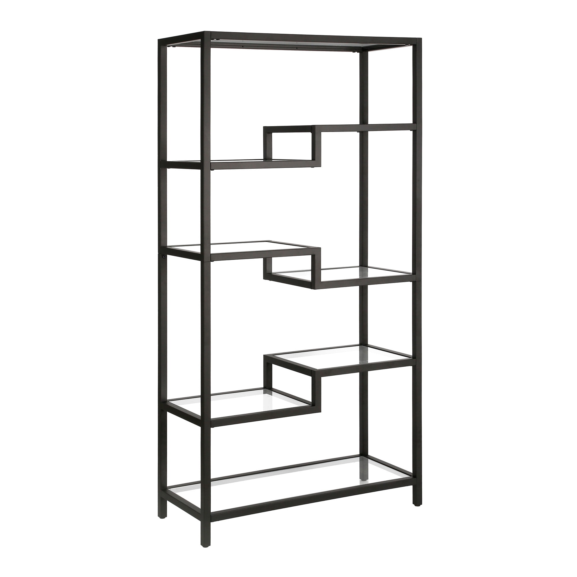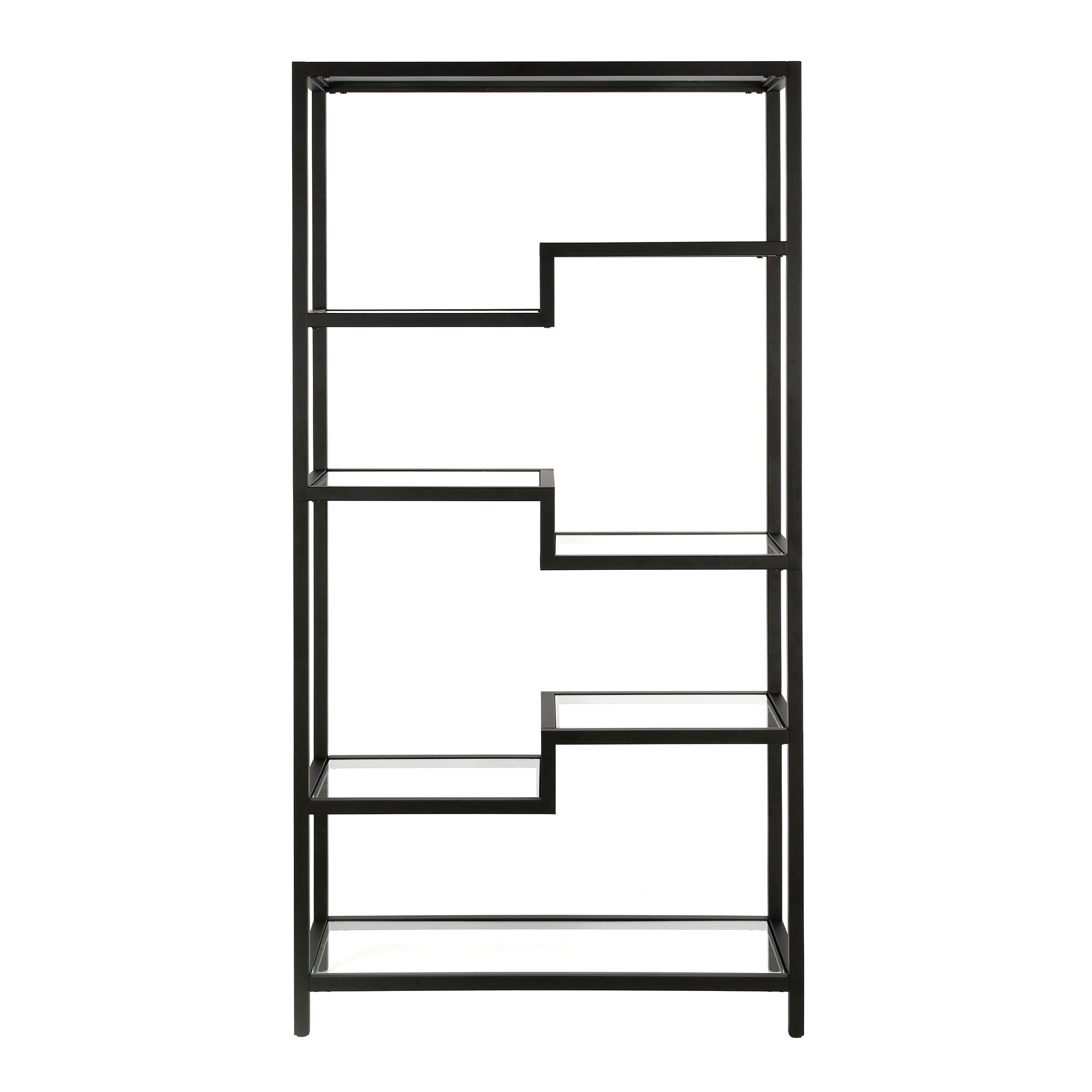 A sturdy, metal bookcase standing at 68″ tall. The geometric, staggered shelving comes in 4-tiers which allows you optimal space to display your books, pictures frames, plants and more!
