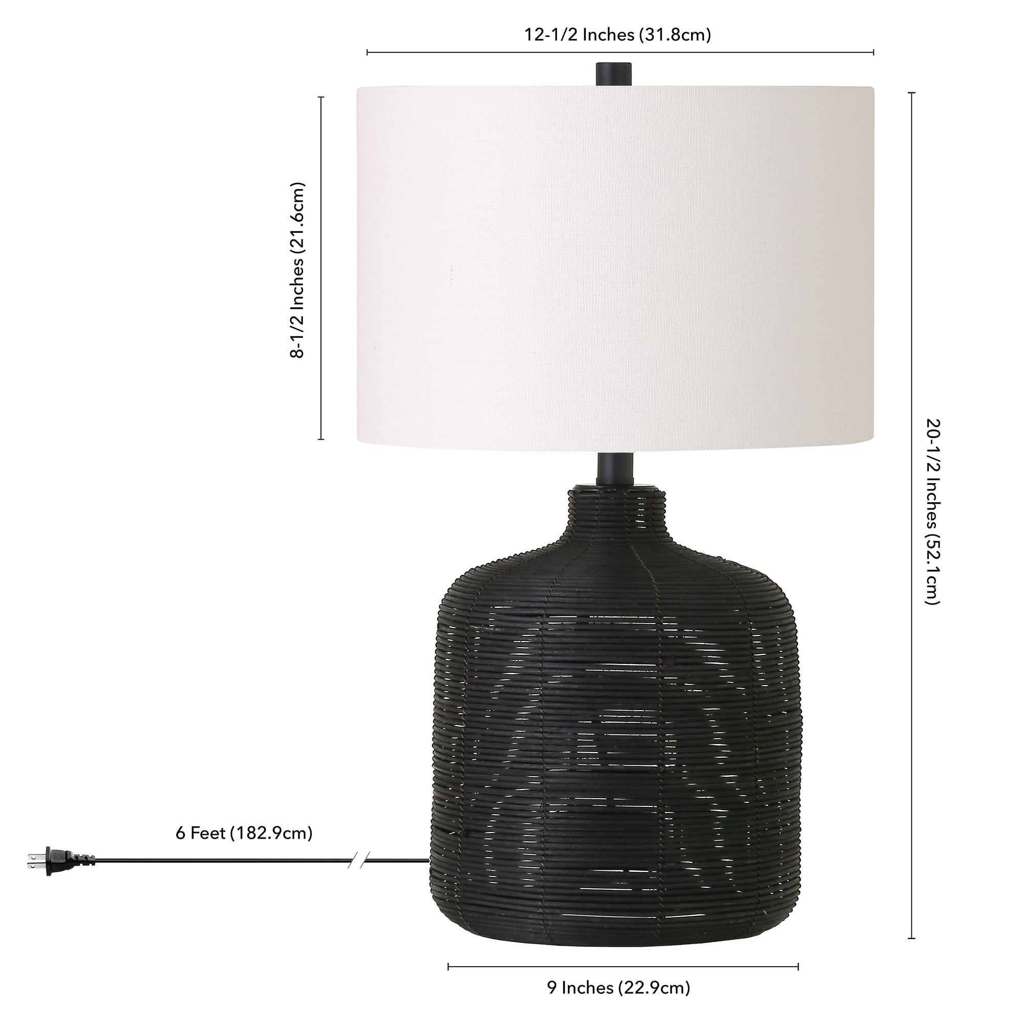 Add natural texture and warmth to any room with this handcrafted petite rattan table lamp. Bring a touch of beachy flair to your coastal cottage décor or use it as an organic counterpoint to a modern room. Light and airy natural rattan is offset with blackened steel accents and finished with a crisp drum shade to keep this boho-chic piece fresh and polished. Features: Textural rattan is wrapped around a steel frame. Paired with a drum shade. The shade is in a crisp chiffon white color and is made of 100% linen with polystyrene lining for durability. Rated for one 60W incandescent bulb; 9W LED bulb, 13W fluorescent (CFL) bulb, or 9W self-ballasted LED bulb. E26-base bulb. Includes a 6 ft. cord. Specifications: Product Dimensions: 12.5W x 12.5D x 20.5H Target Audience: Adult (18 Years and Up) Assembly details: Adult Assembly Required, Tools Not Provided Warranty Description: 10 Day Limited Warranty Product Weight: 2.65 lbs