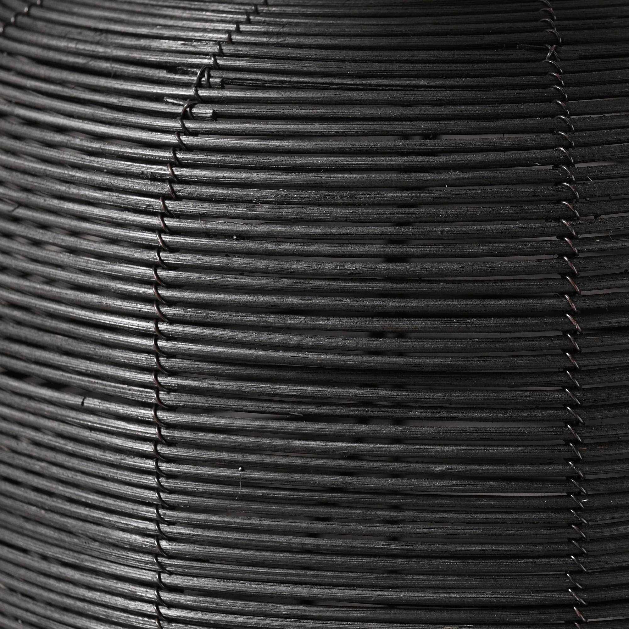 Textural rattan is wrapped around a steel frame. Paired with a drum shade. The shade is in a crisp chiffon white color and is made of 100% linen with polystyrene lining for durability. Rated for one 60W incandescent bulb; 9W LED bulb, 13W fluorescent (CFL) bulb, or 9W self-ballasted LED bulb. E26-base bulb. Includes a 6 ft. cord.