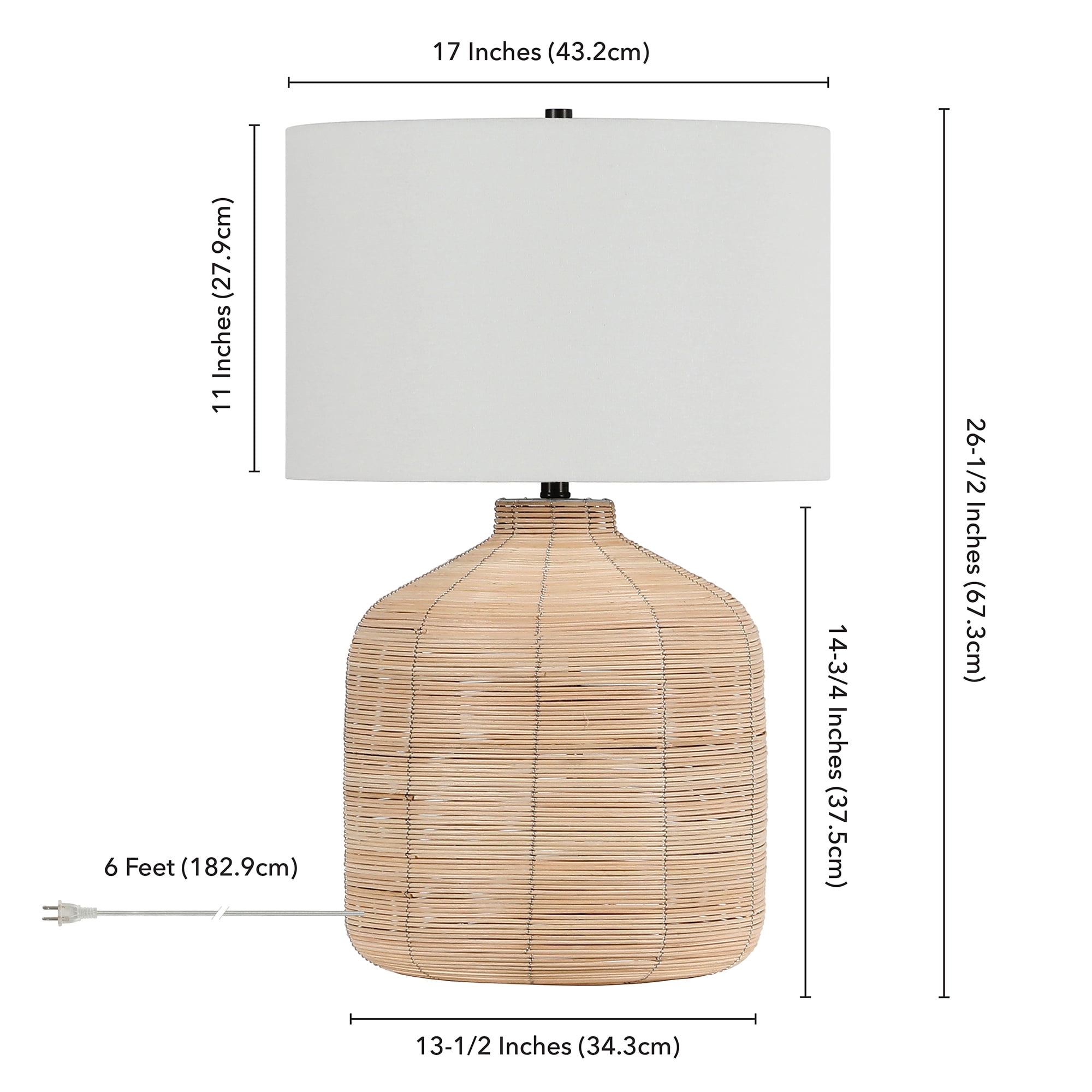 Add natural texture and warmth to any room with this handcrafted rattan table lamp. Bring a touch of beachy flair to your coastal cottage décor or use it as an organic counterpoint to a modern room. Light and airy natural rattan is offset with brass accents and finished with a crisp drum shade to keep this boho-chic piece fresh and polished. Features: Textural rattan is wrapped around a steel frame. Paired with a drum shade. The shade is in a crisp chiffon white color and is made of 100% linen with polystyrene lining for durability. Rated for one 60W incandescent bulb; 9W LED bulb, 13W fluorescent (CFL) bulb, or 9W self-ballasted LED bulb. E26-base bulb. Includes a 6 ft. cord. Specifications: Product Weight: 3.75 lbs Target Audience: Adult (18 Years and Up) Assembly details: Adult Assembly Required, Tools Not Provided Warranty Description: 10 Day Limited Warranty