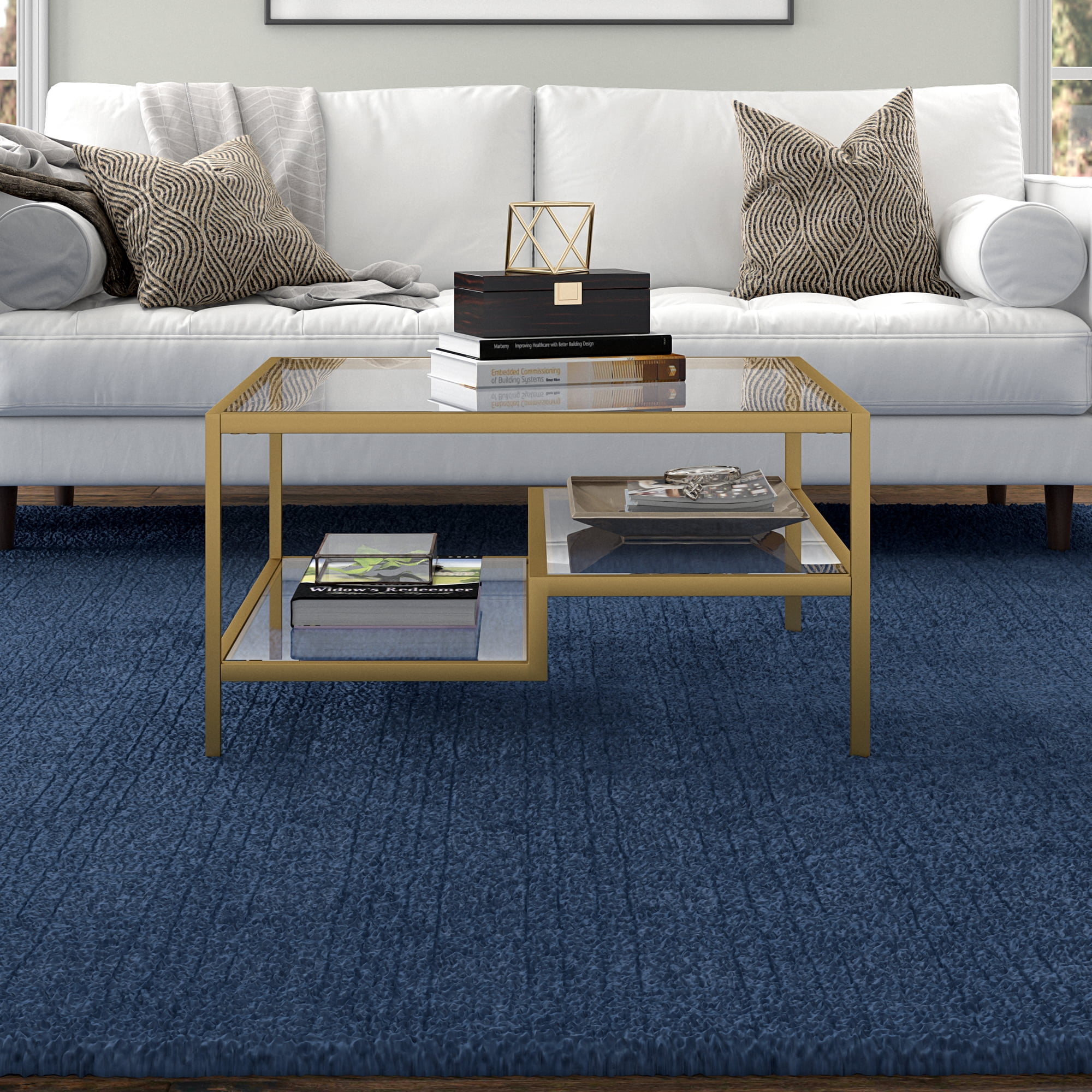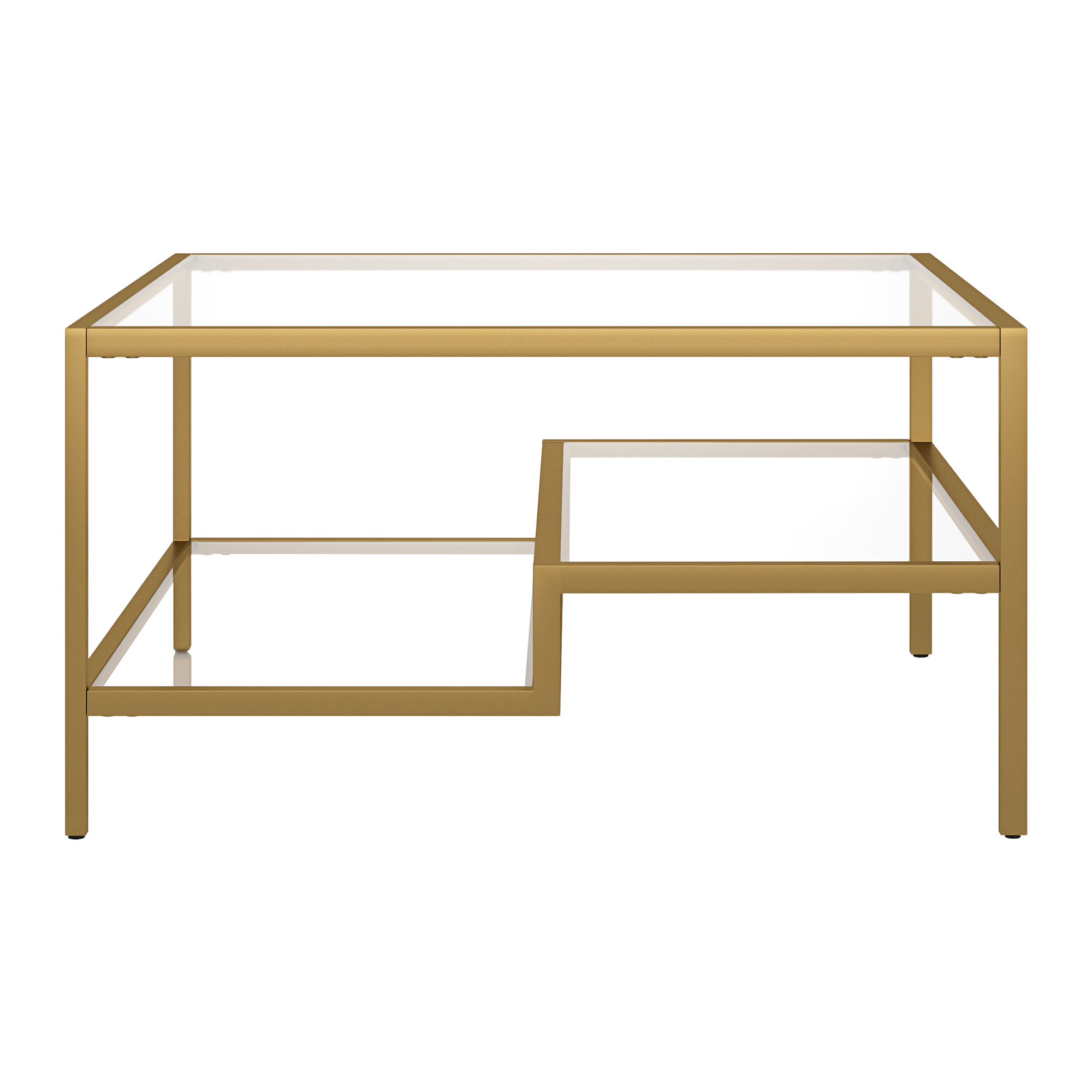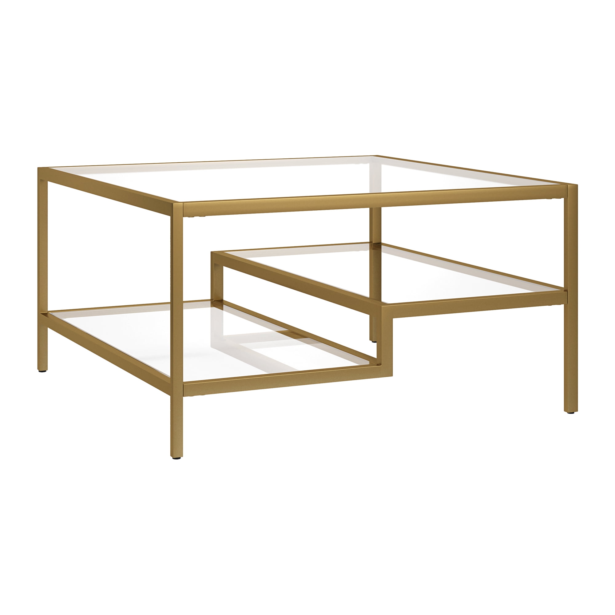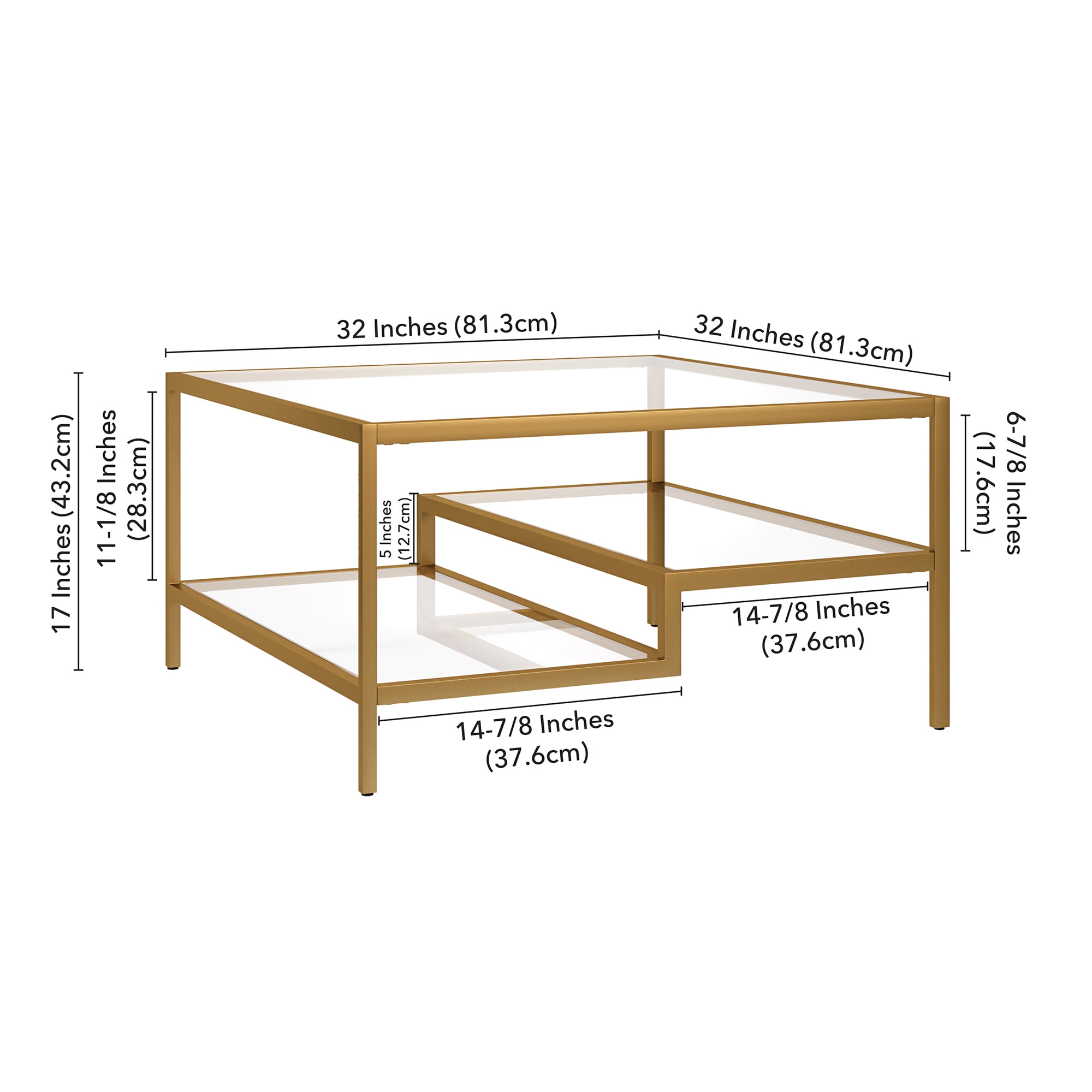 This contemporary coffee table is the perfect addition to your modern or glam living room ensemble. A lustrous metallic frame borders the tempered glass tabletop and two-tiered shelves. Balanced on four sleek legs, its minimalist silhouette blends seamlessly with your existing décor scheme. Features: Handcrafted finish is applied to the steel frame Tabletop and shelving are made of durable tempered glass Features staggered lower shelving Tabletop had a weight capacity of 50 lbs; lower shelf can hold 20 lbs Features easy assembly. Clean with a soft, dry cloth; no harsh chemicals or abrasive cleaning materials. Specifications: Product Dimensions: 32W x 32D x 17H Product Weight: 57.5 lbs