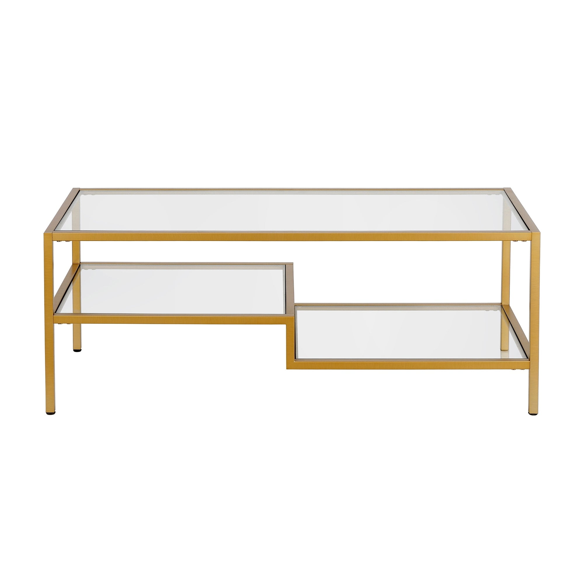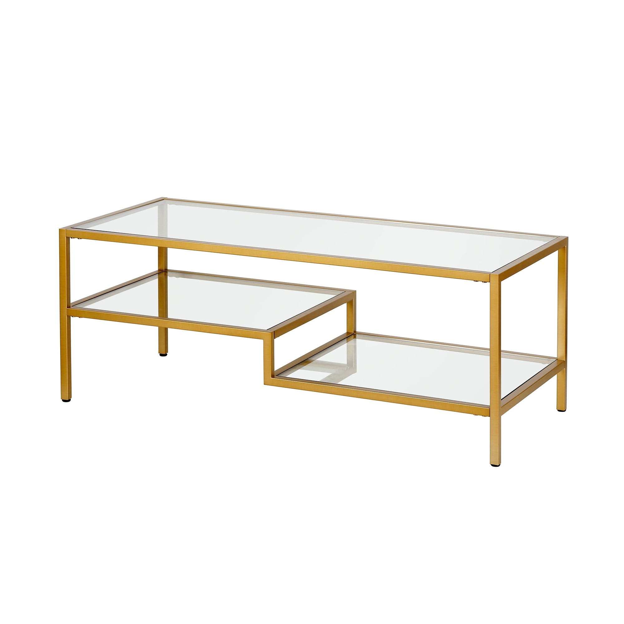 This contemporary coffee table is the perfect addition to your living room ensemble. A golden brass metal frame borders the glass table top and two-tiered shelves. Balanced on four legs, the table can hold a weight capacity of 50 LBS. Features: Hand crafted antique brass finish is applied to the steel frame. Clean with a soft, dry cloth; no harsh chemicals or abrasive cleaning materials. Features easy assembly. Weight capacity can support up to 50 LBS. Premium materials have been used in the making of this product Specifications: Product Weight: 53.3 lbs Frame Material: Metal
