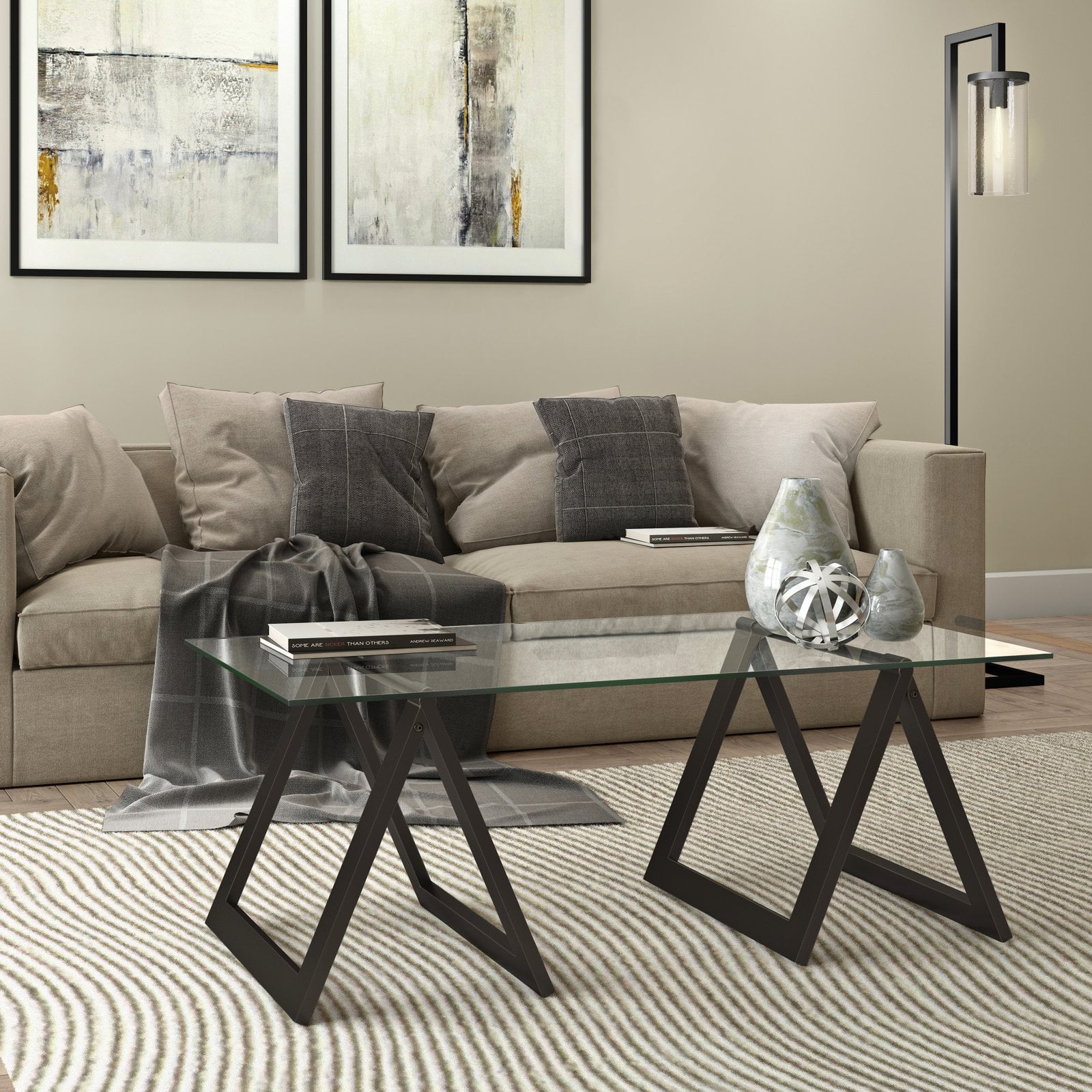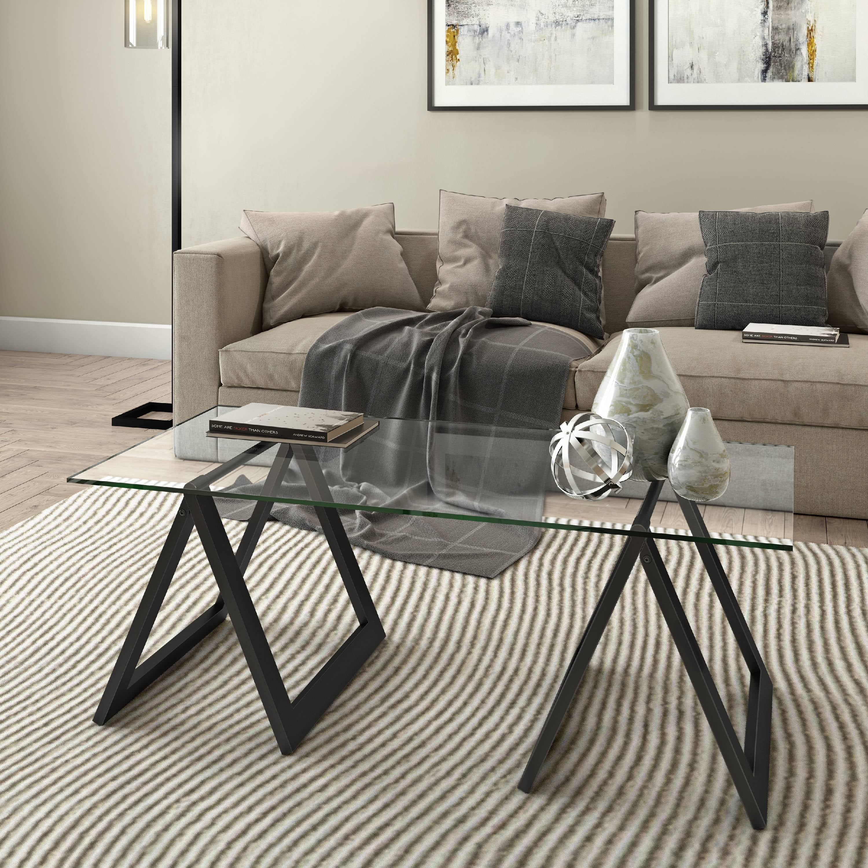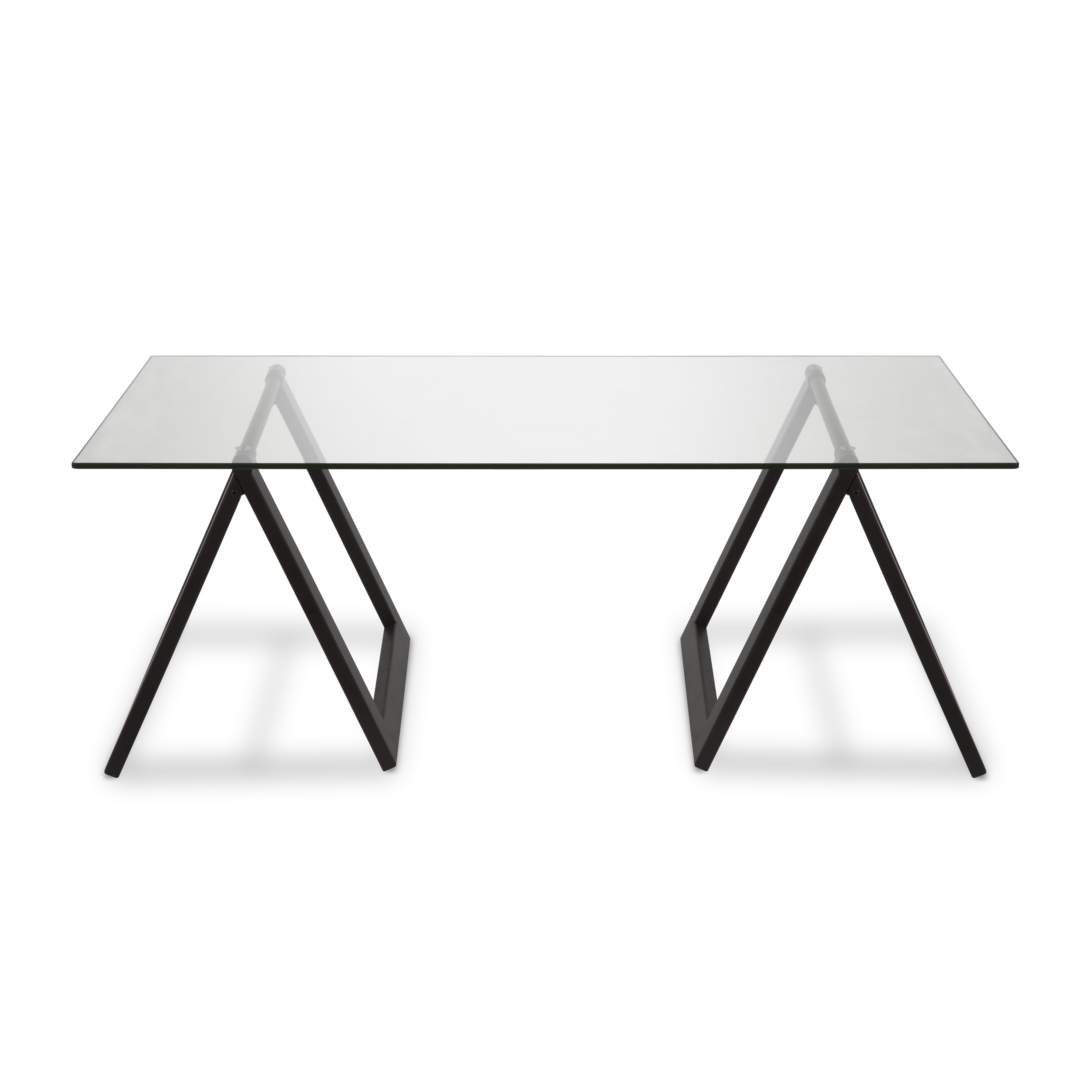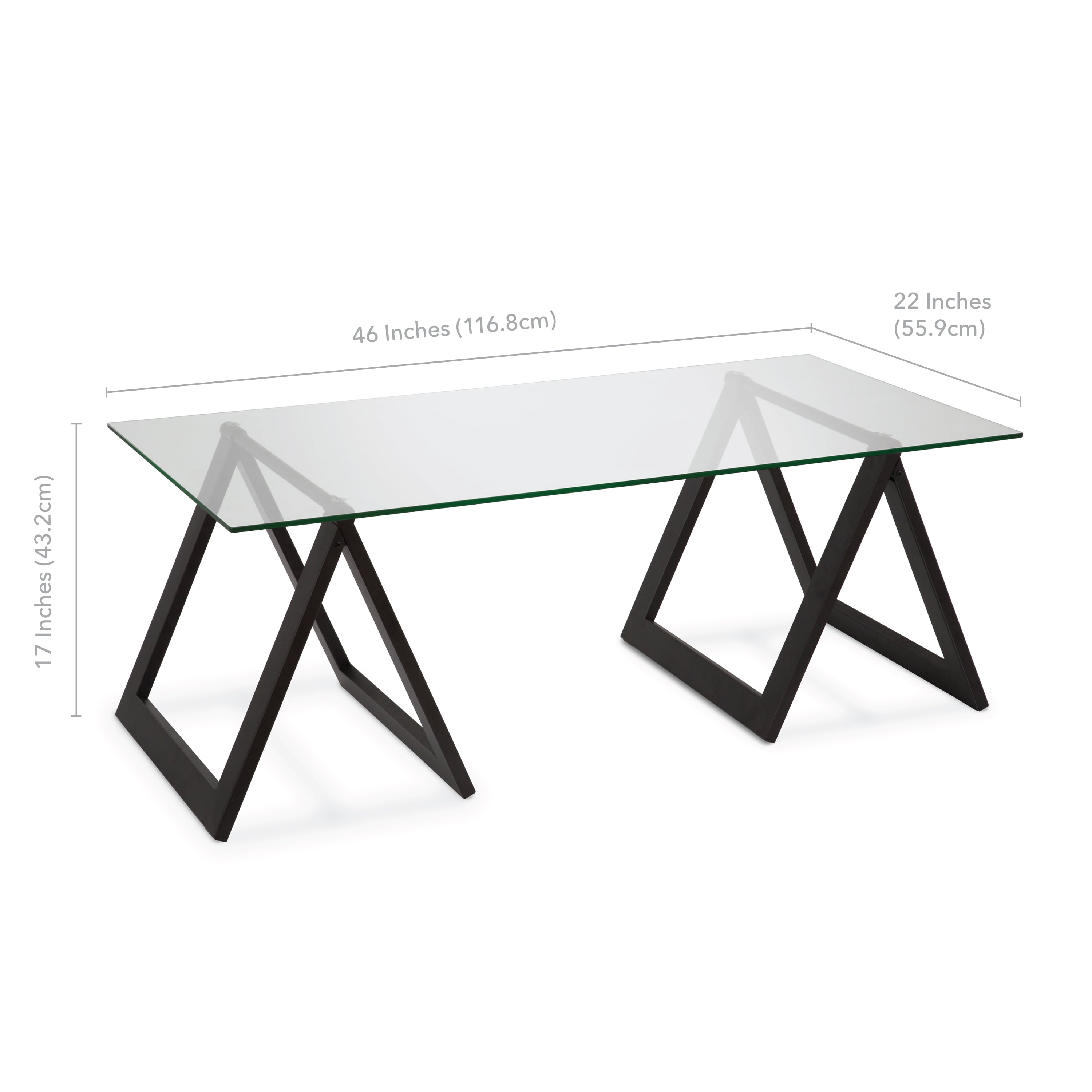 Dimensions: 46W x 22D x 17H in. Metal sawhorse-style legs Rectangular clear glass top Your choice of available finish options Minimalist modern profile