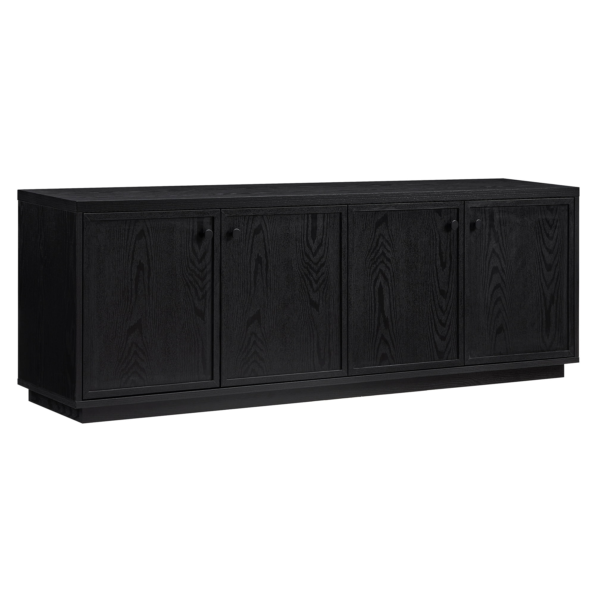Combine functionality and classic transitional design with this modern TV stand. Its rich wood tone creates a warm neutral palette that will blend seamlessly into any color scheme, while its minalist shaker styling pairs perfectly with the existing design inspiration of your living room, den, or game room. This solid-backed stand features two large enclosed cabinets with black pull knobs on a sturdy plinth-style base. Cable management cut-outs and adjustable inner shelves help keep your media storage and consoles organized, and adjustable leveling feet and door hinges ensure everything sits just right. Features: A transitional design accommodates TVs up to 75″ for your entertaining space. Constructed of sturdy MDF materials in a handcrafted black grain finish. Features four doors with enclosed cabinets and 4 shelves for ample storage. The top has a weight capacity of 75 lbs. Middle shelves can support 20 lbs; lower shelves can hold 50 lbs. Clean with a soft, dry cloth; no harsh chemicals or abrasive cleaning materials. Features easy assembly. Specifications: Product Dimensions: 69.63″W x 15.5″D x 24″H Product Weight: 91.7 lbs Color/Finish: Black Grain