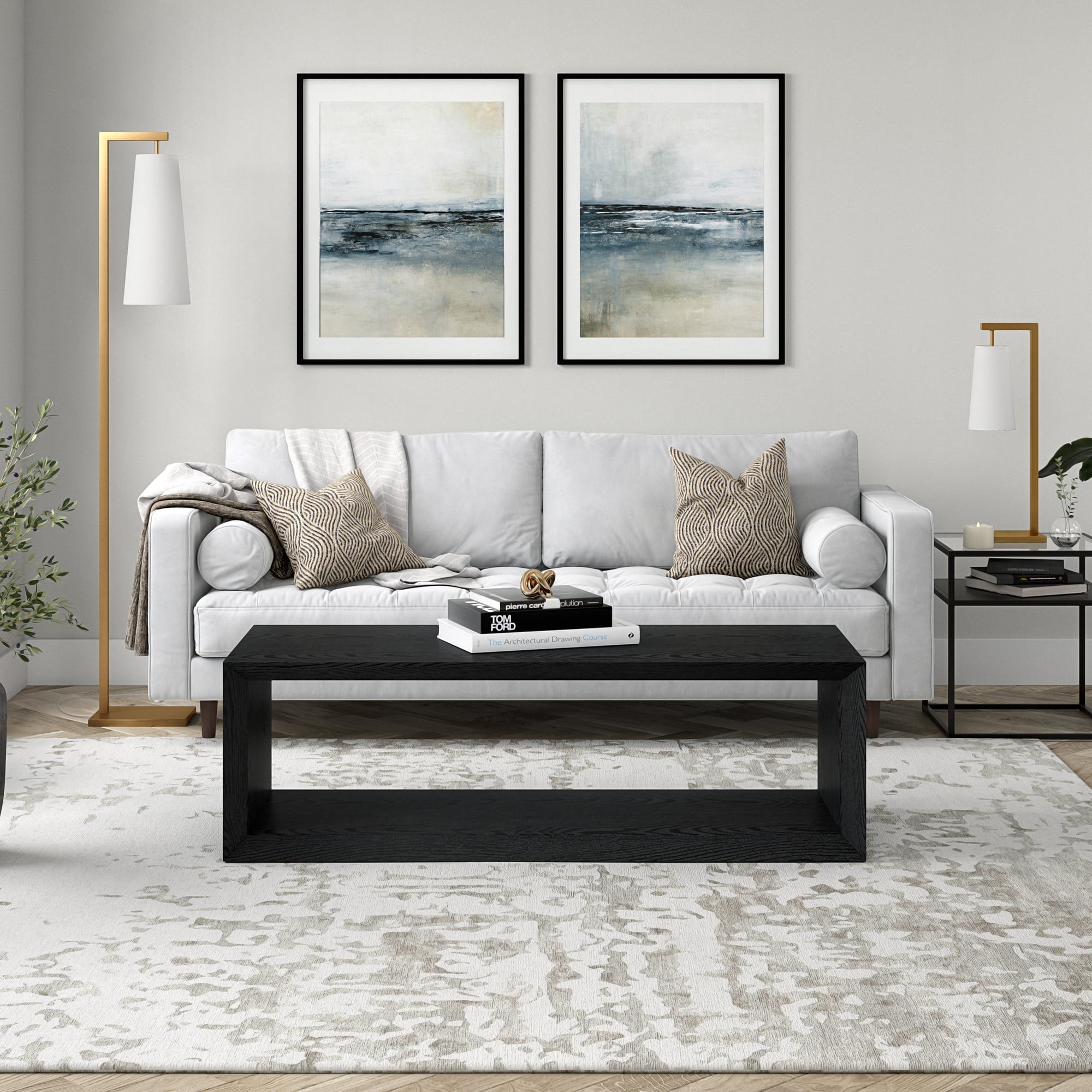 Striking in its simplicity, this modern coffee table emphasizes clean lines and straightforward design. The table’s seamless design is given extra dimension with the beveled banding around the edges. The solid base anchors the look, while the natural wood-look finish adds texture and tonal variation to your space. With an assembly time under 10 minutes, this is the perfect piece to effortlessly update your living room, family room, or office.