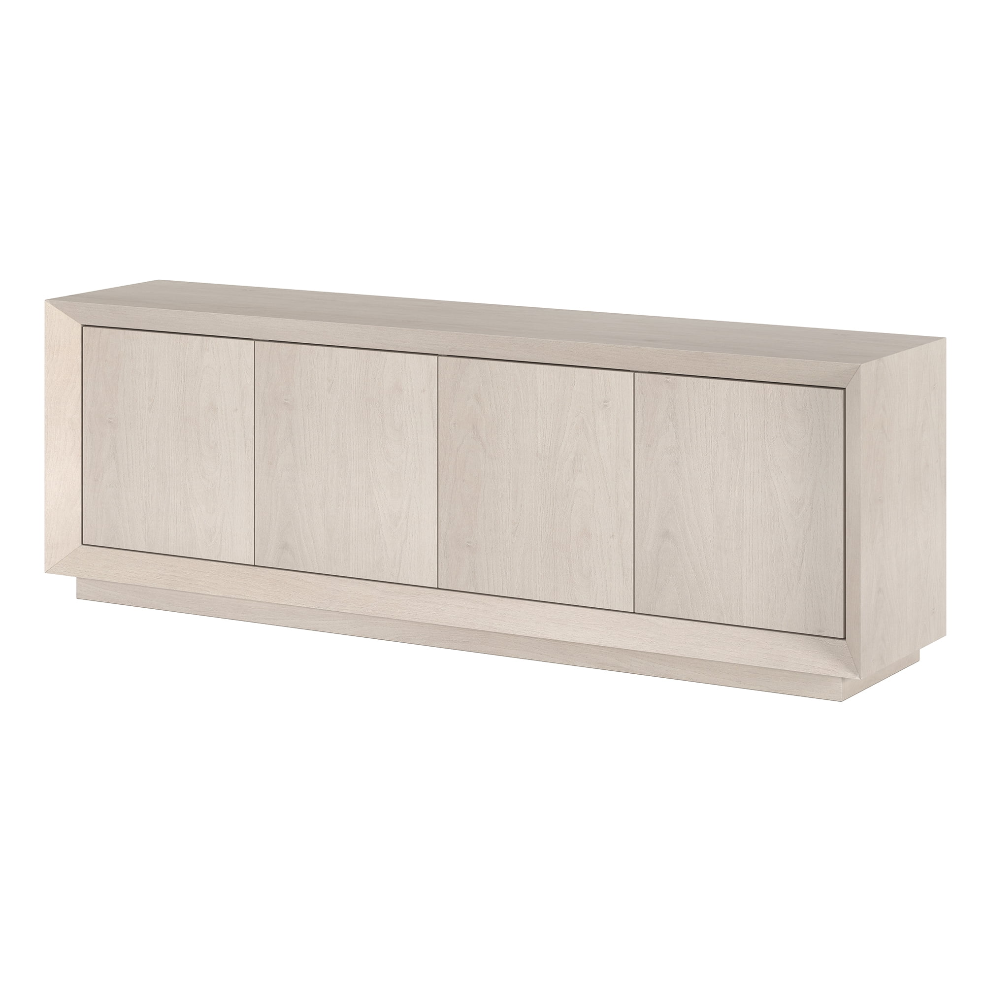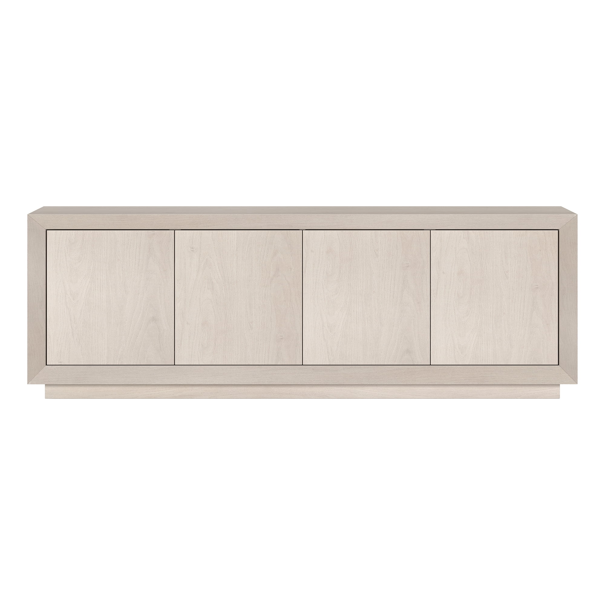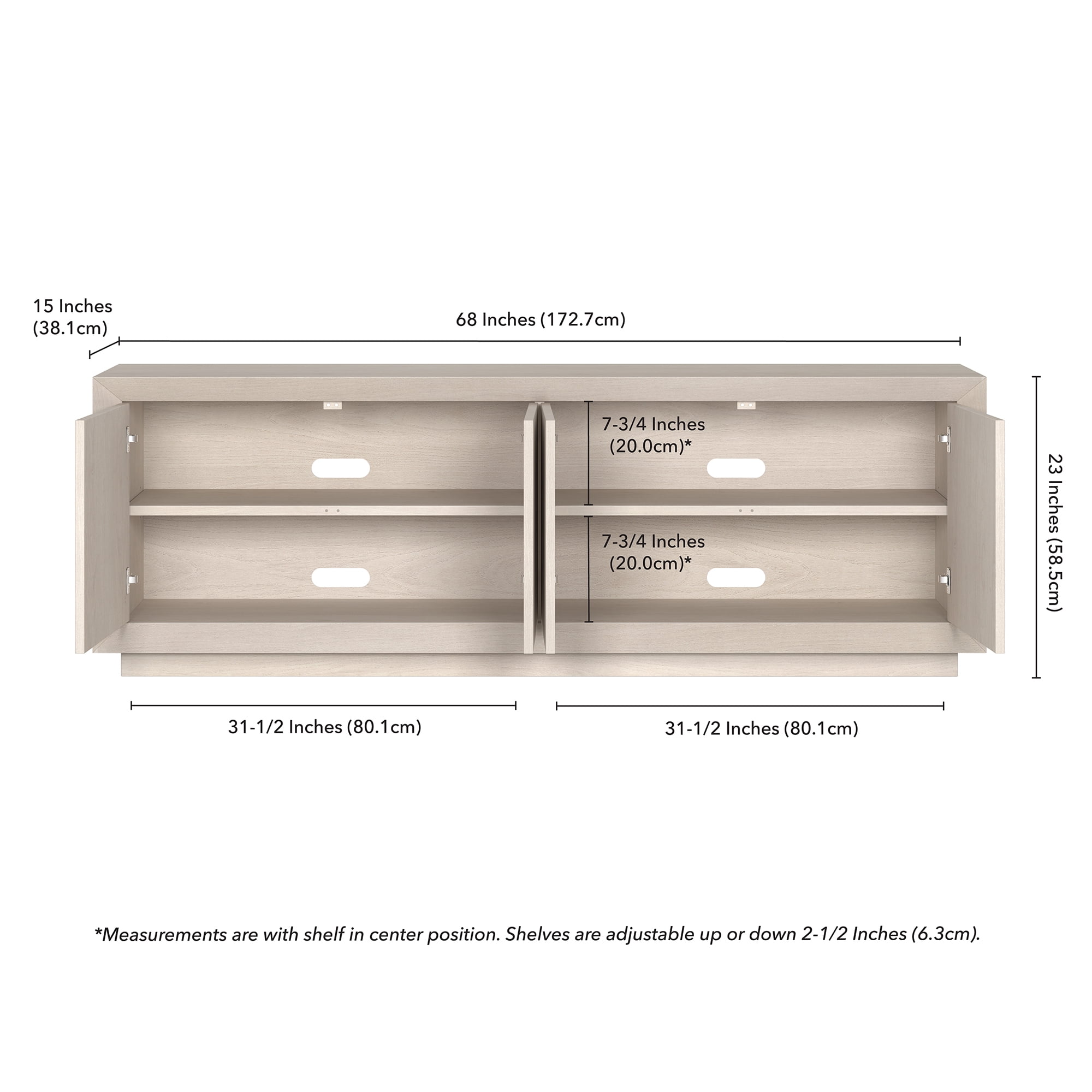 A transitional design accommodates TVs up to 75″ for your entertaining space. Constructed of sturdy MDF materials in an alder white finish. Features four doors with enclosed cabinets and 4 shelves for ample storage. The top has a weight capacity of 75 lbs. Lower shelves can hold 20 lbs. each. Clean with a soft, dry cloth; no harsh chemicals or abrasive cleaning materials. Features easy assembly.