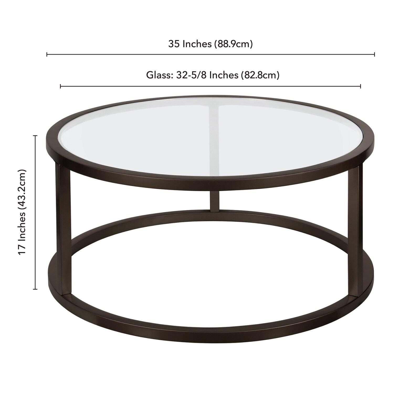 Dimensions: 35 diam. x 17H in. Steel frame in blackened bronze finish Tempered glass table top Assembly required