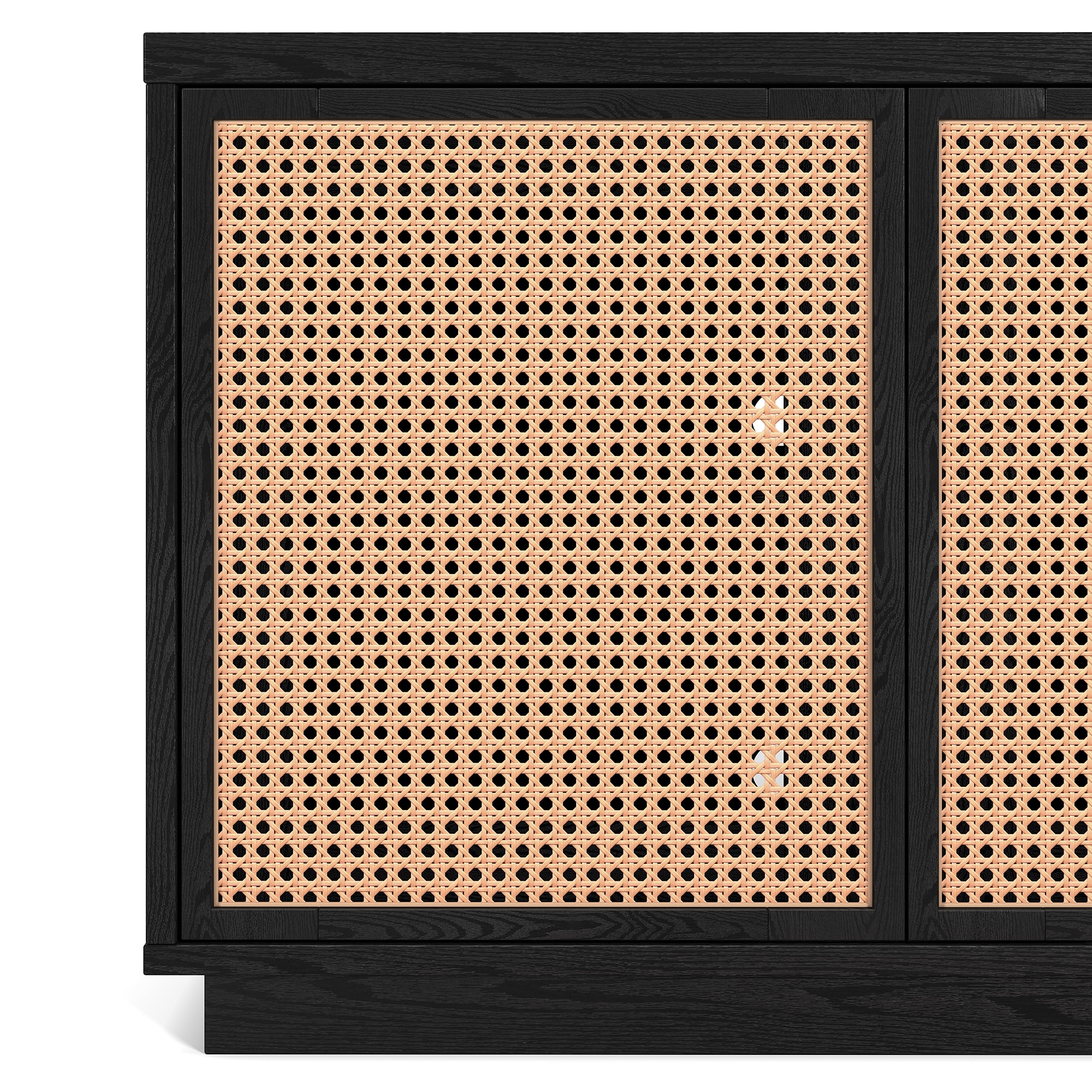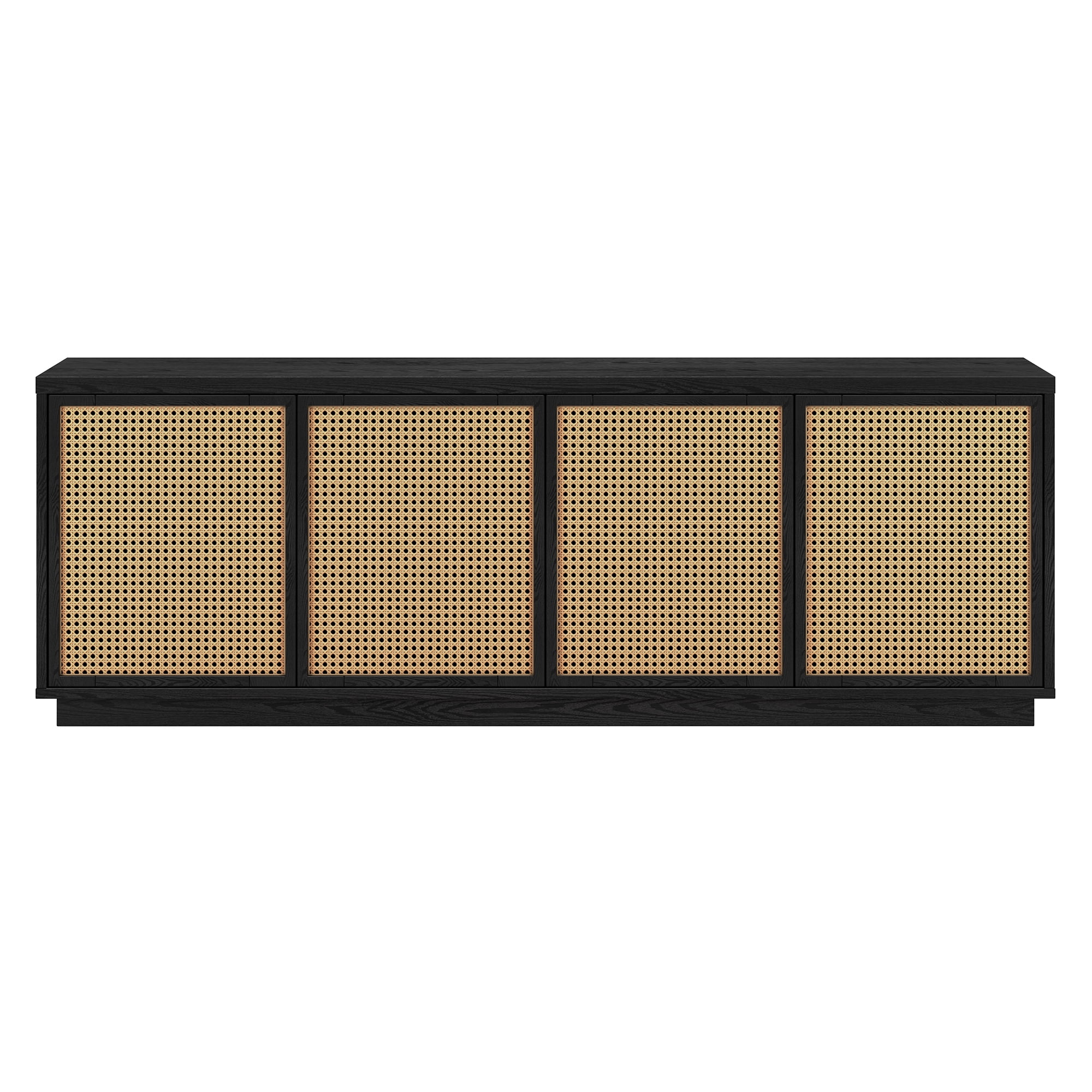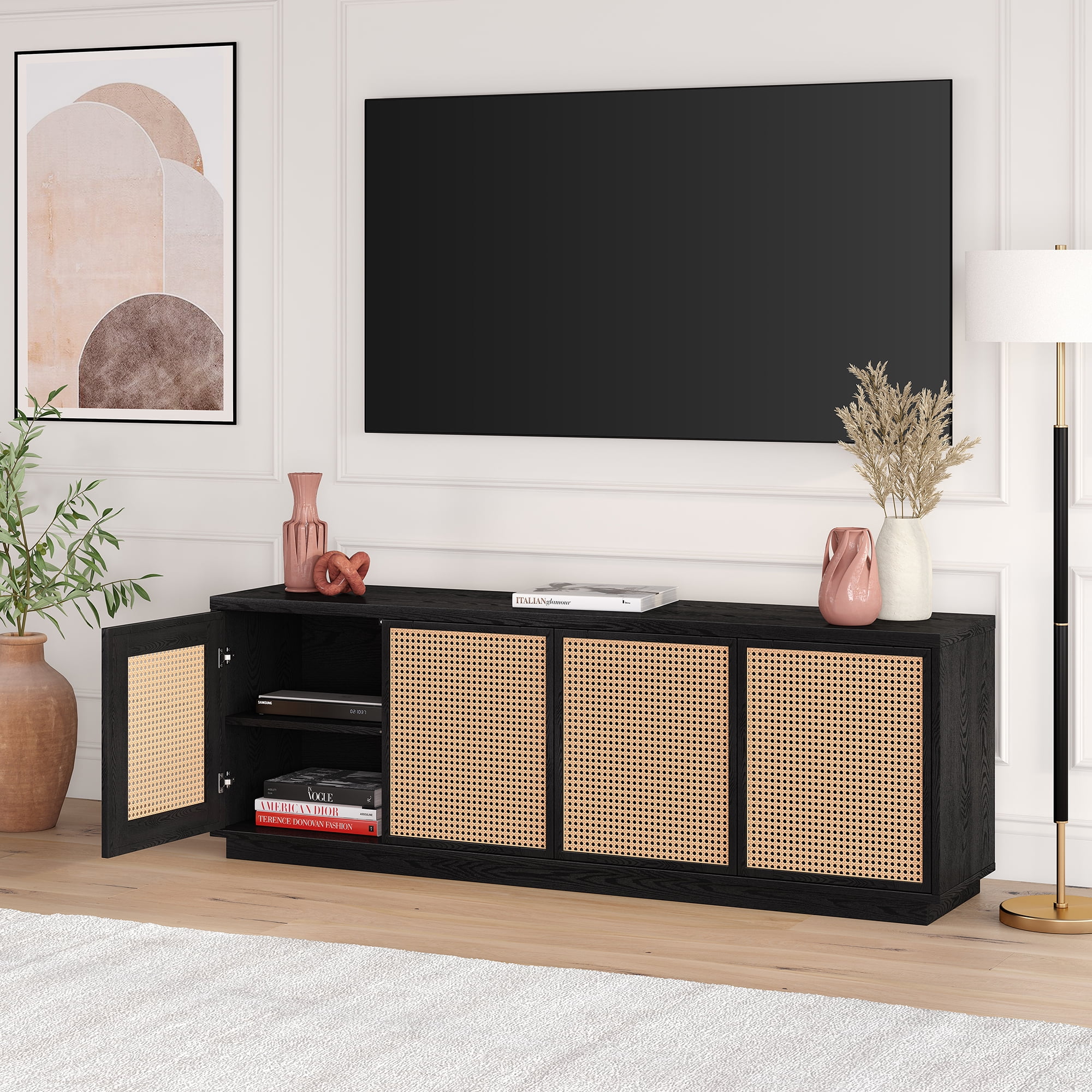 A mid-century design accommodates TVs up to 78″ for your entertaining space. Constructed of sturdy MDF and faux rattan in a handcrafted black grain finish. Features four faux caned, two-toned doors with enclosed cabinets and 4 shelves for ample storage. The top has a weight capacity of 75 lbs. Middle shelf supports 25 lbs and bottom shelf can hold 50 lbs. Clean with a soft, dry cloth; no harsh chemicals or abrasive cleaning materials. Features easy assembly.
