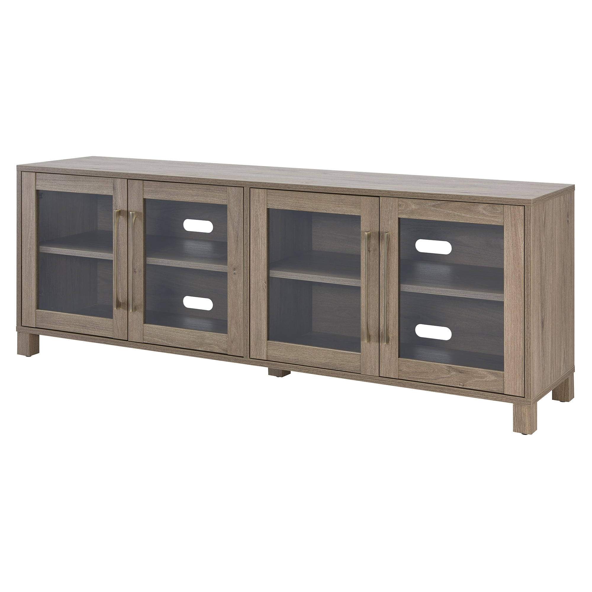 Combine functionality and on-trend design with this classic TV stand. Its rich wood tone creates a warm neutral palette that will blend seamlessly into any color scheme, while its classic styling pairs perfectly with the existing design inspiration of your living room, den, or game room. This solid-backed stand features two enclosed cabinets behind swing-out glass doors as well as cable management cut-outs to keep all your media wiring neatly organized.