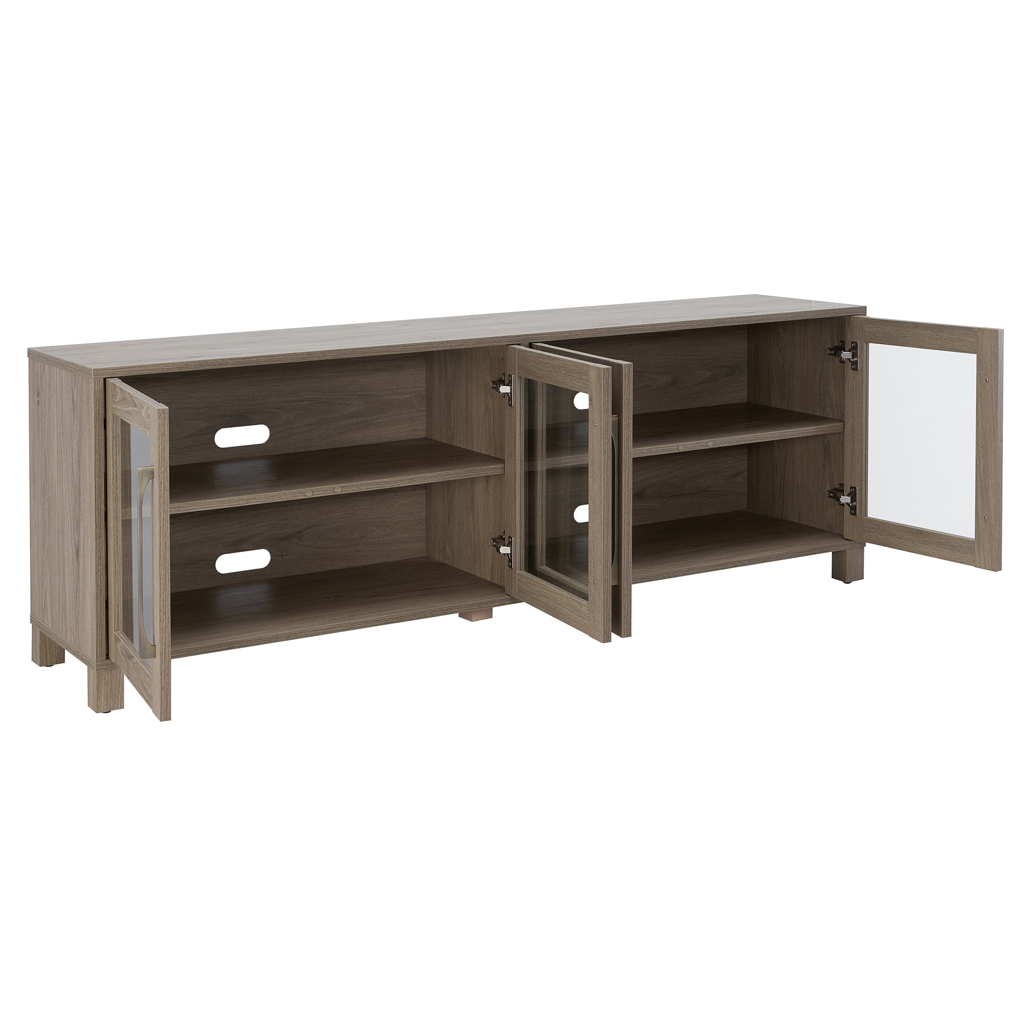 Measures 68W x 15D x 24H in. A traditional design accommodates TVs up to 75 in. for your entertaining space Constructed of sturdy MDF and glass materials in a handcrafted White finish. Features four doors with enclosed cabinets and 6 shelves for ample storage. The top has a weight capacity of 75lbs. Lower shelves can hold 25lbs. each. Clean with a soft, dry cloth; no harsh chemicals or abrasive cleaning materials. Features easy