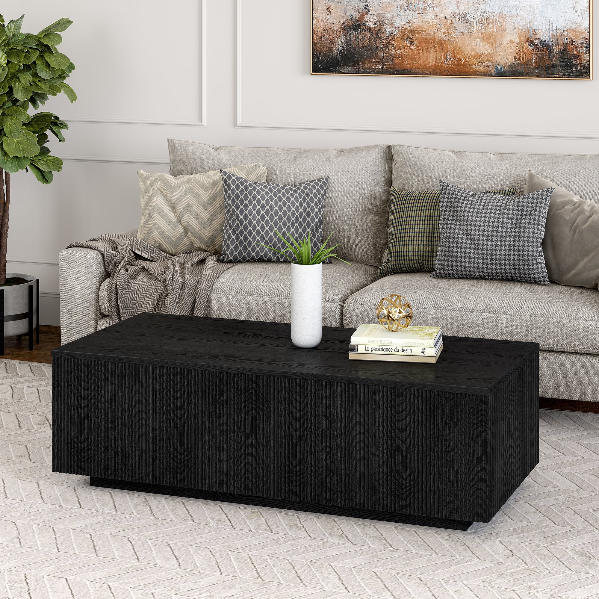 Striking in its simplicity, this modern coffee table emphasizes clean lines and a straightforward aesthetic. The table’s simple design is given extra dimension with mitered corners and a plinth base. A natural wood-look finish and ribbed base adds texture and tonal variation to your space. Easy to assemble and easy to style, it’s the perfect pick for a quick update to your living room, family room, or office. Features: A modern contemporary design for your living room, den, and more. Finished in wood-look black grain. Table is made of high-quality MDF and PVC materials Tabletop features a weight capacity of 75 lbs. Features easy assembly. Clean with a soft, dry cloth; no harsh chemicals or abrasive cleaning materials. Specifications: Product Dimensions: 47.5″W x 22″D x 15″H Product Weight: 32 lbs Color/Finish: Black Grain