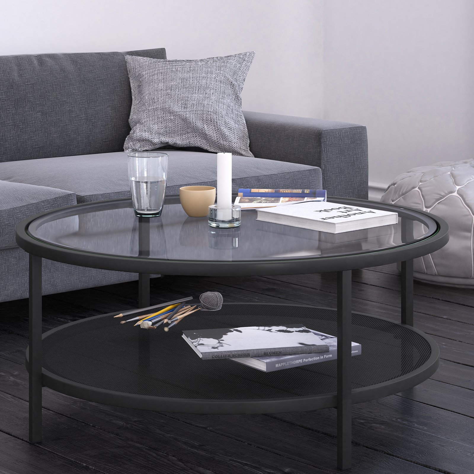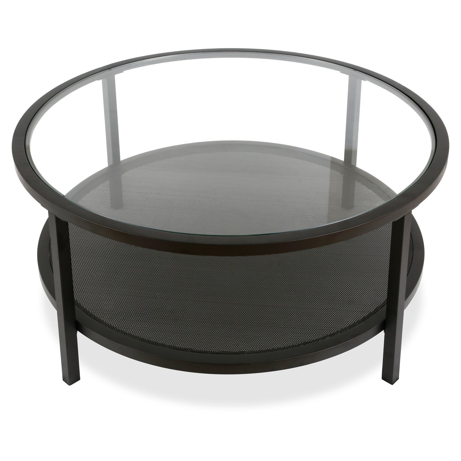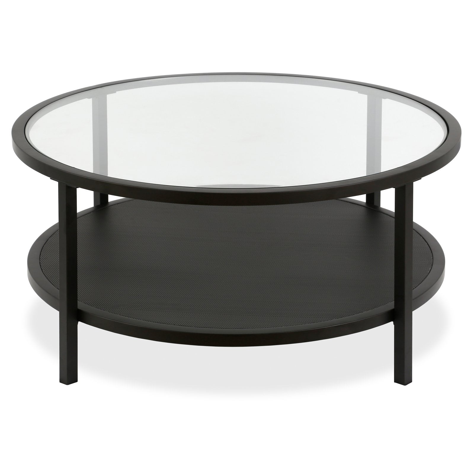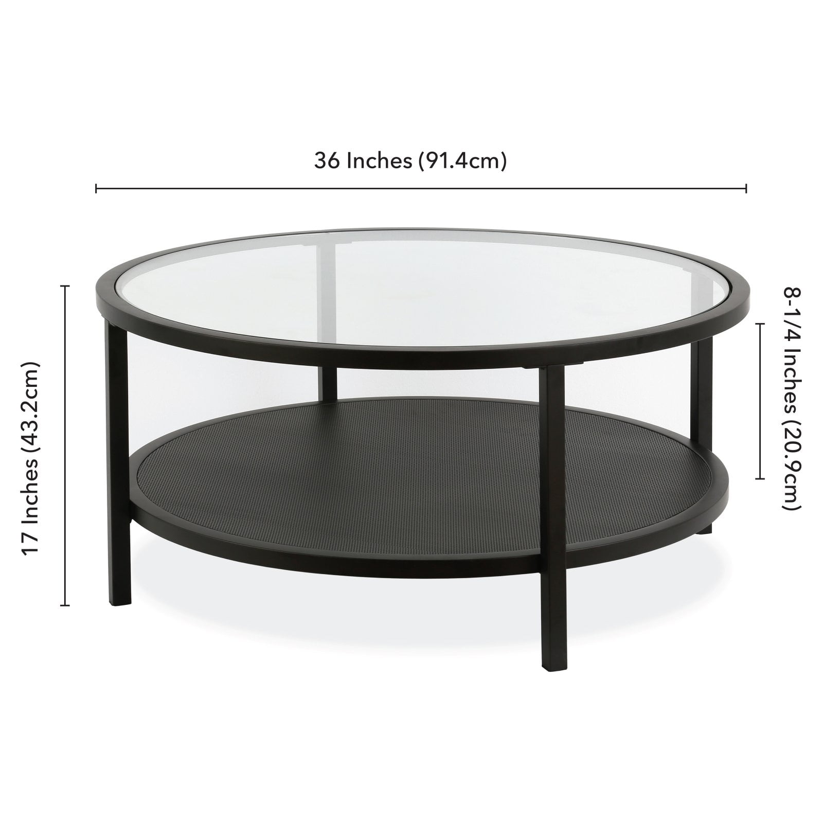 Dimensions: 36 diam. x 17H in. Frame built from robust steel Round clear glass top Finished in black Lower shelf space offers storage and display space Minimalist modern design
