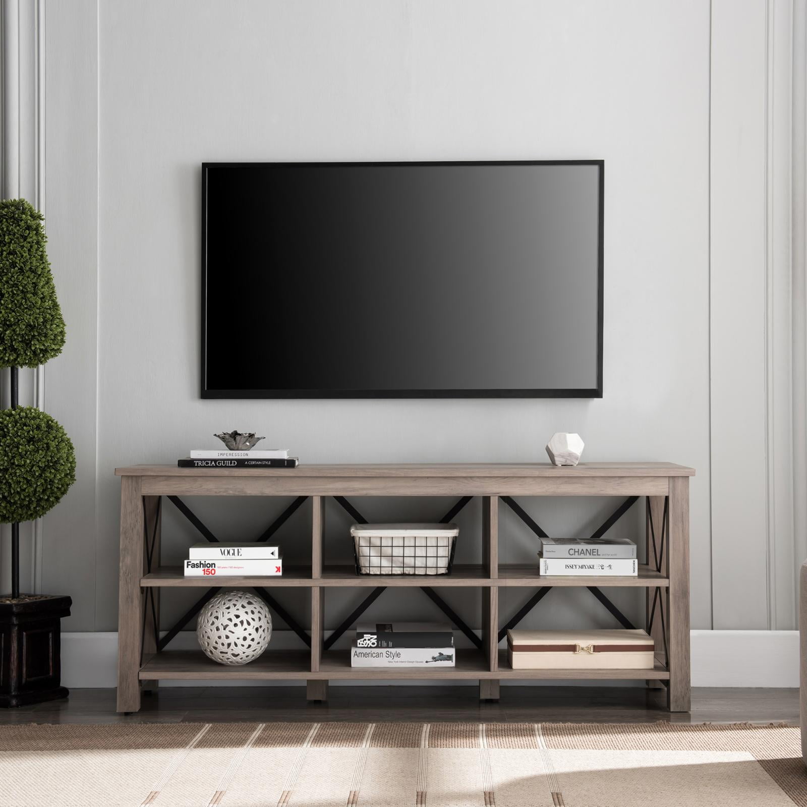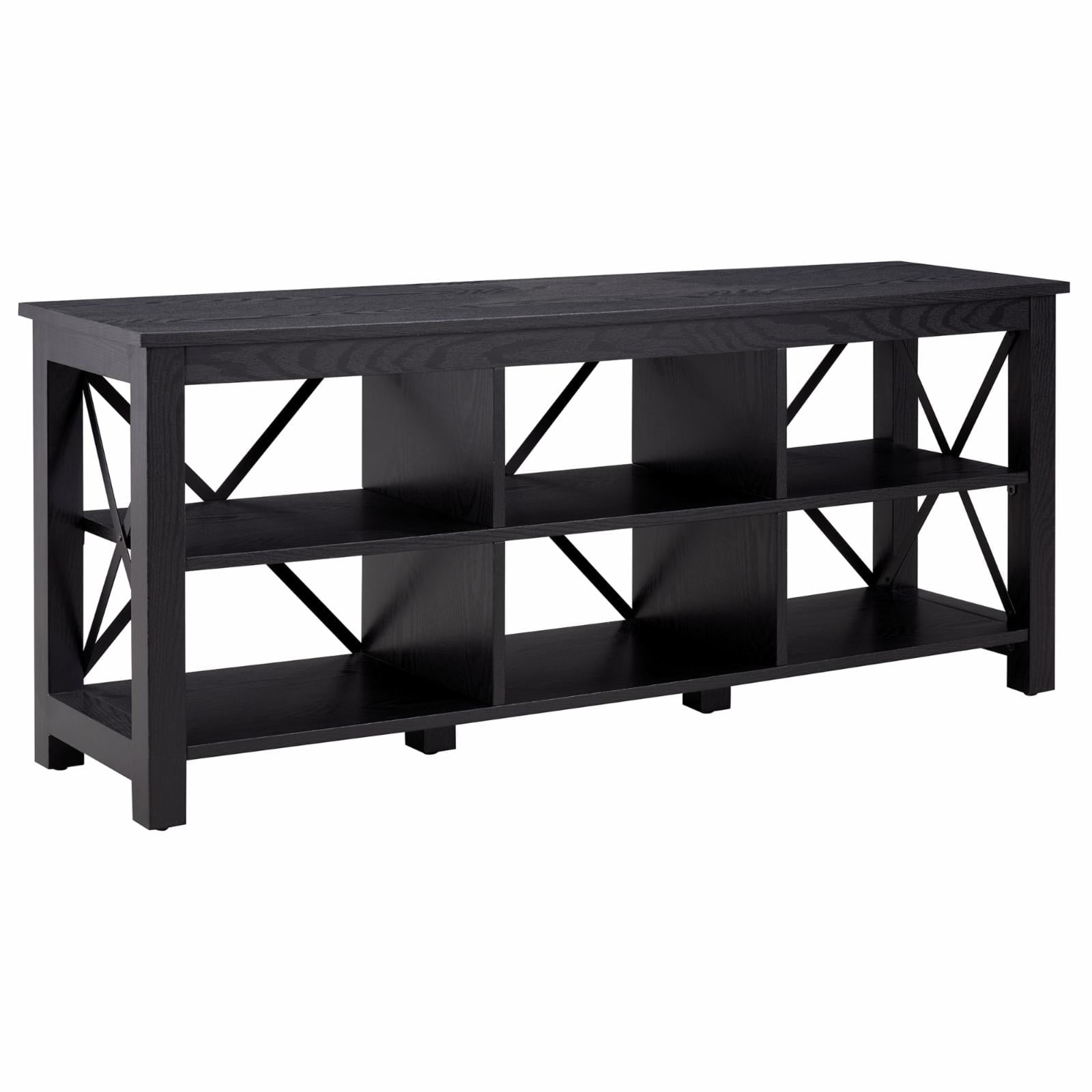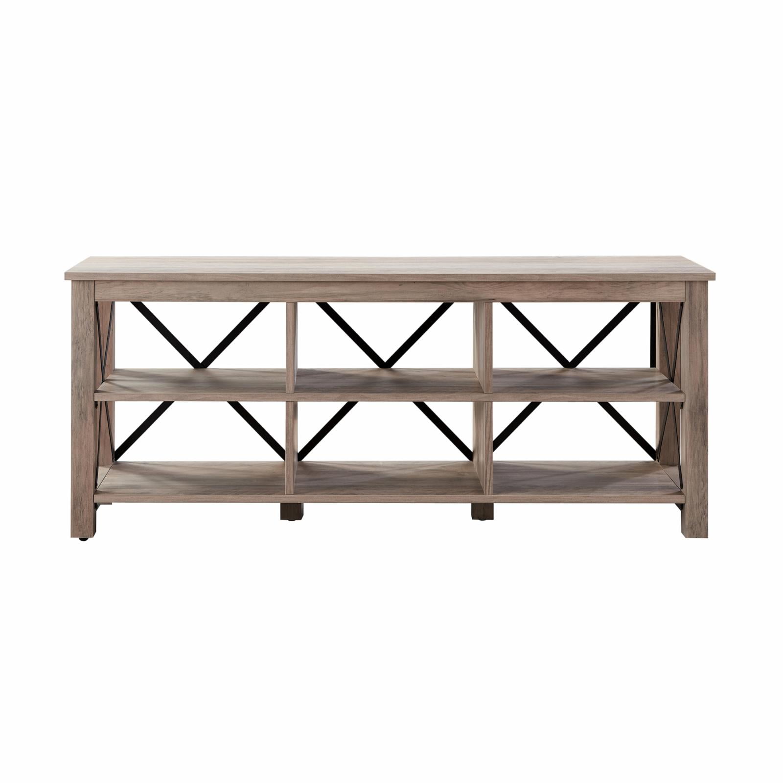 Strong geometric lines set this modern farmhouse-inspired TV stand apart. Its X-shaped black metal accents offset the rich wood tone, creating a warm neutral color palette that will blend seamlessly into any design scheme. A must-have for living areas and entertainment spaces, this TV stand sets the stage for the big game, a movie marathon, or that season finale everyone’s been talking about.