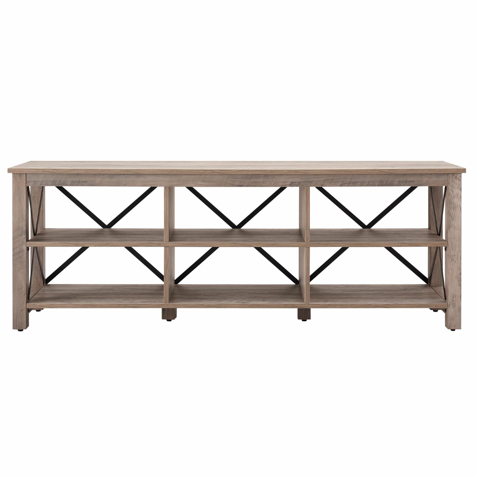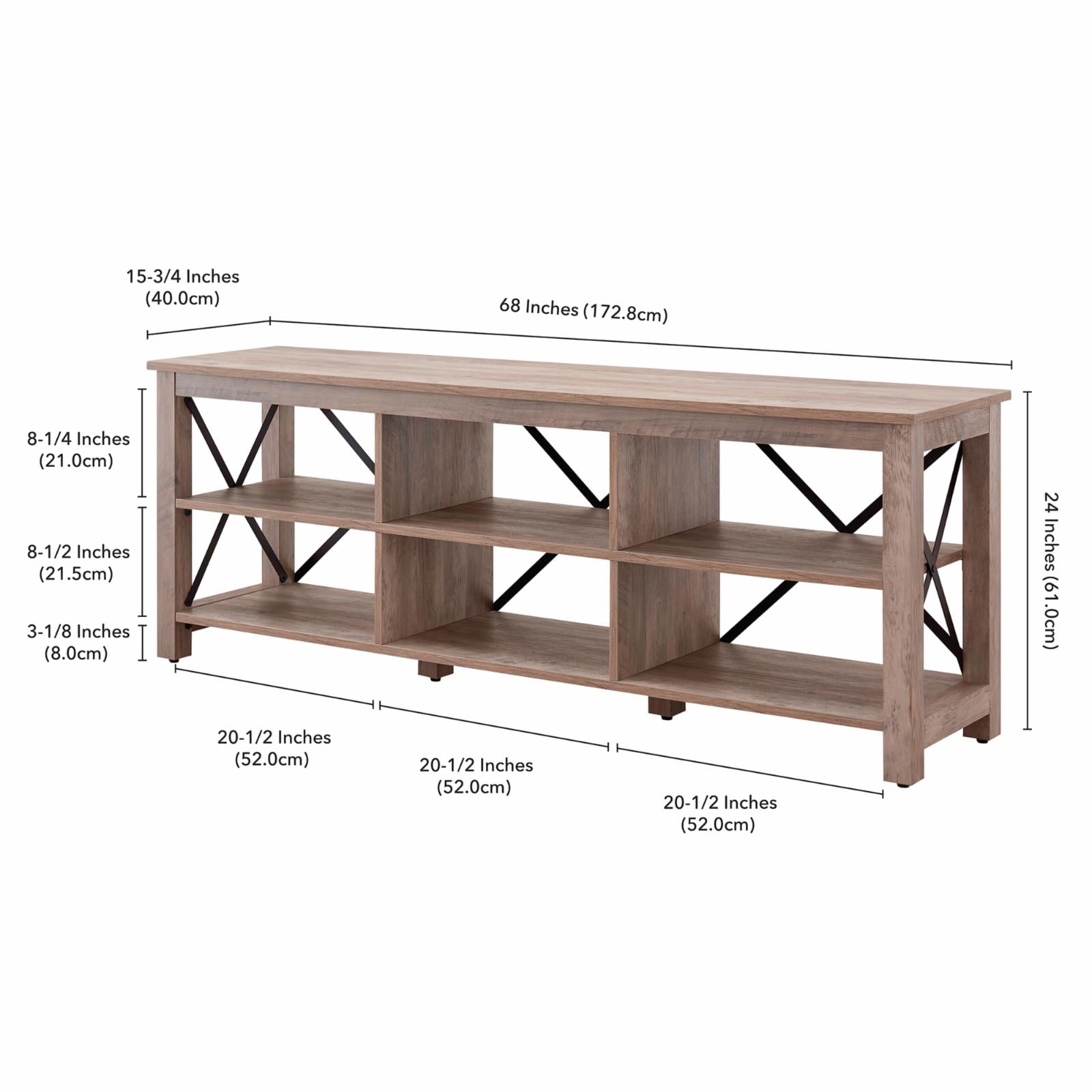 Measures 68W x 15D x 24H in. A modern contemporary design accommodates TVs up to 80 in. for your entertaining space Constructed of sturdy MDF and metal materials in a handcrafted Gray Oak finish. Features 6 shelves for ample storage. The top has a weight capacity of 75lbs. Lower shelves can hold 25lbs. each. Clean with a soft, dry cloth; no harsh chemicals or abrasive cleaning materials. Features easy assembly.