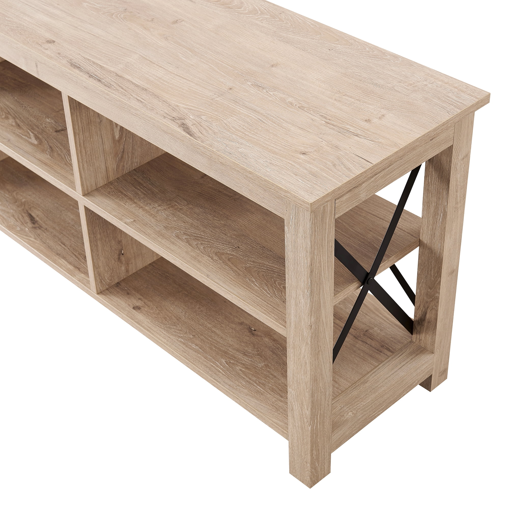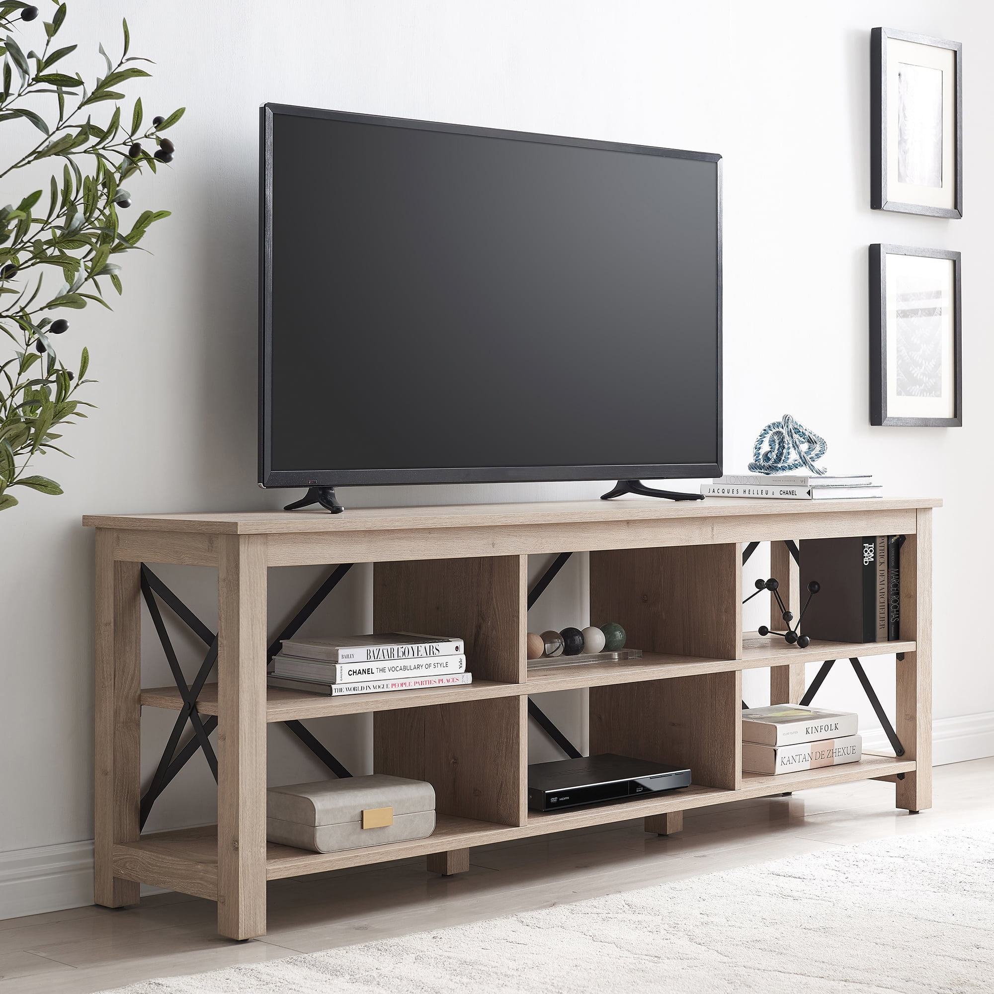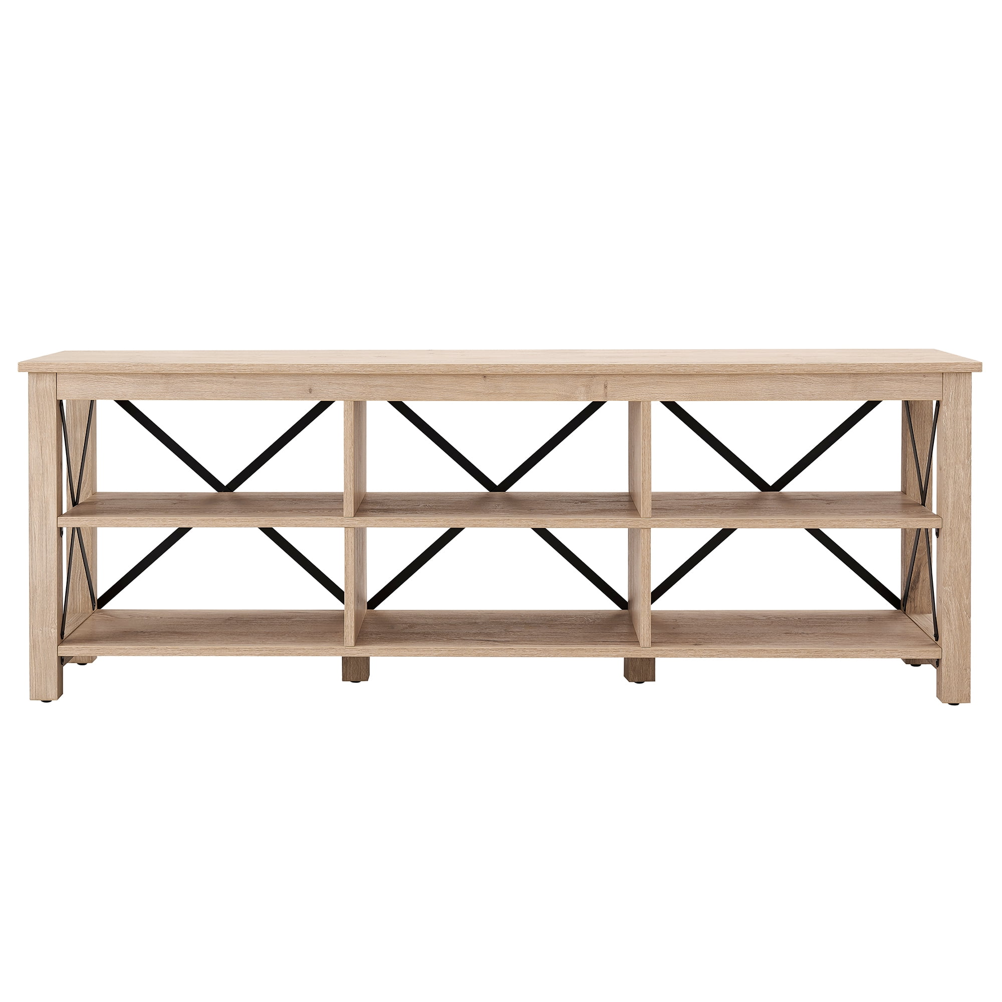 Strong geometric lines set this modern farmhouse-inspired TV stand apart. Its X-shaped black metal accents offset the rich wood tone, creating a warm neutral color palette that will blend seamlessly into any design scheme. A must-have for living areas and entertainment spaces, this TV stand sets the stage for the big game, a movie marathon, or that season finale everyone’s been talking about.