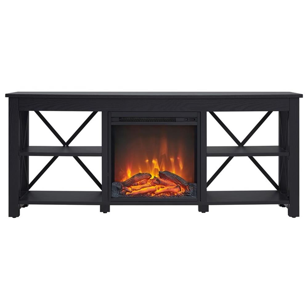 Strong geometric lines and an inset electric fireplace set this modern farmhouse-inspired TV stand apart. Its X-shaped black metal accents offset the rich wood tone, creating a warm neutral color palette that will blend seamlessly into any design scheme. Stay warm and cozy while you take in the big game, a movie marathon, or that season finale everyone’s been talking about. Features: Accommodates TVs up to 65″ Finished in black with black metal accents. Fireplace insert features 4777 BTUs (heat coverage for 400 sq. feet) and an automatic temperature cut-off for safety. The top has a weight capacity of 75 lbs. Lower shelves can hold 25 lbs. each. Features easy assembly. Specifications: Product Dimensions: 58″W x 15.75″D x 24″H Product Weight: 84.7 lbs