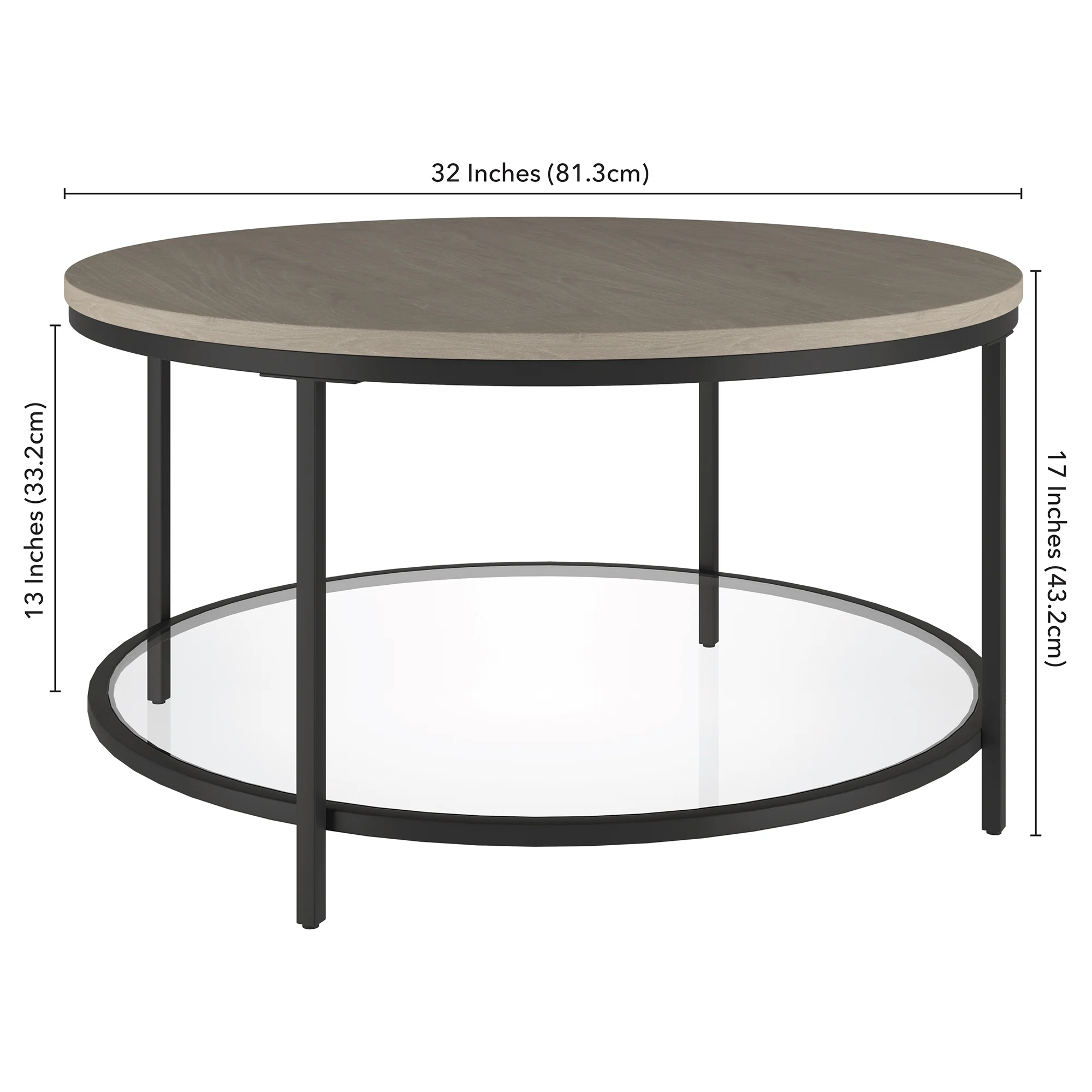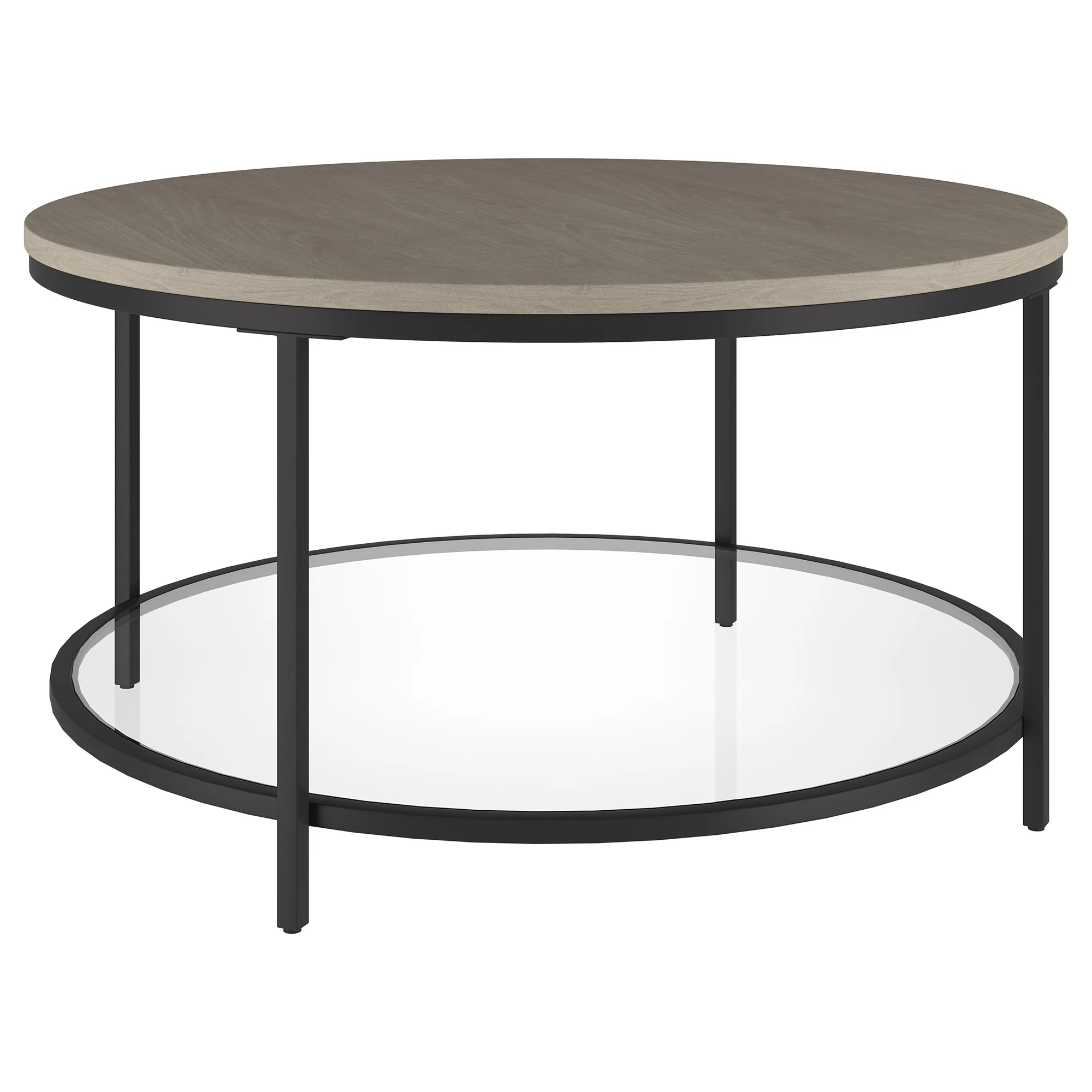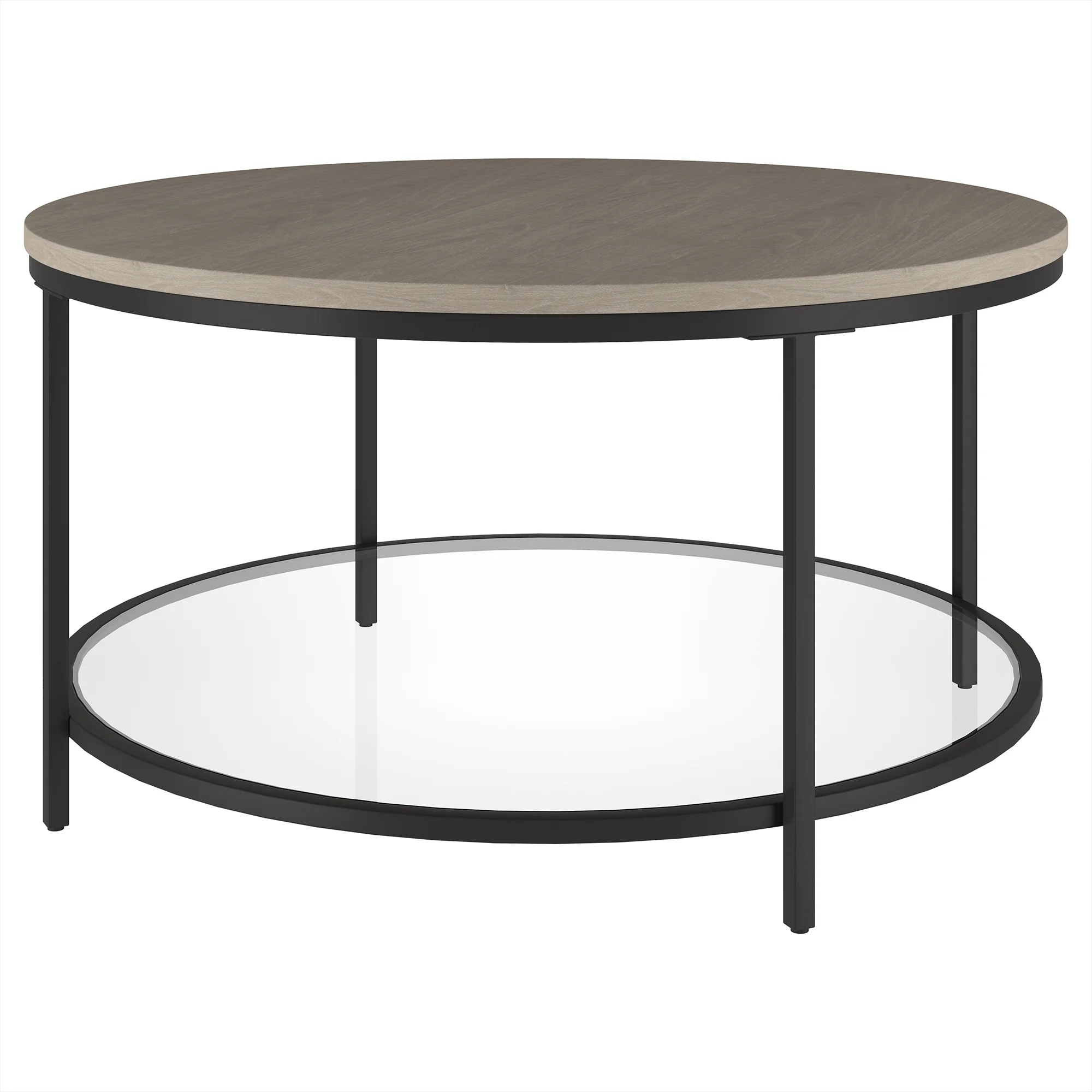 Evelyn&Zoe Sevilla Round MDF Coffee Table with Shelf, Antiqued Gray Oak Handcrafted finish applied to the steel frame for a unique touch Durable MDF tabletop in an antiqued gray oak finish enhances aesthetic appeal Lower shelf made of tempered glass provides additional storage space Tabletop weight capacity of 50 lbs; lower shelf can hold up to 30 lbs Easy assembly for quick setup in your living space