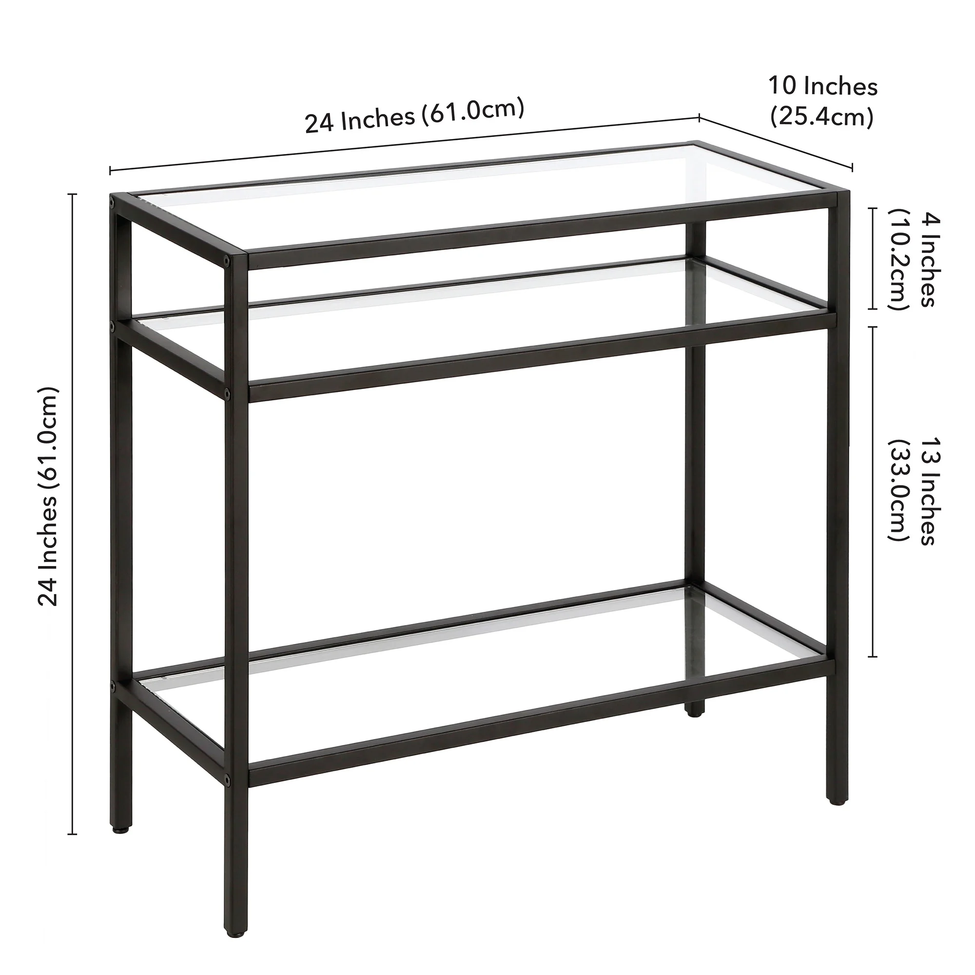 Hand crafted blackened bronze finish is applied to the steel frame. Tempered glass top and shelves Clean with a soft, dry cloth; no harsh chemicals or abrasive cleaning materials. Features easy assembly.