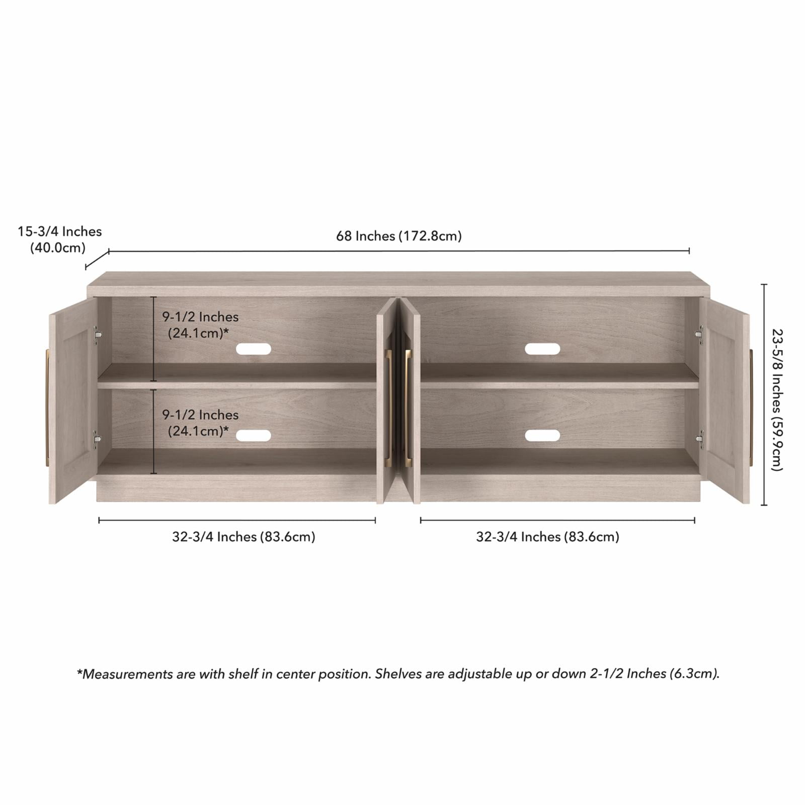 Dimensions: 68W x 15.75D x 23.63H in. Constructed of sturdy MDF Handcrafted alder white finish The top has a weight capacity of 75lbs. Lower shelves can hold 25lbs. each. Clean with a soft, dry cloth; no harsh chemicals or abrasive cleaning materials. Features easy assembly.