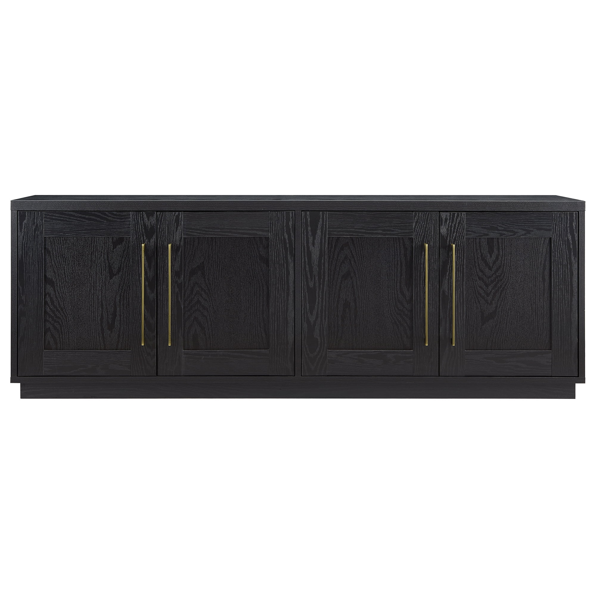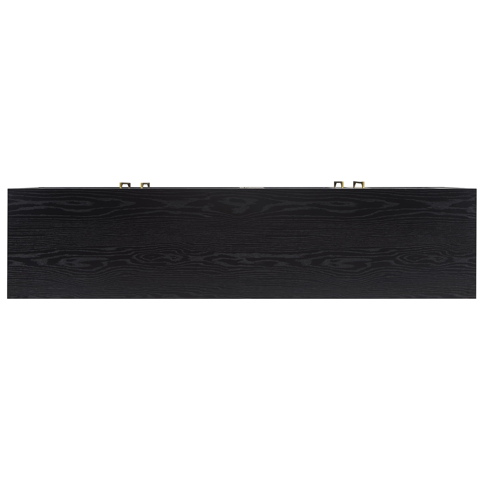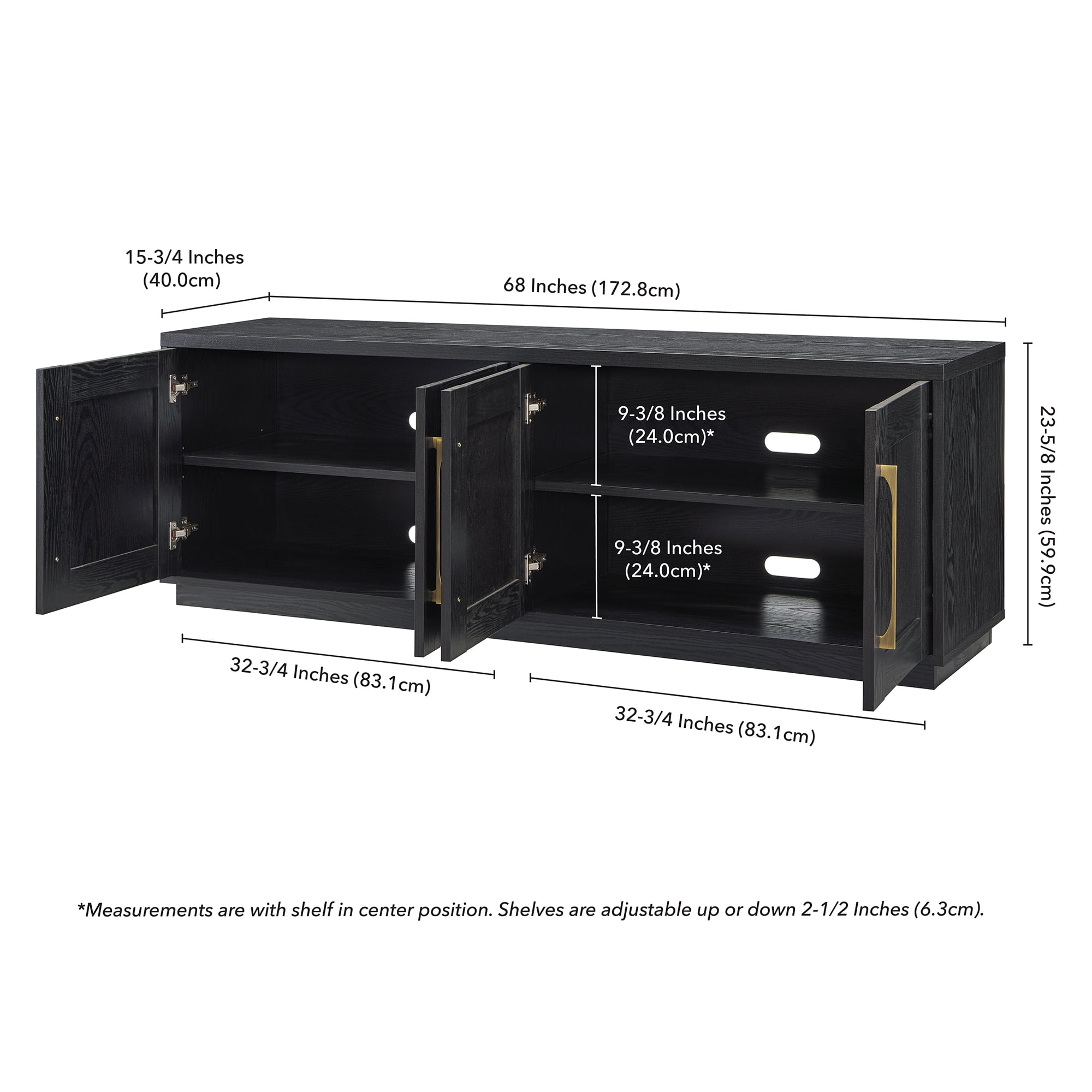 A transitional design accommodates TVs up to 75″ for your entertaining space. Constructed of sturdy MDF materials in a handcrafted Black Grain finish. Features four doors with enclosed cabinets and 4 shelves for ample storage. The top has a weight capacity of 75lbs. Lower shelves can hold 25lbs. each. Clean with a soft, dry cloth; no harsh chemicals or abrasive cleaning materials. Features easy assembly.