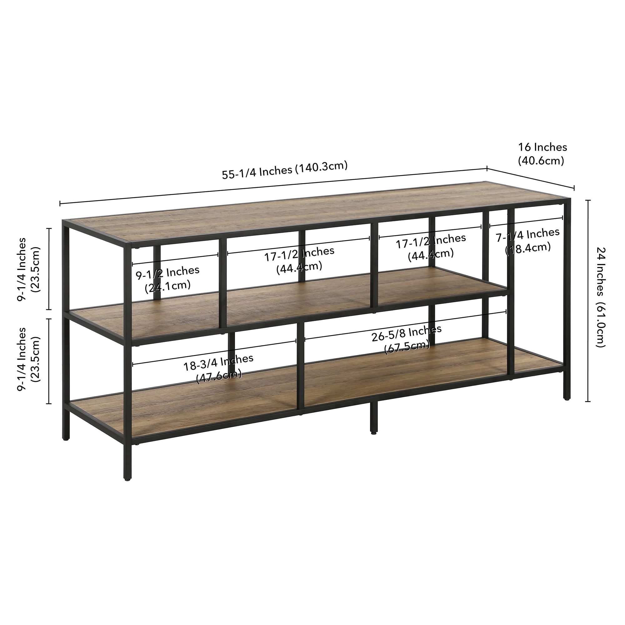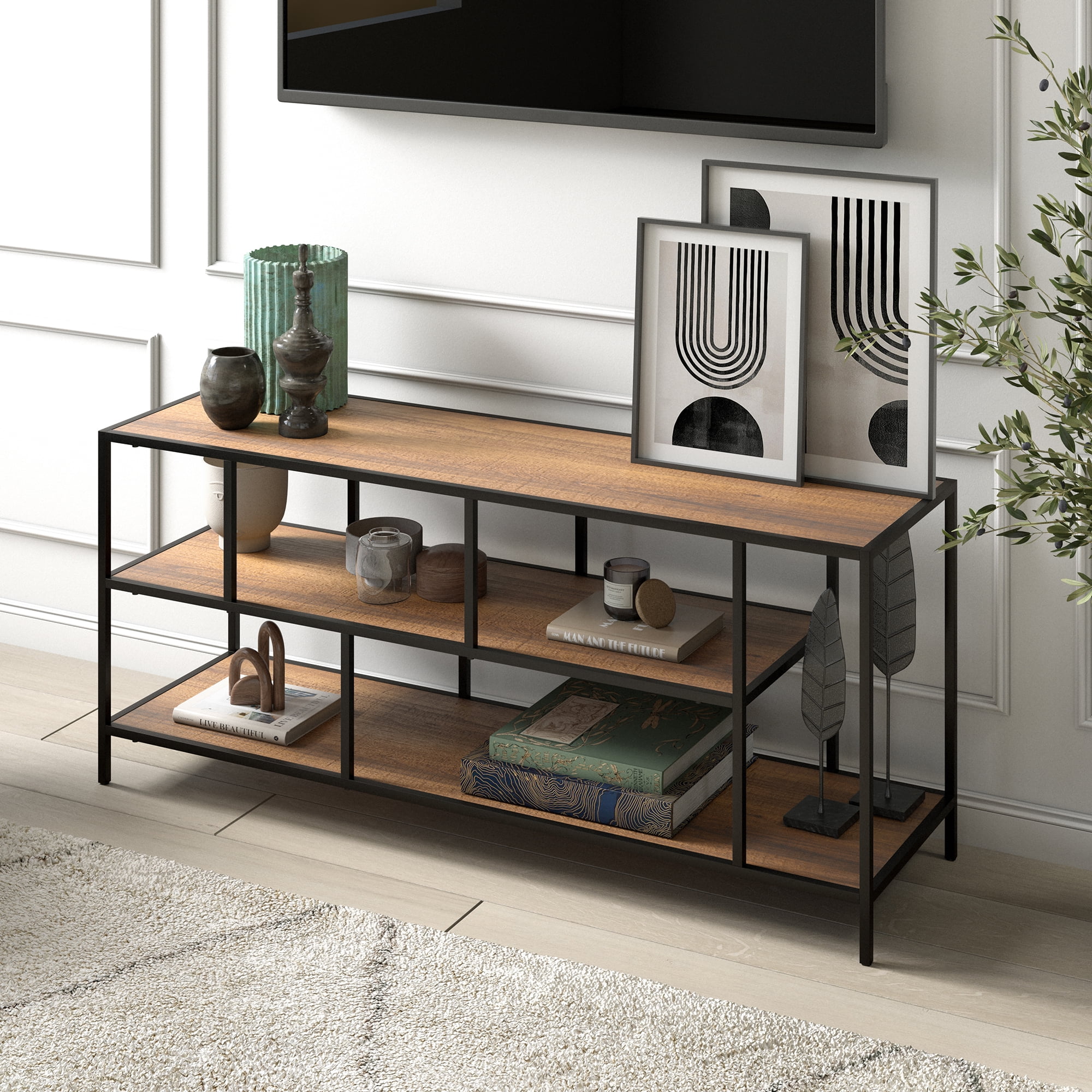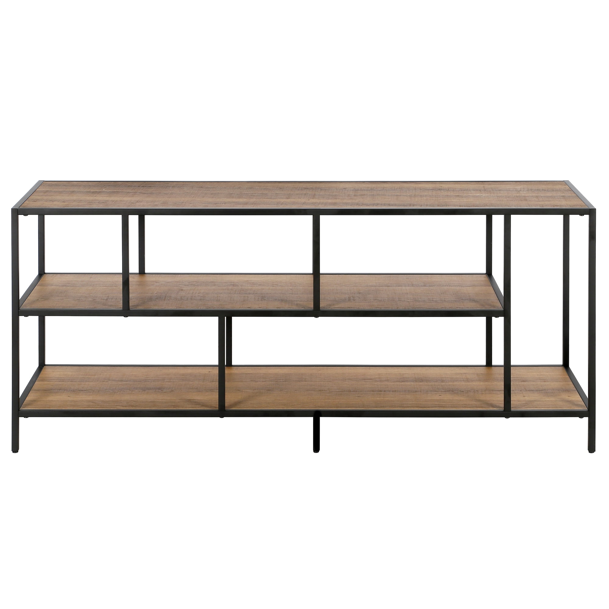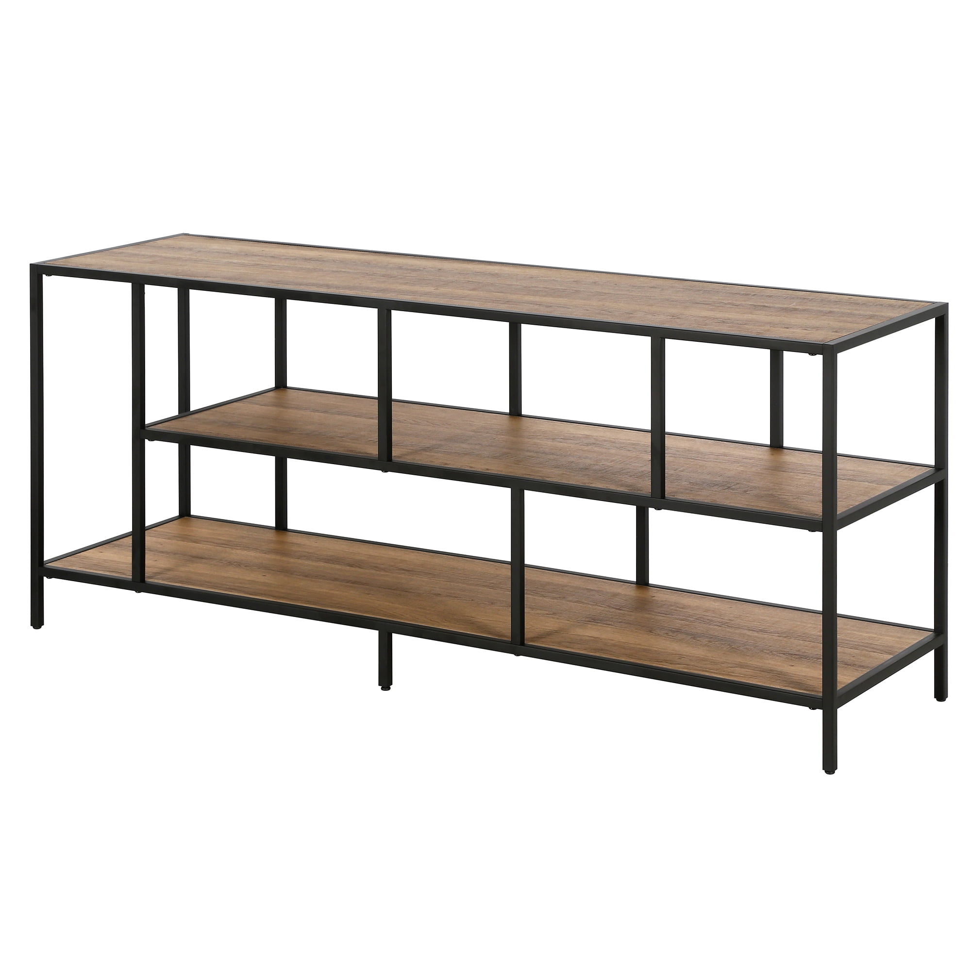 Evelyn&Zoe Winthrop Rectangular TV Stand with Metal Shelves for TV’s up to 60″, Blackened Bronze/Rustic Oak