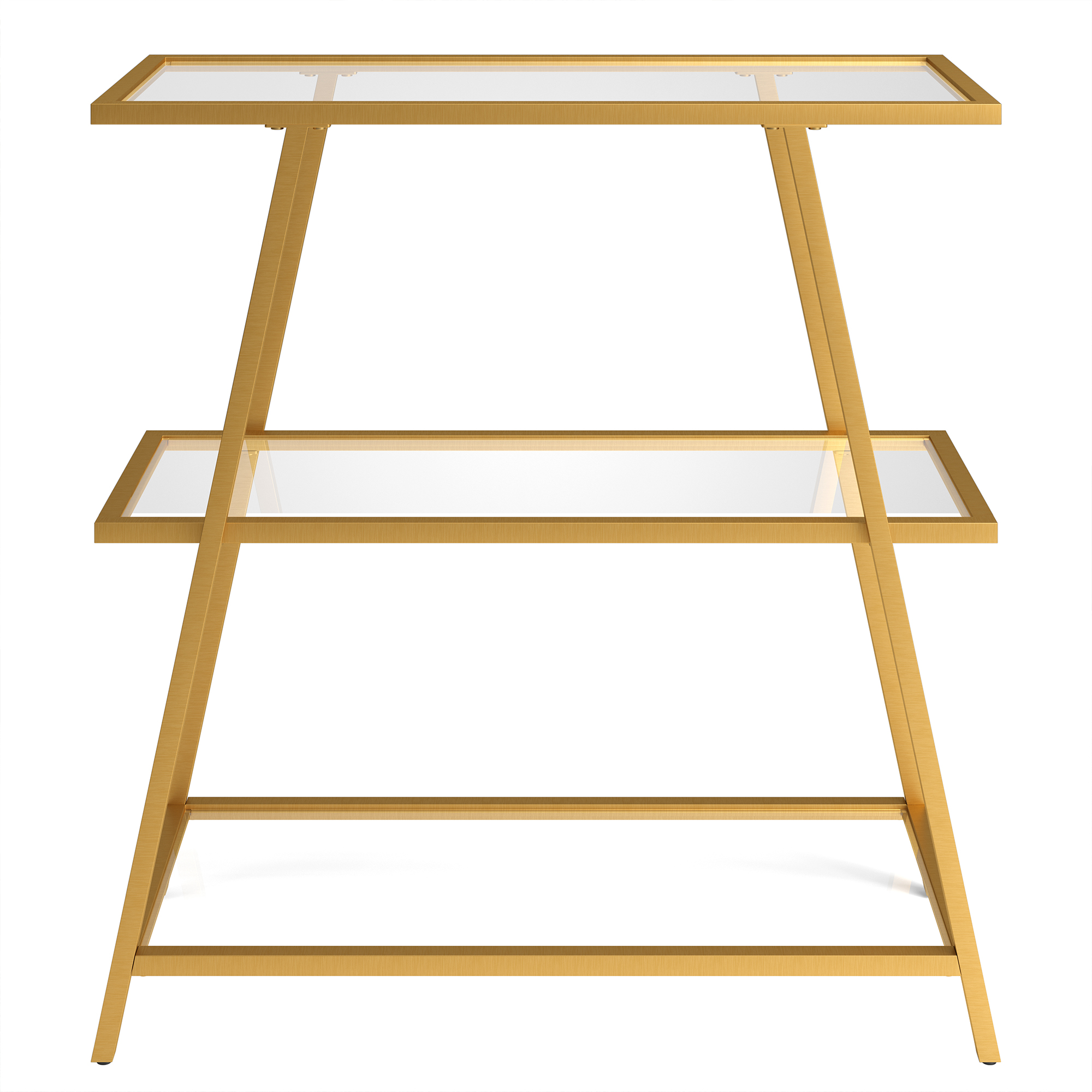 A unique angled profile sets this industrial-inspired bookcase apart. Its diagonal frame leans in to support and frame the durable tempered shelves, creating an artful backdrop for your books, framed photos, or collections of decorative items. The streamlined look and neutral metallic finish pairs seamlessly with your existing color scheme and décor style.