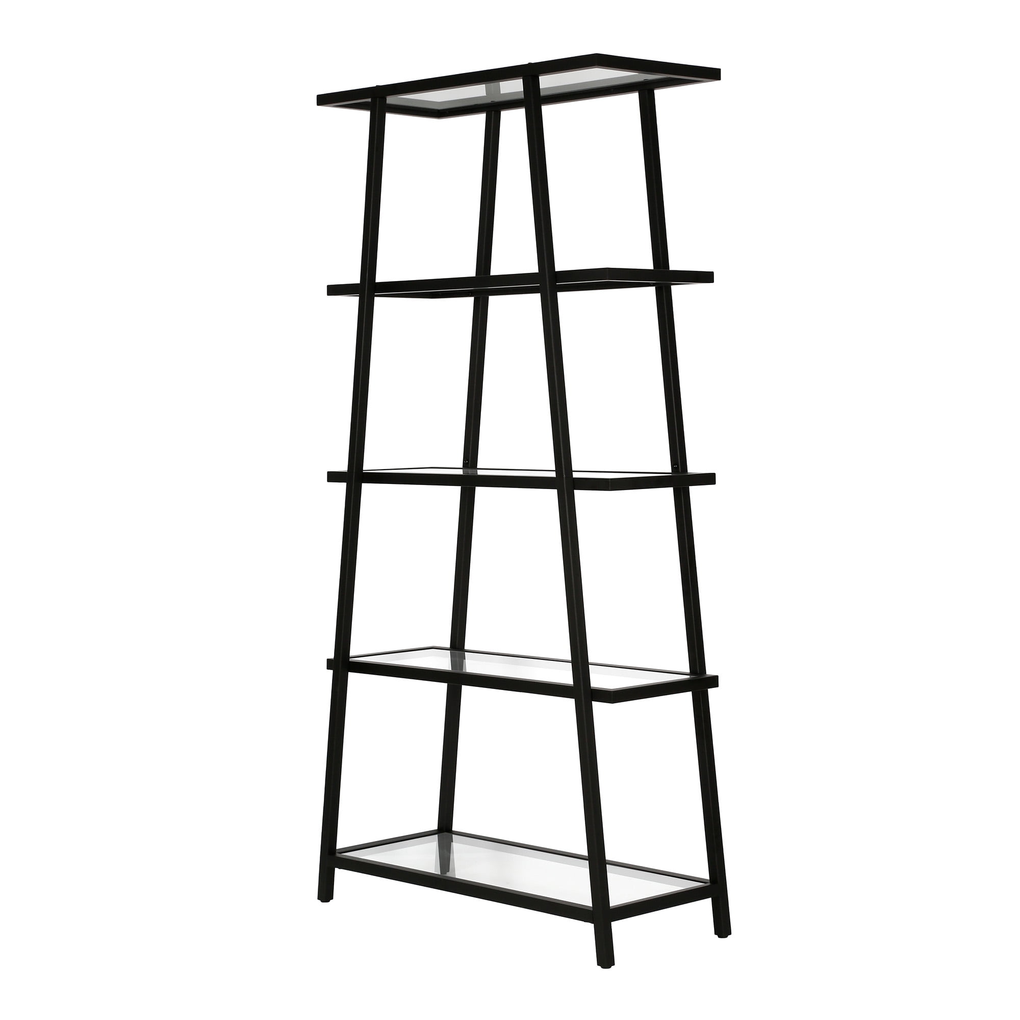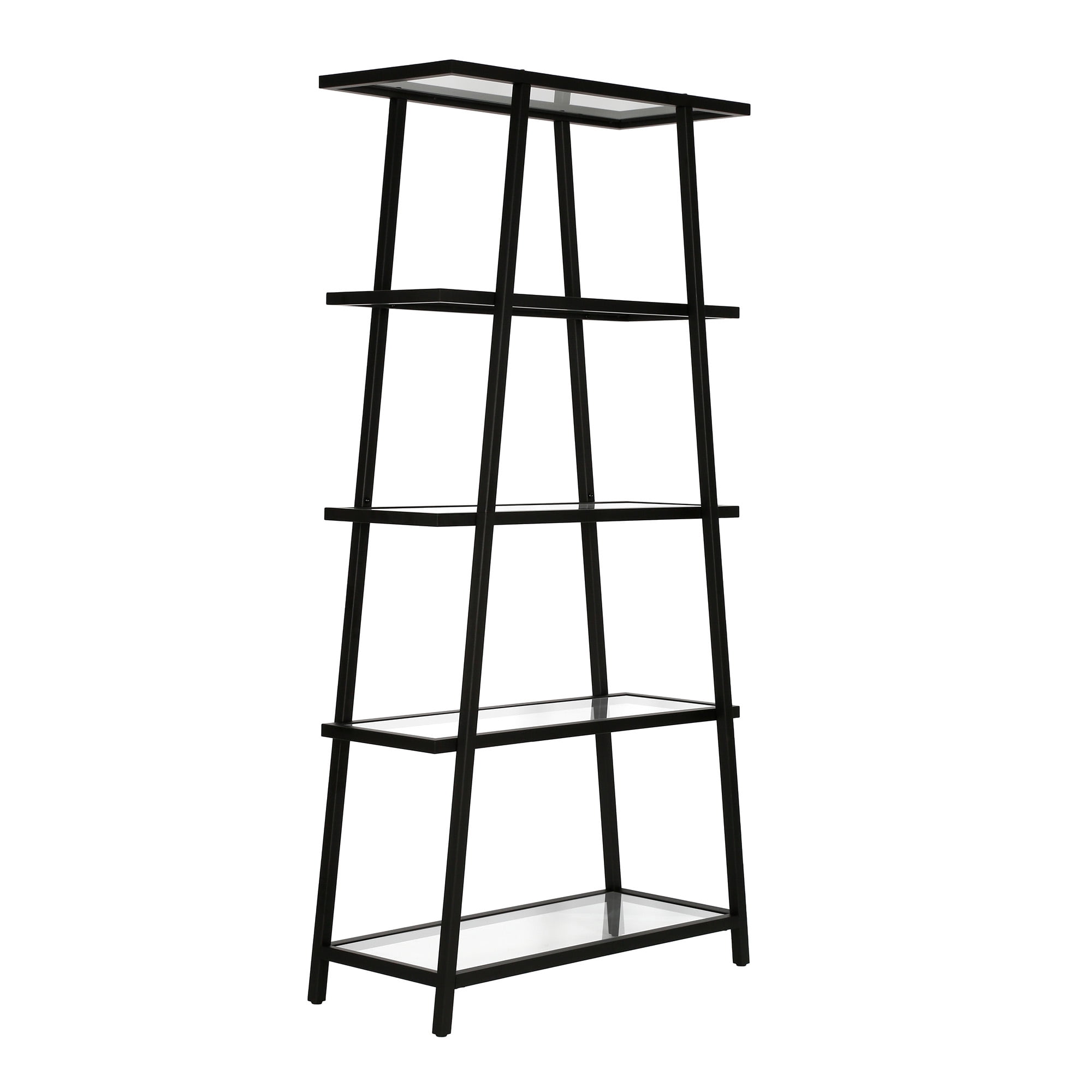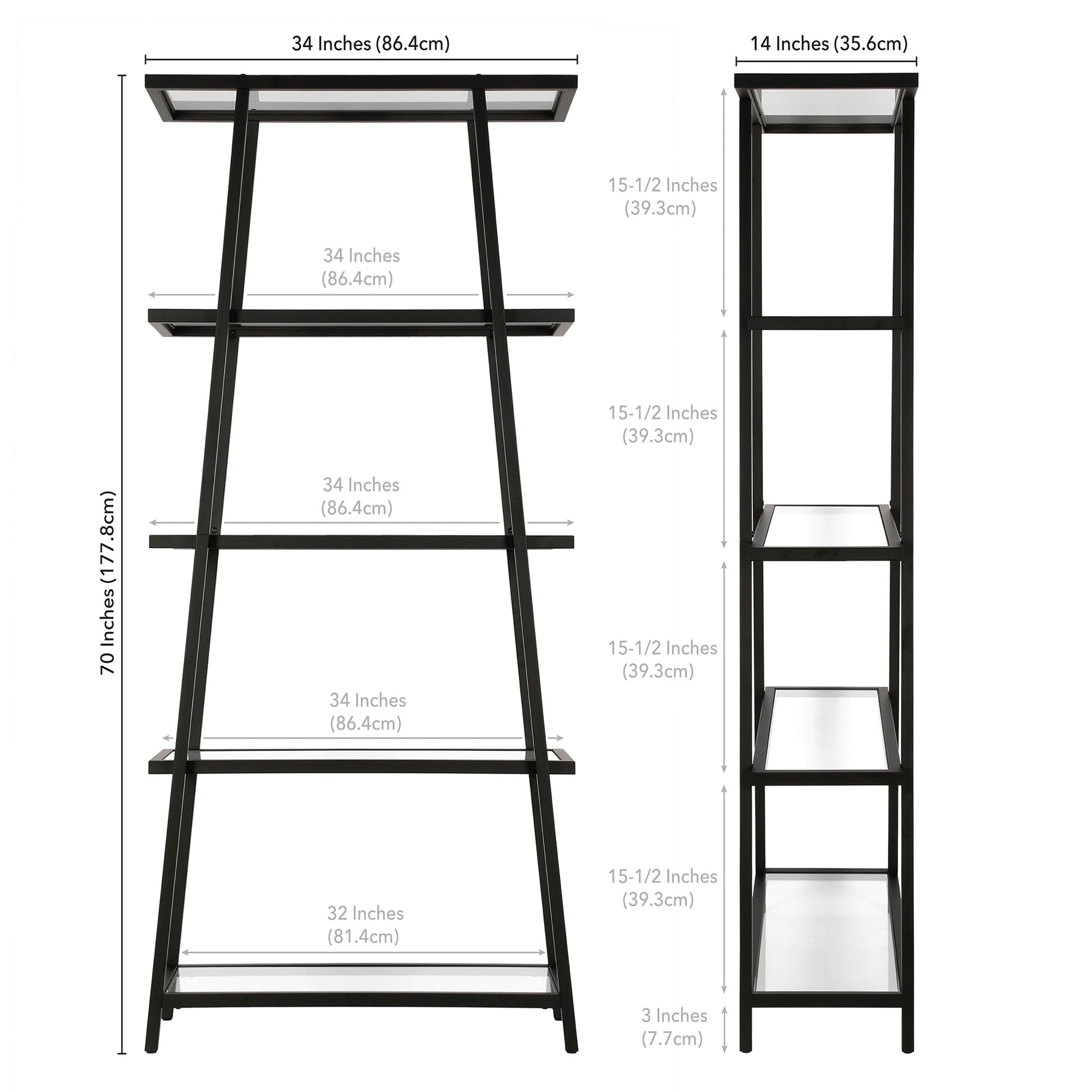 This angled bookcase stands at 70″ tall and is perfectly designed to fit into any space. Featuring 4-tiers of shelving for displaying your books, pictures, plants and more. Hand crafted blackened bronze finish is applied to the steel frame. Clean with a soft, dry cloth, no harsh chemicals or abrasive cleaning materials. Features easy assembly.
