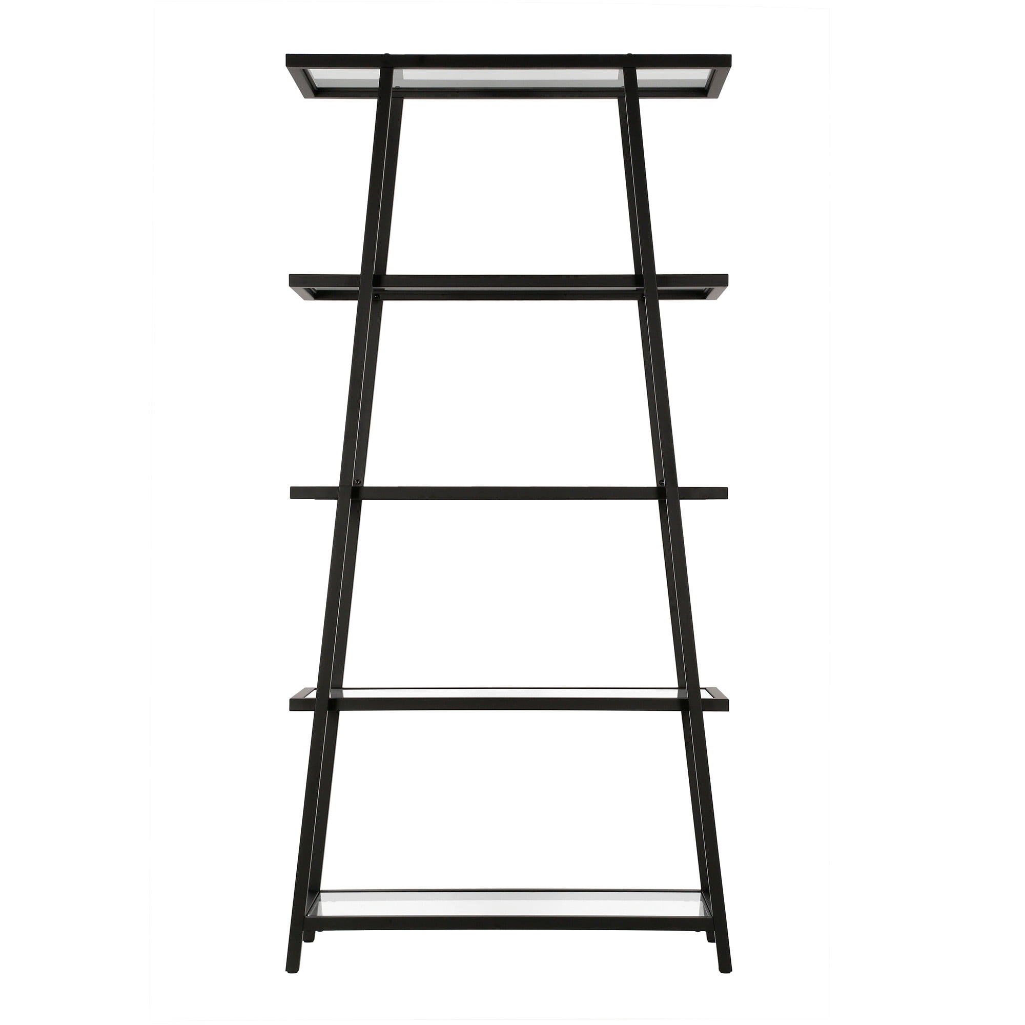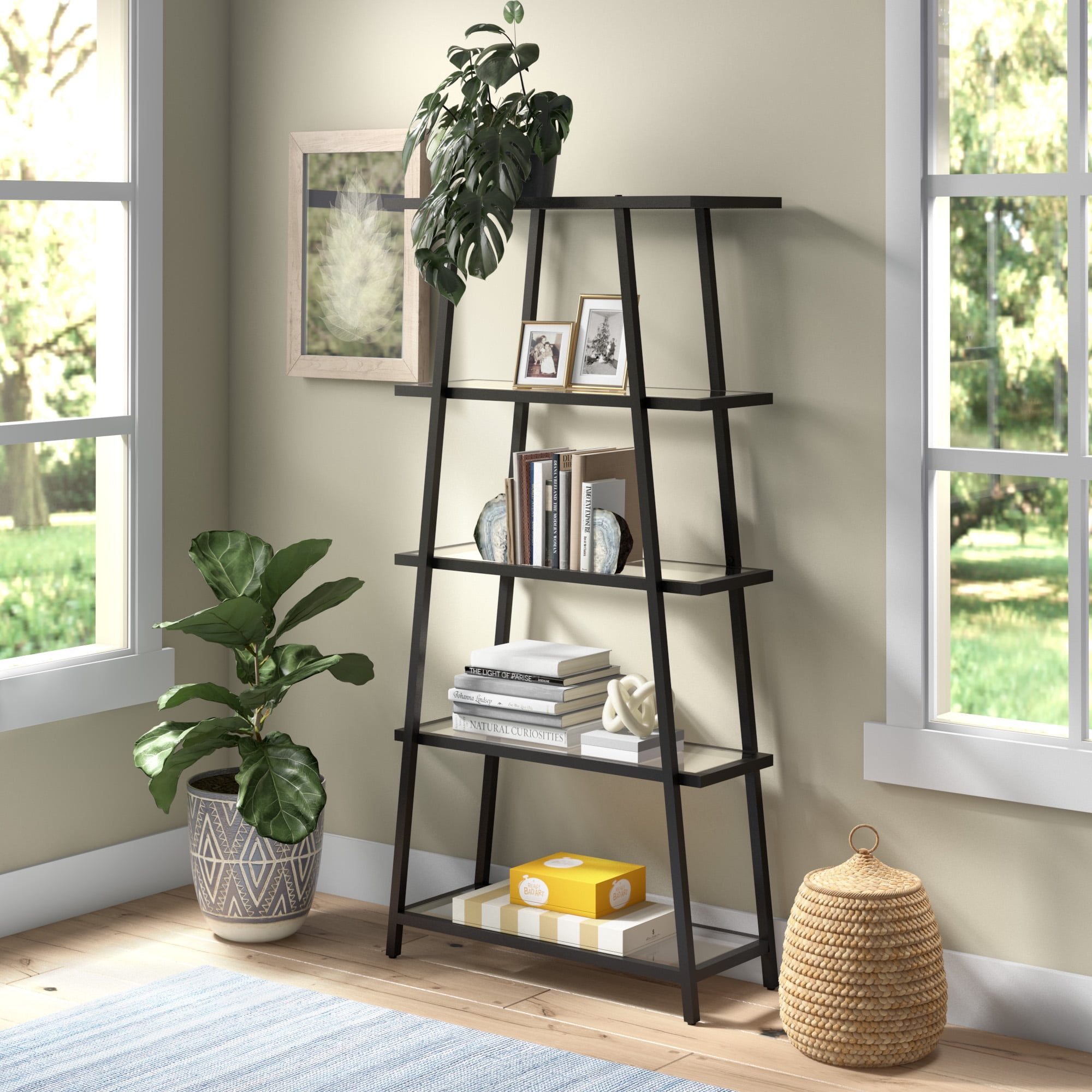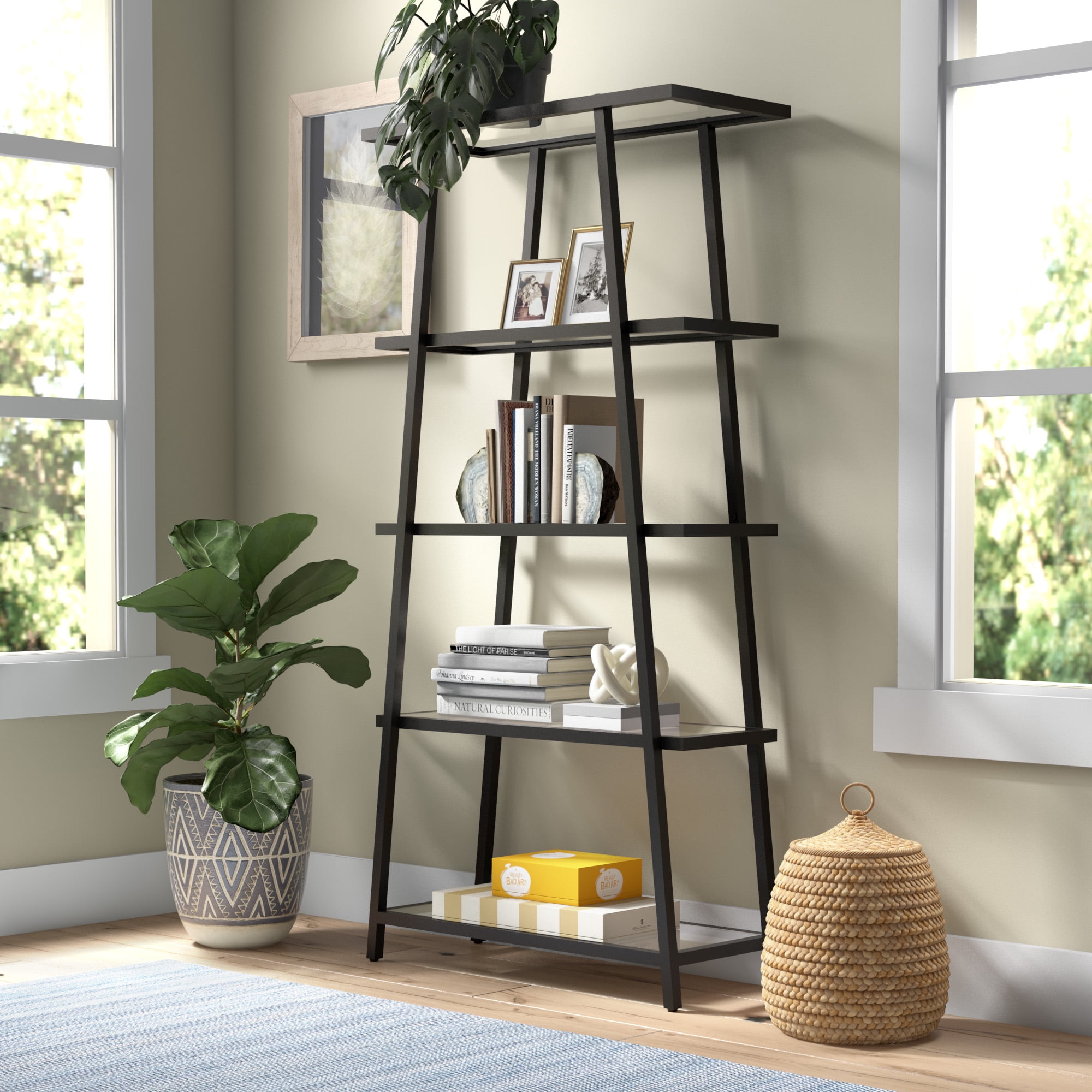 This angled bookcase stands at 70″ tall and is perfectly designed to fit into any space. Featuring 4-tiers of shelving for displaying your books, pictures, plants and more. Hand crafted blackened bronze finish is applied to the steel frame. Clean with a soft, dry cloth, no harsh chemicals or abrasive cleaning materials. Features easy assembly.