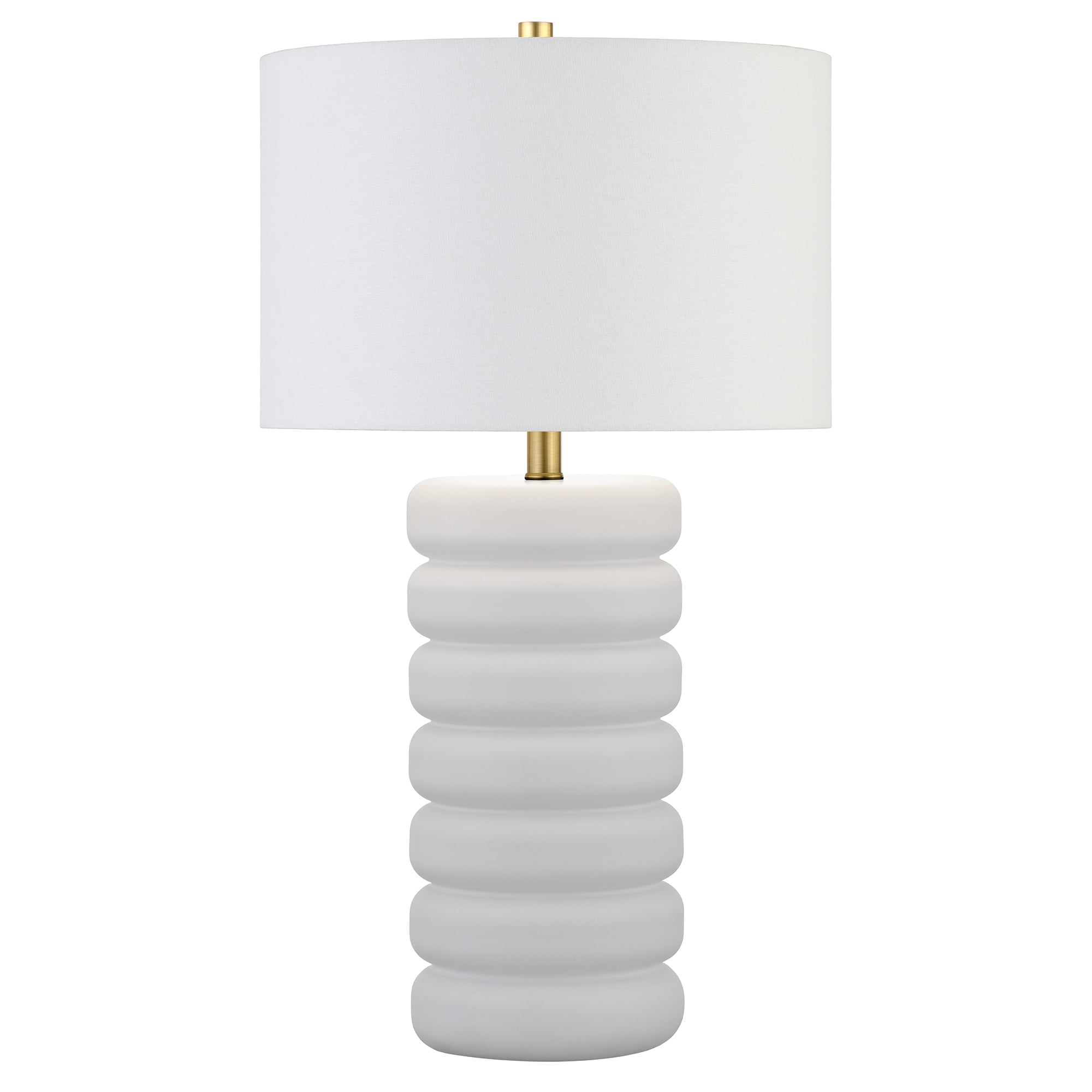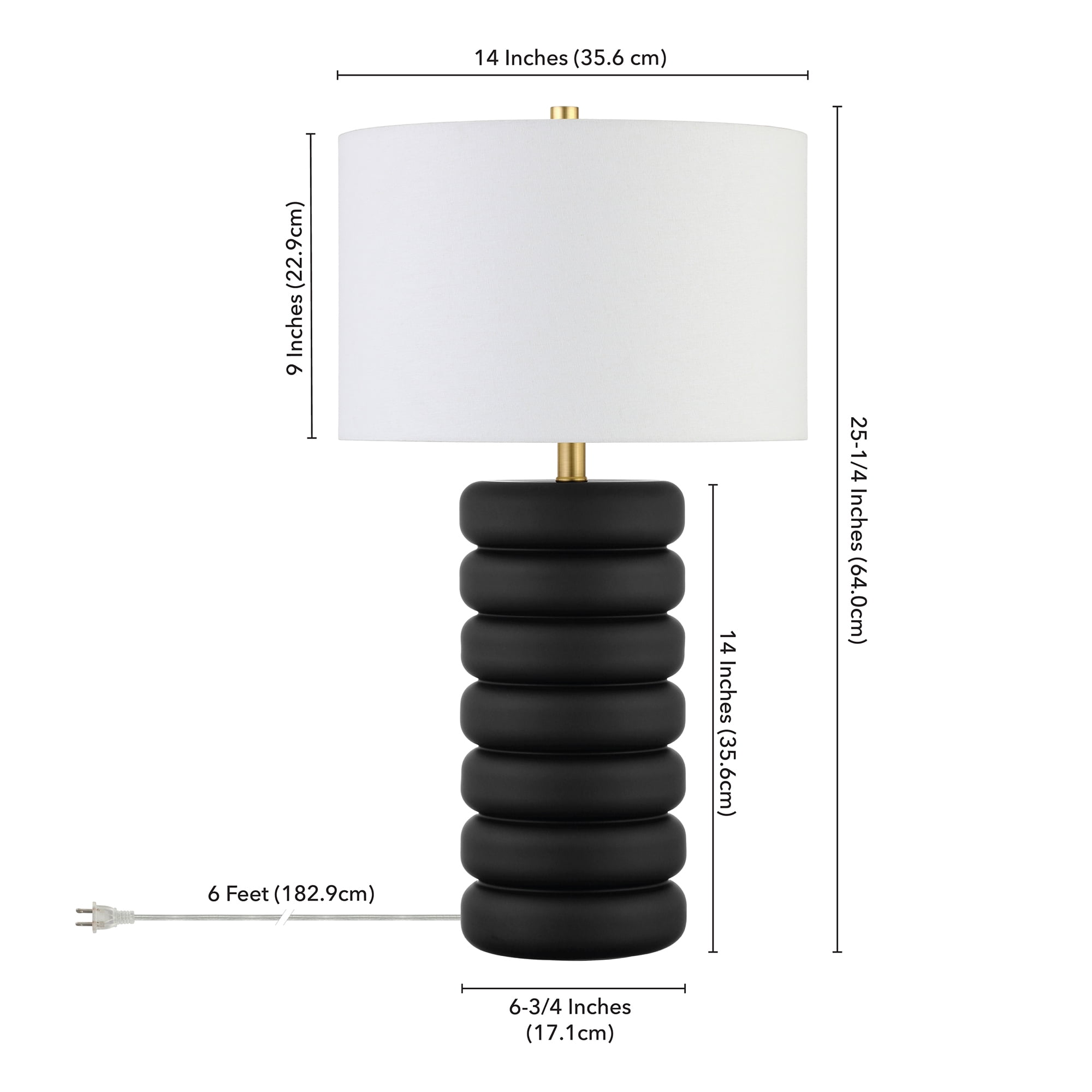 Update your bedside, mantle, or hall table styling with this textural table lamp. The jar-shaped base is made of stacked glass rings, creating an organic feel to the fixture. Accented with a lustrous brass downstem and a crisp linen shade, this lamp is the perfect piece anywhere you need to shed a little extra light. Features: Modern transitional design for your living room, workspace, or bedside table. Handcrafted matte black finish is applied to the round glass and metal base. Paired with a white drum linen shade. Rated for one 60W incandescent bulb; 9W LED bulb, 13W fluorescent (CFL) bulb, or 9W self-ballasted LED bulb. E26-base bulb. Bulb not included. Includes a 6 ft. cord with rotary socket switch. Clean with a soft, dry cloth; no harsh chemicals or abrasive cleaning materials. Specifications: Product Dimensions: 14″W x 14″D x 25″H Product Weight: 4.85 lbs Color/Finish: Matte Black/Brass
