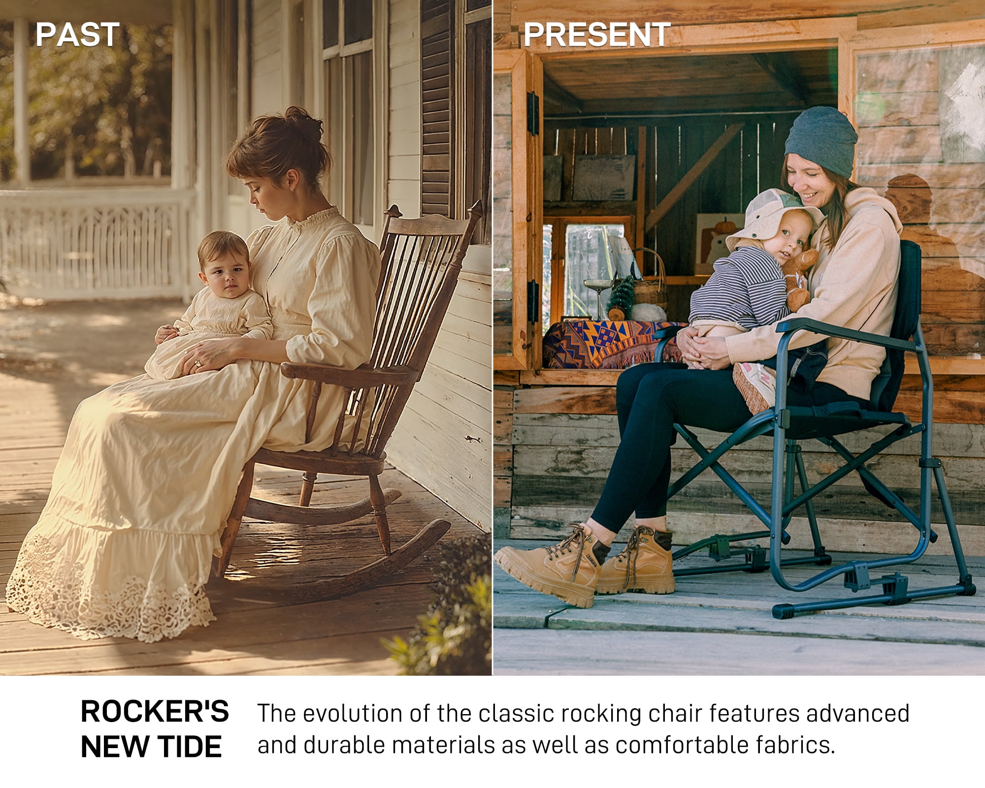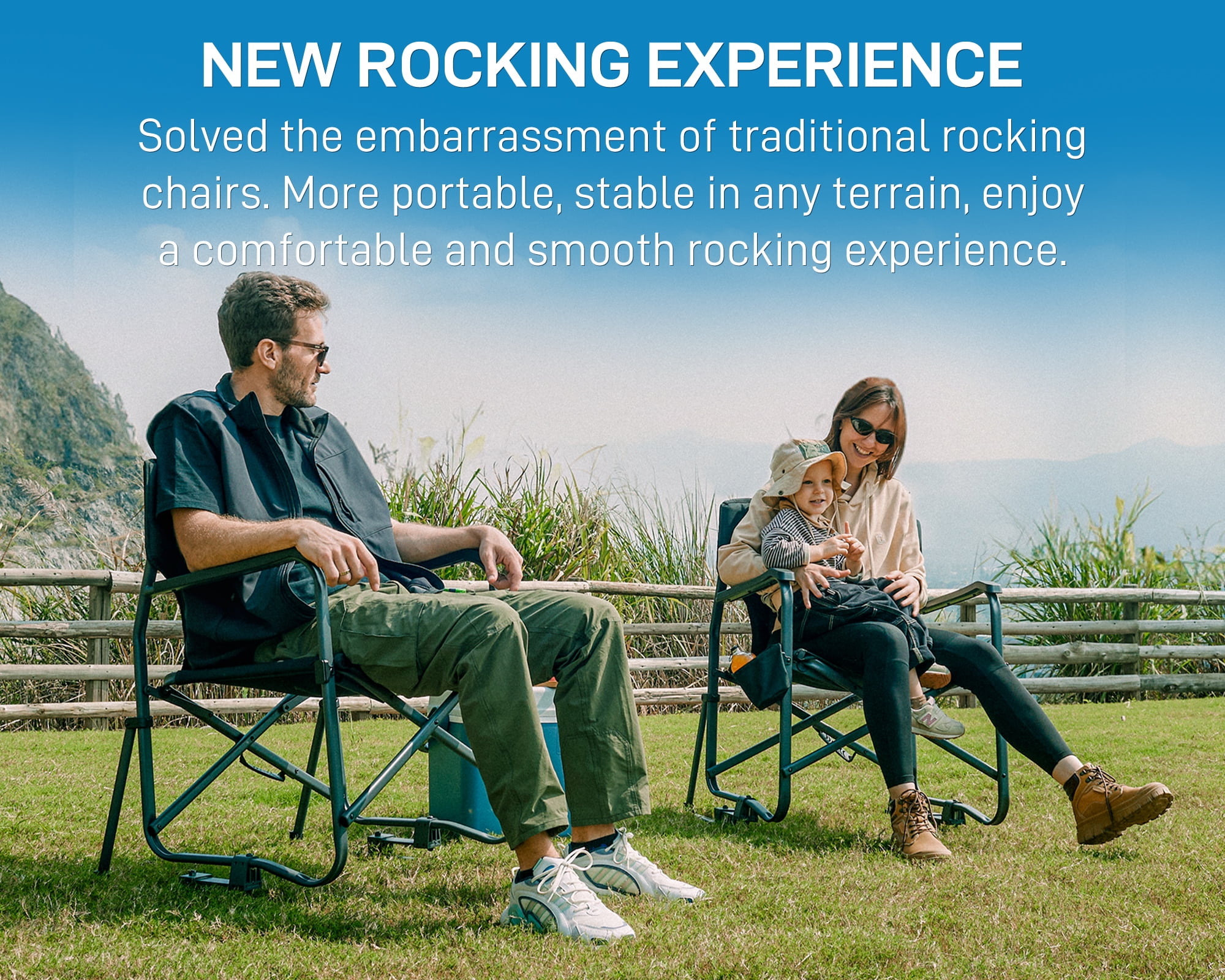 COMFORTABLE ROCKING EXPERIENCE: This folding rocker provids a smoother and wider range of rocking experience with advanced elastic materials . Enjoy leisure time comfortably. PREMIUM MATERIALS: The widened plastic armrest allows your arms to relax. 400D fabric is more durable and comfortable than ordinary fabrics. It’s a uxury camping chair. STRONG STRUCTURE: Thickened metal frame and new version of rock design make this outdoor rocker more stable. The maximum load-bearing capacity is 300Lbs, allowing more people to experience the EVER ADVANCED bounce chair. REMOVABLE CUP HOLDER: Our folding chair is designed with a detachable cup holder module. The cup holder can be repositioned left and right. We are about to develop more practical accessories that are compatible with this module. PORTABLE HANDLE: This camping chair has a handle on the back and seat tube, making it easy to carry to your campsite, backyard, or even RV.