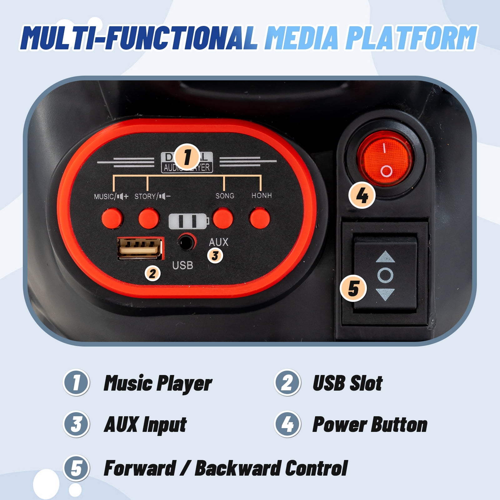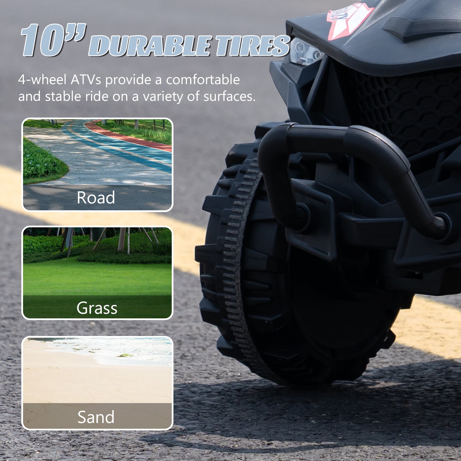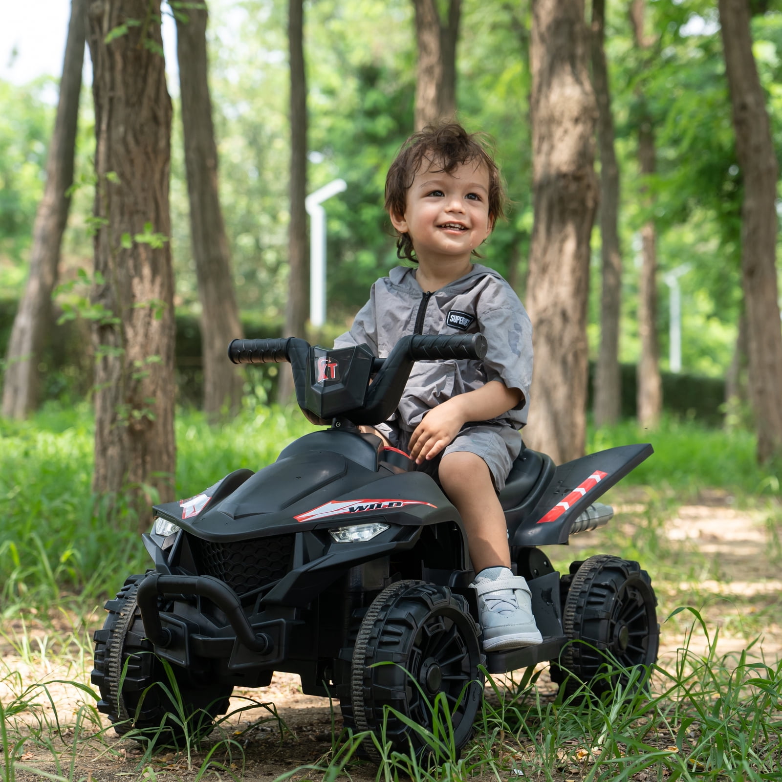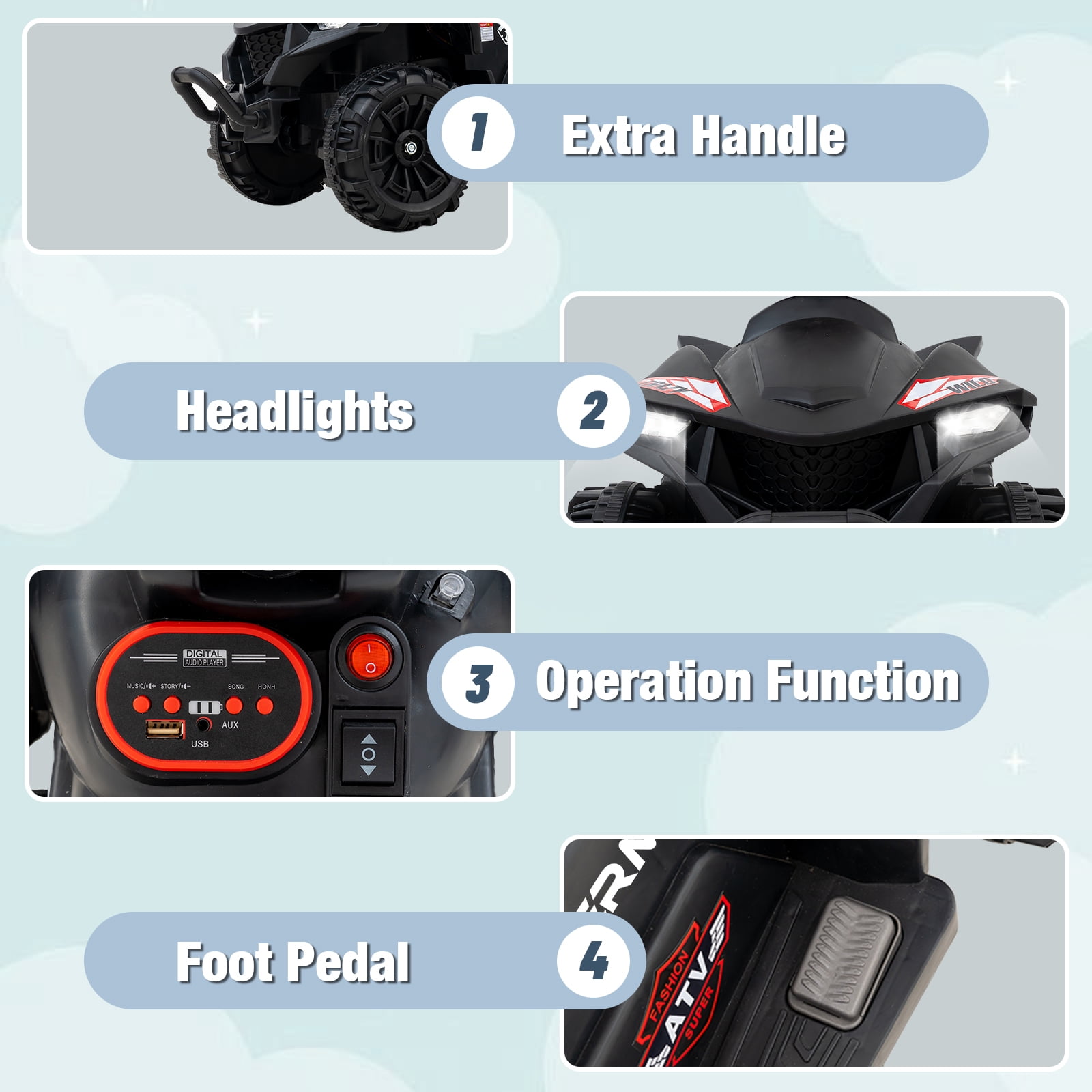 ✨ Fun & Durable Electric Ride for Kids: With dual 35W motors for powerful performance and a 12V battery for up to 2 hours of playtime. The treaded wheels enhance grip well-suited for cruising on flat surfaces, grass, or asphalt. ✨ Stability & Control with Ease: Our 4-wheel Kids’ ATV offers excellent stability to support your child during playtime. It’s also very easy to operate. Simply flip the switch, select your direction, press the pedal to cruise, and release to stop. For added peace of mind, parents can assist with the included remote control, making it beginner-friendly and safe. ✨ Portable & Cozy Ride:With a handy carry handle, this car is a breeze to maneuver and store. Its spacious footrests and comfortable seat keep little riders cozy on every adventure. ✨ Ride-On Delight: Our Kids ATV is designed for kids aged 3 and up, supporting weights up to 66 lbs. With a safe max speed of 2.5 mph, it’s the perfect companion for outdoor adventures. You’ll love watching the joy as your little ones explore and play! ✨ Diverse Fun Functions:This ride-on ATV combines educational and entertainment features, offering built-in music and stories, plus USB and AUX ports for kids to use while they ride. The bright headlights ensure visibility in the dark, and the power display reminds you when it’s time to recharge. Easy to ride and control with a few buttons and a foot pedal 2 powerful motors and 12V rechargeable battery to reach 2.5 mph speed Bright headlights, built-in music and horn for a fun driving experience Front carrying handle for easy movement Premium PP material ensures high durability Comfortable seat and wide footrest for more comfort and safety