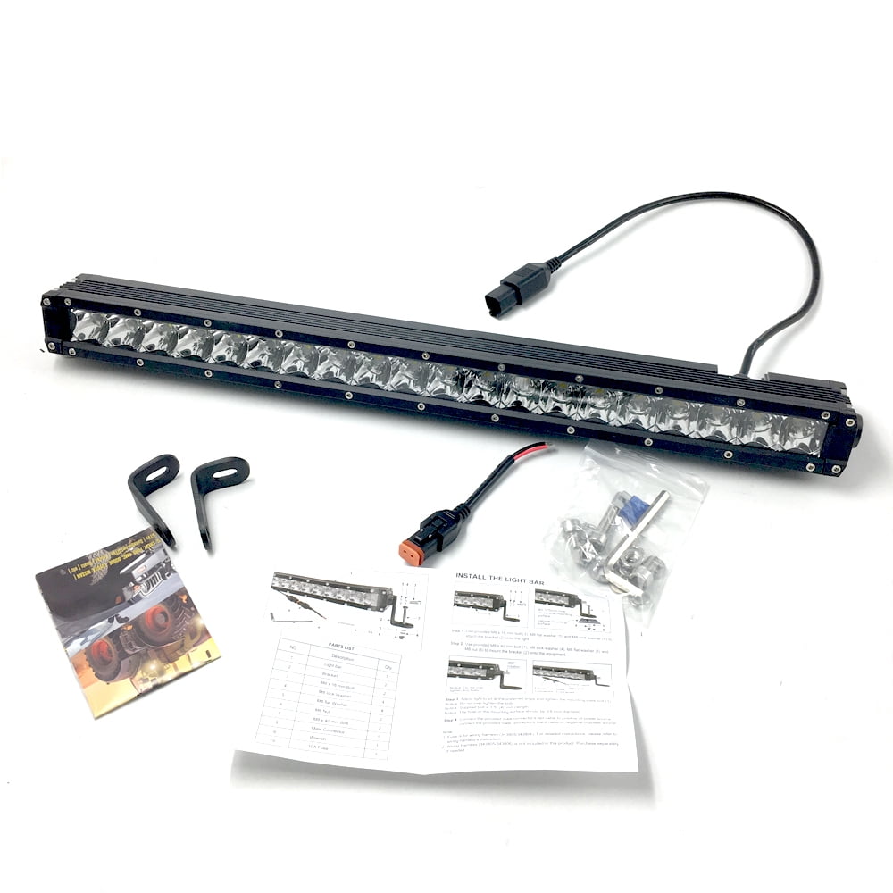 Products Video: 30 Inch 150W Offroad Roof LED Single Row Light Bar For SUV ATV Material: Aluminum Wattage:150W Voltage: 10-36V Light Color: Cool White Bulbs: 30 CREE LEDs Raw Lumens: 9000 Effective Lumens: 7200 Length of wiring: 17.7in. (45cm) Assembled dimensions: in.L x 3.11 in. D x 2.82 in. H Waterproof Rate: IP68 LED lifetime: up to 50,000 hrs. 1 year warranty Certification: CE, FCC and ROHS Applications: Off Road Lighting: Jeeps, 4×4, Cars, ATV, UTV, SUV, Truck, Trailer, Forklift, Trains, Boat, Bus, Outdoor lighting, etc. Other Lighting: Excavator, Dozer, Road Roller, Crane, Tractor, Harvester, Grain Drill, Mower, Snowplow,Fire engine, Rescue Vehicle, Camping, Mining Lighting, Construction Lighting, etc. Boat cabin lighting, hunting, camping Outdoor professional engineering lighting, such as construction lighting, mining lighting etc Outdoor living lighting, such as camping, fishing, BBQ etc