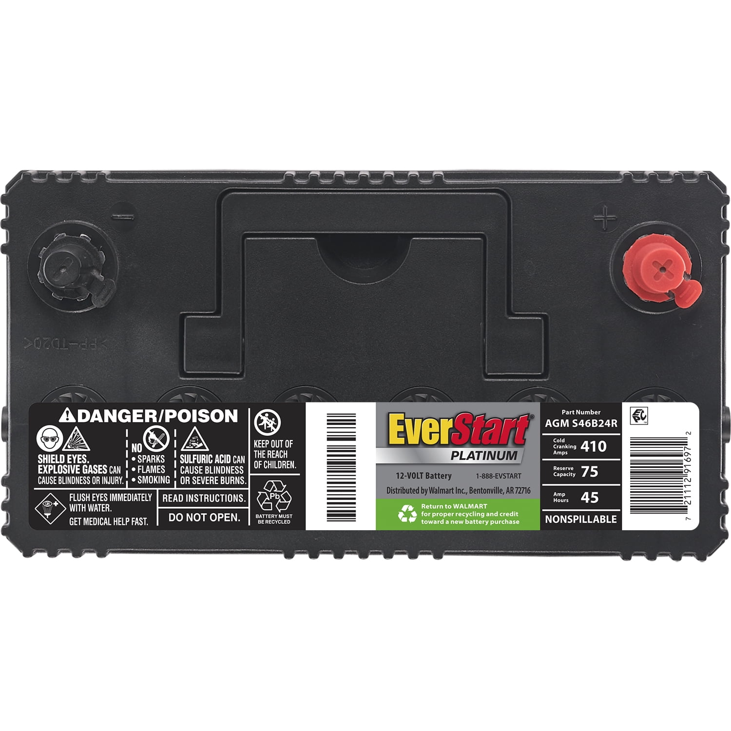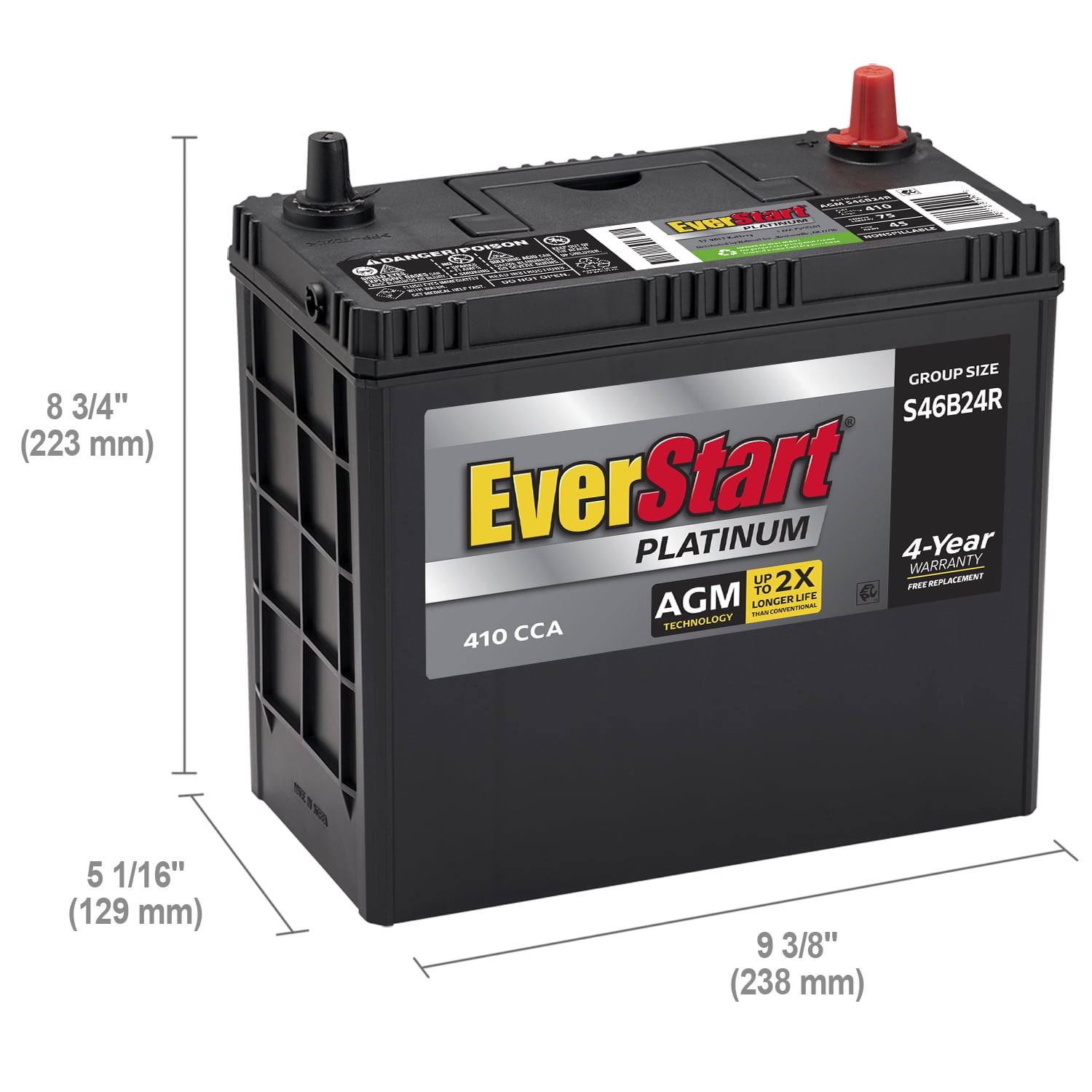 Online Ship to home ONLY – The BOXED option of this item only ships straight to your home, to check your local store’s product availability and delivery options- Stay on the go with this The EverStart Platinum BOXED AGM battery, Group Size S46B24R. It is the best choice for your power-hungry vehicle and comes with a four year warranty. Electronic features such as DVD players, GPS systems, heated seats, audio systems and start-stop technology all add to the demand on a battery. Every additional electronic component creates a power draw, which leads to more discharge and recharge cycles, which shorten the lifespan of ordinary batteries. This 12 volt EverStart Platinum AGM battery delivers 410 cold cranking amps with 75 minutes of Reserve Capacity. They are precision engineered to offer the ultimate combination of reliability, durability, and safety, even under the most demanding applications. EverStart batteries, distributed and sold exclusively by , have been rated a “” by a leading consumer magazine for over 10 years! Whether you need an automotive, marine, lawn and garden, agricultural, or powersport battery, EverStart and have you covered. An EverStart battery is an exceptional value with a low cost that includes a great warranty and free installation. No matter where you are in the U.S. your local store has you covered. Save money, live better, and drive longer with an EverStart battery.
