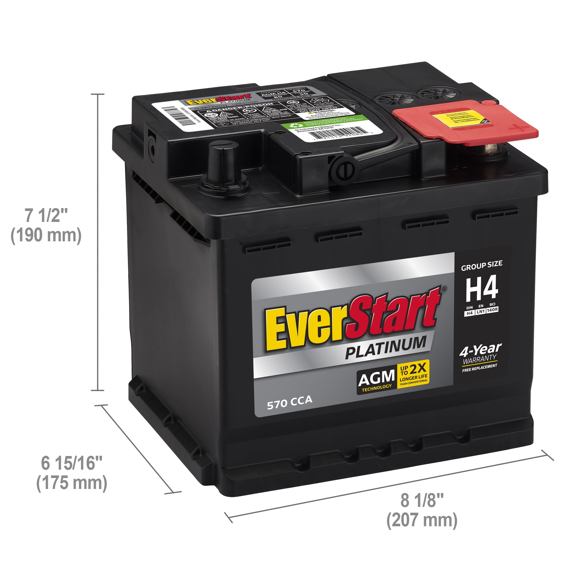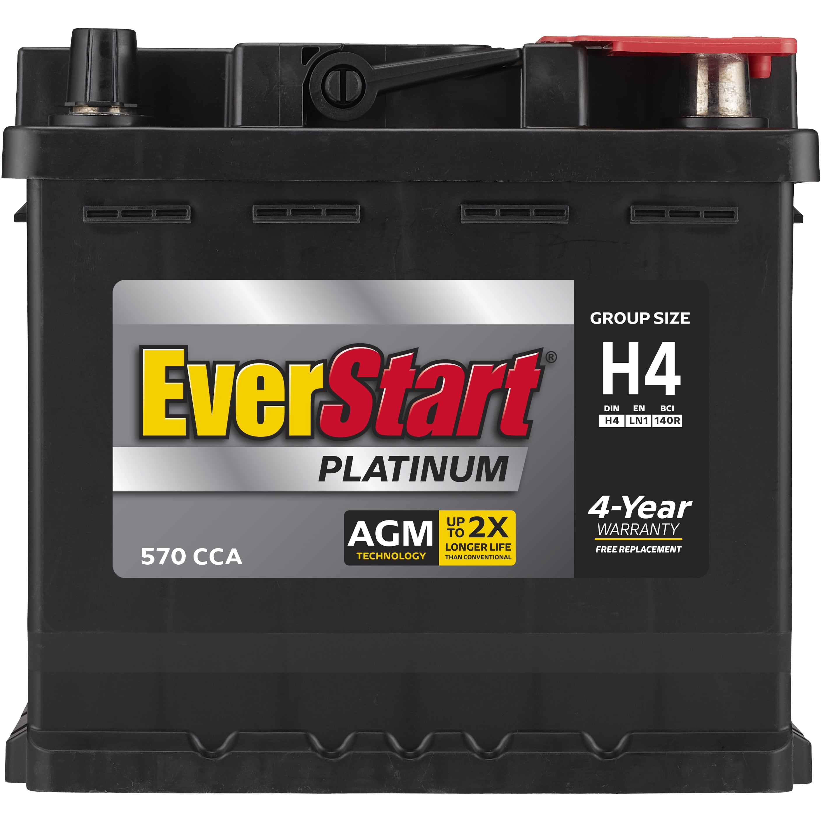 This battery is only available online and ships straight to your home. Stay on the go with this The EverStart Platinum AGM battery, Group Size H4 (BOXED). It is the best choice for your power-hungry vehicle and comes with a four year warranty. Electronic features such as DVD players, GPS systems, heated seats, audio systems and start-stop technology all add to the demand on a battery. Every additional electronic component creates a power draw, which leads to more discharge and recharge cycles, which shorten the lifespan of ordinary batteries. This 12 volt EverStart Platinum AGM battery delivers 570 cold cranking amps with 80 minutes of Reserve Capacity. They are precision engineered to offer the ultimate combination of reliability, durability, and safety, even under the most demanding applications. EverStart batteries, distributed and sold exclusively by , have been rated a “” by a leading consumer magazine for over 10 years! Whether you need an automotive, marine, lawn and garden, agricultural, or powersport battery, EverStart and have you covered. An EverStart battery is an exceptional value with a low cost that includes a great warranty and free installation. No matter where you are in the U.S. your local store has you covered. Save money, live better, and drive longer with an EverStart battery.
