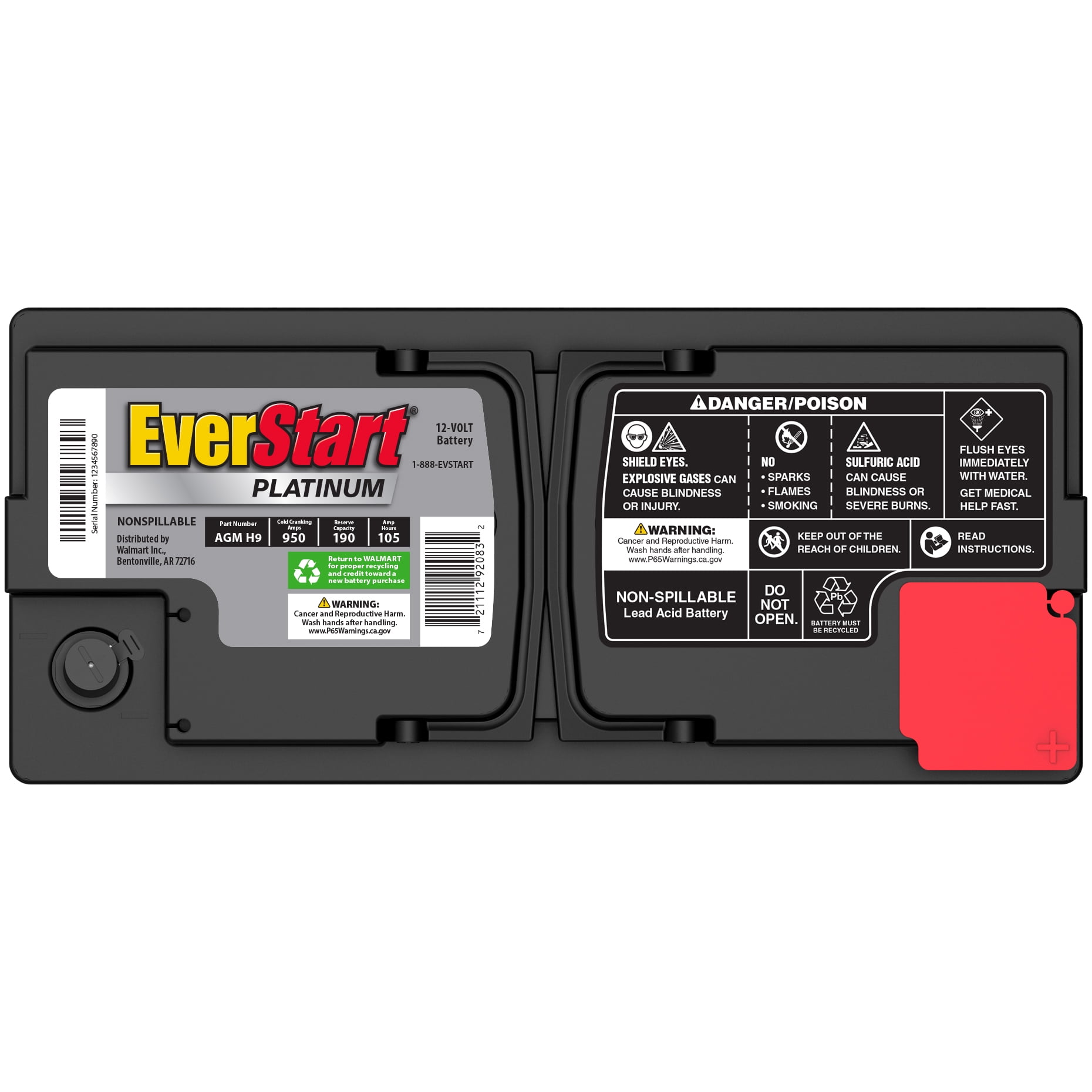 This battery is only available online and ships straight to your home. Stay on the go with this The EverStart Platinum AGM battery, Group Size H9 (BOXED). It is the best choice for your power-hungry vehicle and comes with a four year warranty. Electronic features such as DVD players, GPS systems, heated seats, audio systems and start-stop technology all add to the demand on a battery. Every additional electronic component creates a power draw, which leads to more discharge and recharge cycles, which shorten the lifespan of ordinary batteries. This 12 volt EverStart Platinum AGM battery delivers 950 cold cranking amps with 105 minutes of Reserve Capacity. They are precision engineered to offer the ultimate combination of reliability, durability, and safety, even under the most demanding applications. EverStart batteries, distributed and sold exclusively by , have been rated a “” by a leading consumer magazine for over 10 years! Whether you need an automotive, marine, lawn and garden, agricultural, or powersport battery, EverStart and have you covered. An EverStart battery is an exceptional value with a low cost that includes a great warranty and free installation. No matter where you are in the U.S. your local store has you covered. Save money, live better, and drive longer with an EverStart battery.