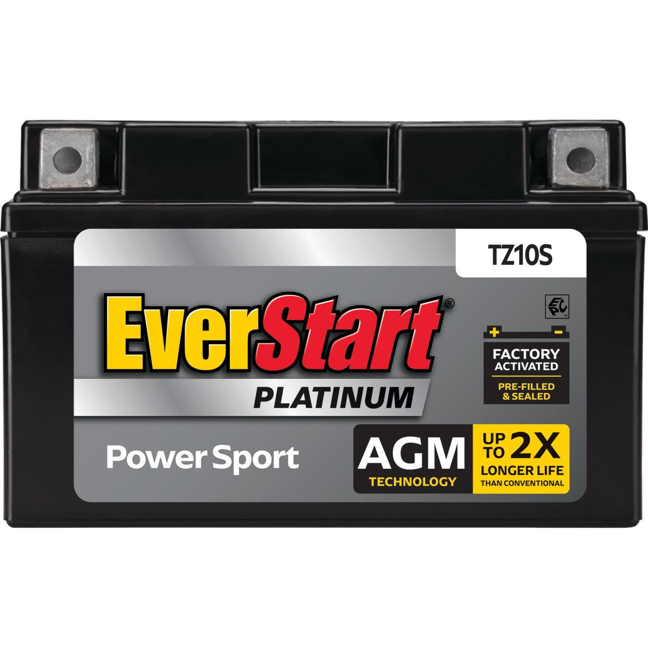 Online Ship to home ONLY – The BOXED option of this item only ships straight to your home, to check your local store’s product availability and delivery options- Get back on the road with this EverStart Premium AGM PowerSport Battery, Group Size TZ10S (BOXED). It offers 190 CCAs with a 8 AH rating and is Ready to Ride, prefilled, sealed, and charged. Each battery is freshly charged, with no need to hassle with measuring, filling, and waiting for a charge – so they’re ready when you’re ready. It’s designed for use with a motorcycle, side-by-side, ATV, UTV, snowmobile or water craft. Because EverStart batteries feature AGM technology, they’re built to handle whatever the road, dirt, water, and snow can dish out and still deliver high performance. Superior vibration resistance and proven AGM technology ensure consistent, high-amp starting. Specs/Images of batteries on this site may differ slightly from the physical product in the store EverStart batteries, distributed and sold exclusively by , have been rated a “” by a leading consumer magazine for over 10 years! Whether you need an automotive, marine, lawn and garden, agricultural, or powersport battery, EverStart and have you covered. An EverStart battery is an exceptional value with a low cost that includes a great warranty and free installation. No matter where you are in the U.S. your local store has you covered. Save money, live better, and drive longer with an EverStart battery.