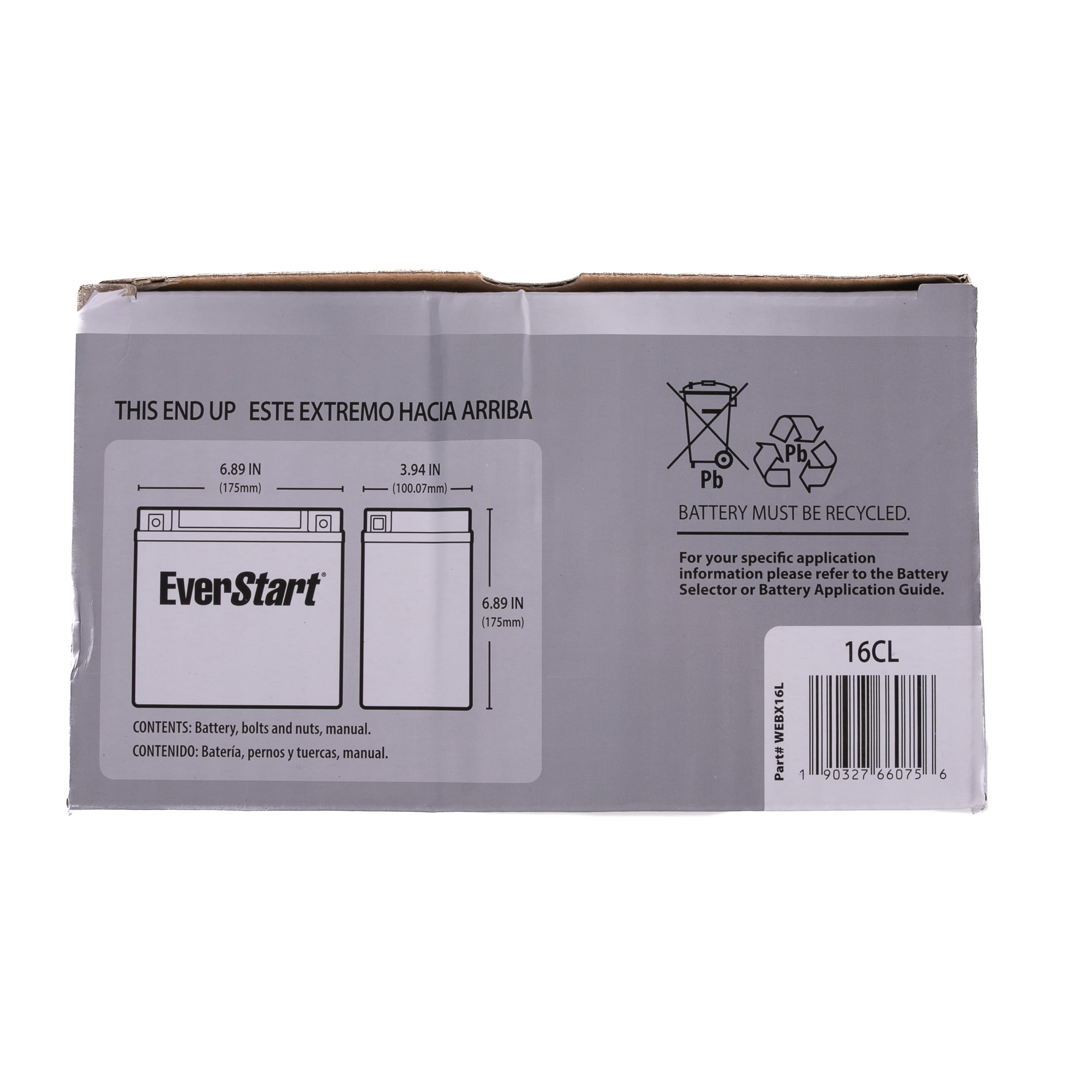 EverStart Power Sport Factory Activated AGM Battery, Group Size WEBX16L 12 Volts, 230 CCA Absorbent Glass Mat (AGM) Ready to ride, pre-filled and sealed Spill-proof design Maintenance-free Superior vibration resistance Includes nuts and bolts for a variety of terminal attachments 3 month free replacement warranty Battery fits in various makes, models and years