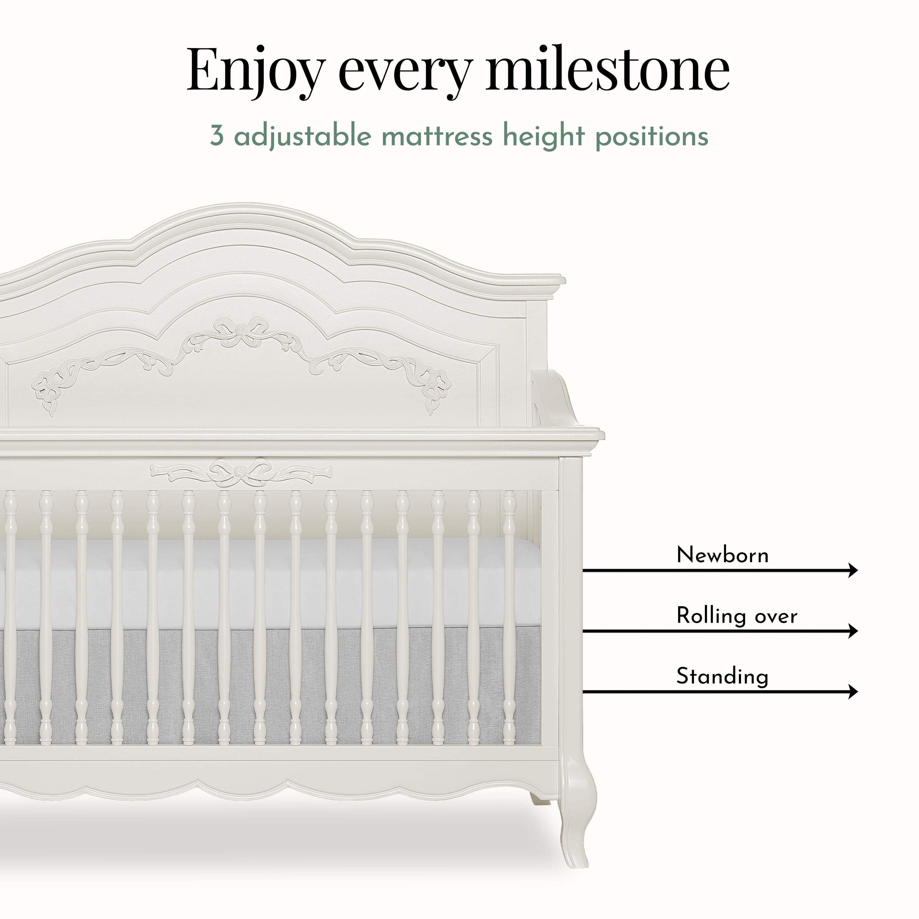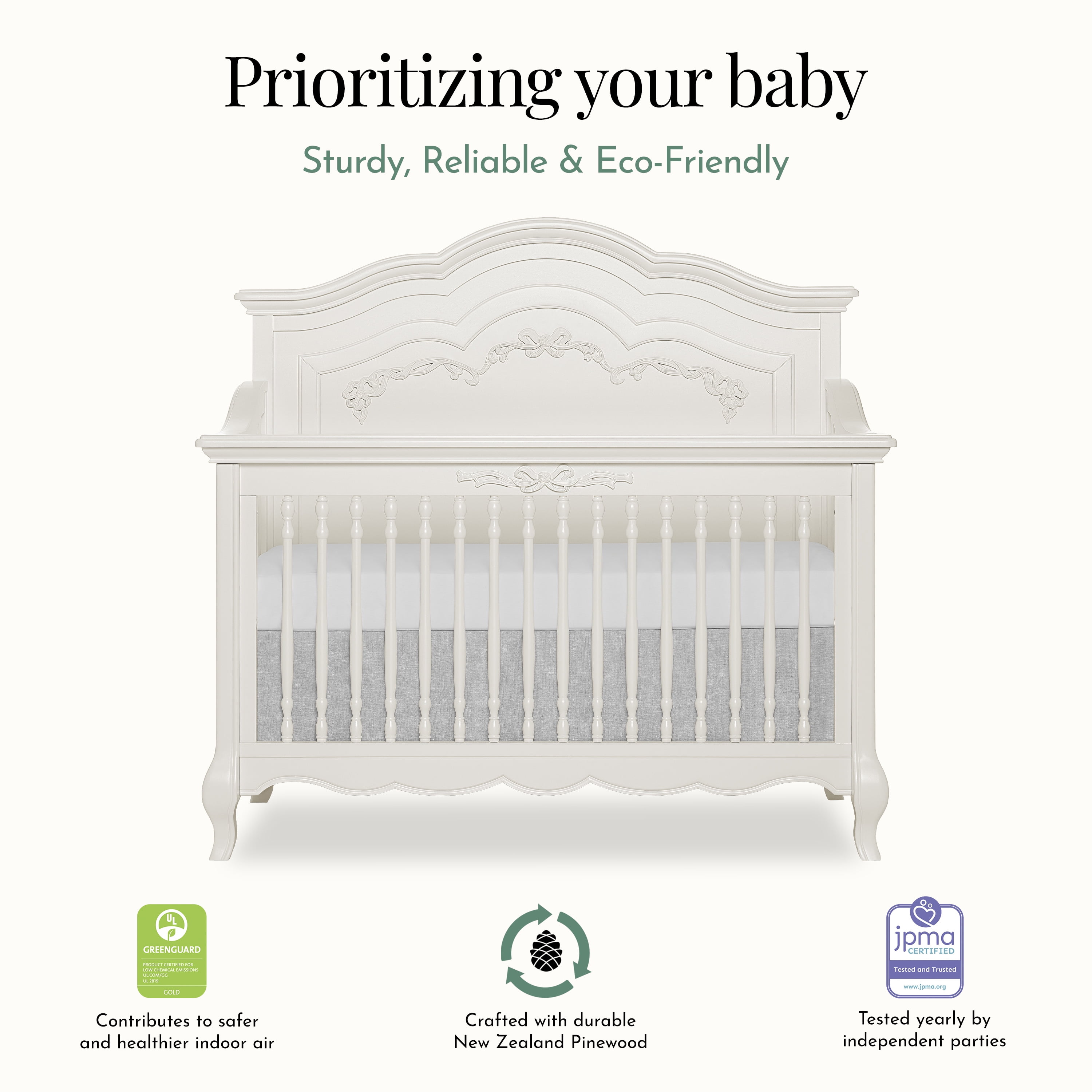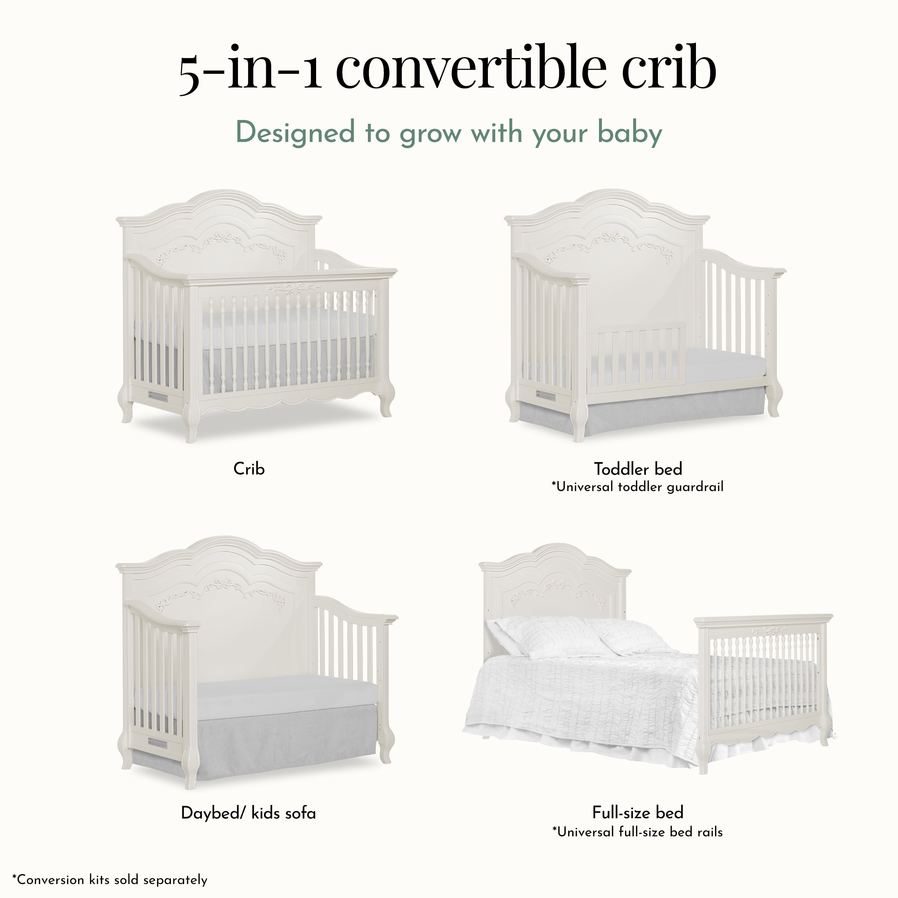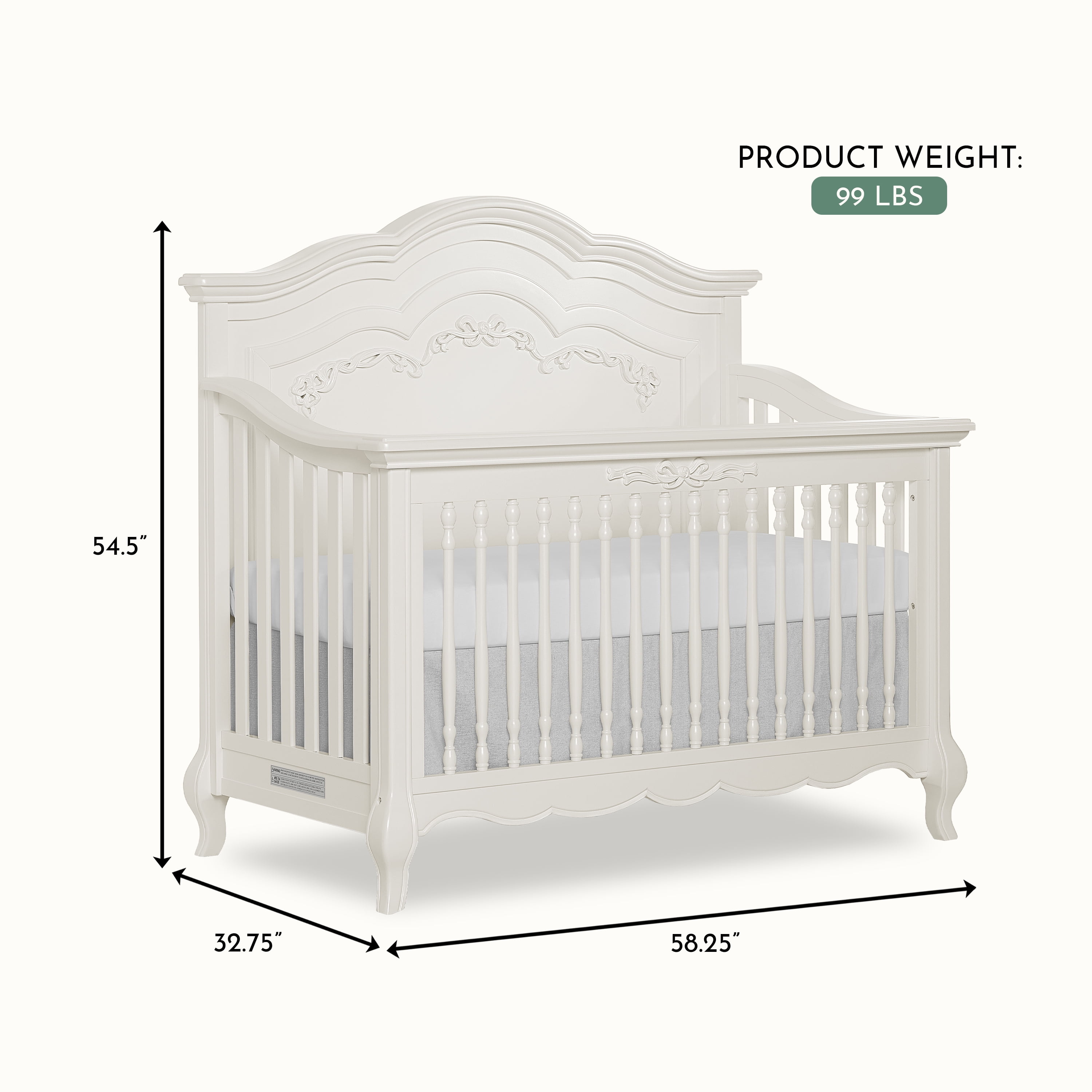EXQUISITE CRAFTSMANSHIP – Crafted from solid poplar wood with fine veneers, featuring an elegantly curved headboard, ribbon bow scrollwork, and Queen Anne-style feet for a regal touch. 5-IN-1 CONVERTIBILITY – Easily transforms into a toddler bed, daybed, and full-size bed (conversion kits sold separately) with three mattress height settings for adaptability. GREENGUARD GOLD CERTIFIED – Rigorously tested for thousands of chemicals and VOCs to provide a healthier sleep environment for your baby. SAFETY FIRST – Meets/exceeds CPSC, JPMA, and ASTM standards, ensuring top-tier safety. Independently tested for compliance with US and Canadian regulations. TIMELESS STYLE – Available in five elegant finishes to match any nursery theme. Pairs beautifully with the Evolur Aurora Double Dresser for a coordinated look (sold separately). Crib dimensions – 58.25″ L x 32.75″ W x 54.5″ H with a weight of 99 lbs. Each crib undergoes rigorous testing by independent laboratories for compliance with all US and Canadian crib regulation Fits standard size evolur crib mattress Also available in the evolur Aurora Collection are coordinating pieces such as the Aurora double dresser, Aurora Armoire, and Aurora nightstand that offers an ageless princess nursery set that grows with your child The Aurora is available in Ivory Lace, Blush Pink Pearl, and Akoya Grey Pearl colors