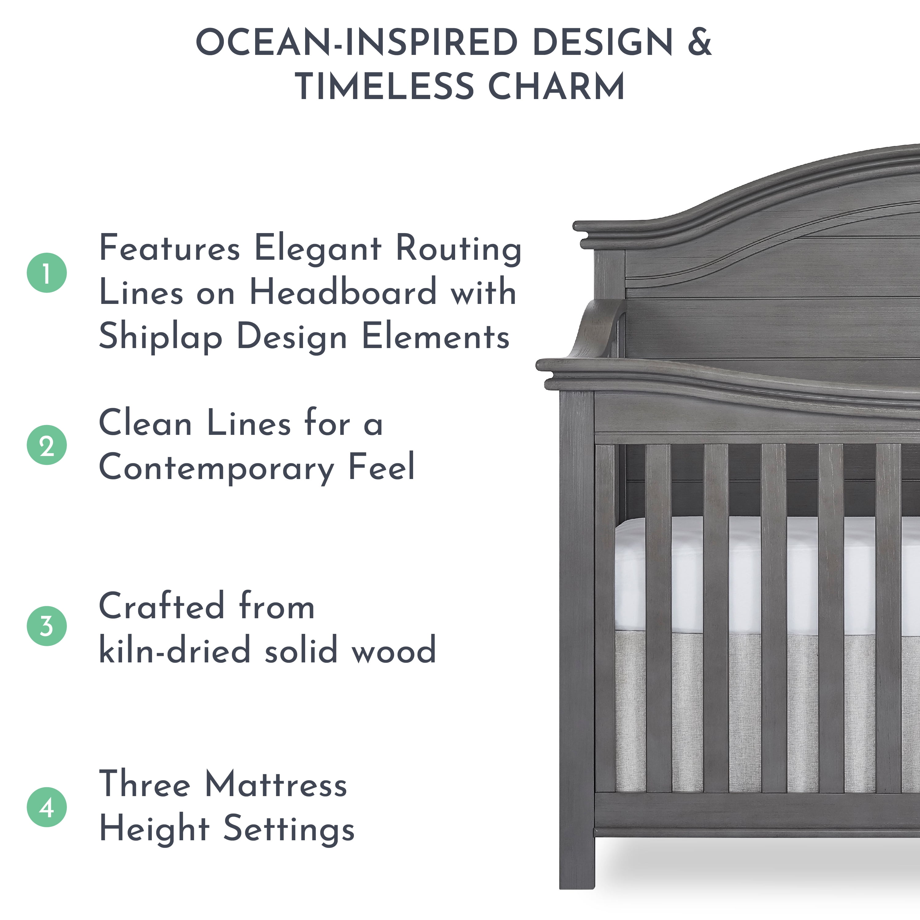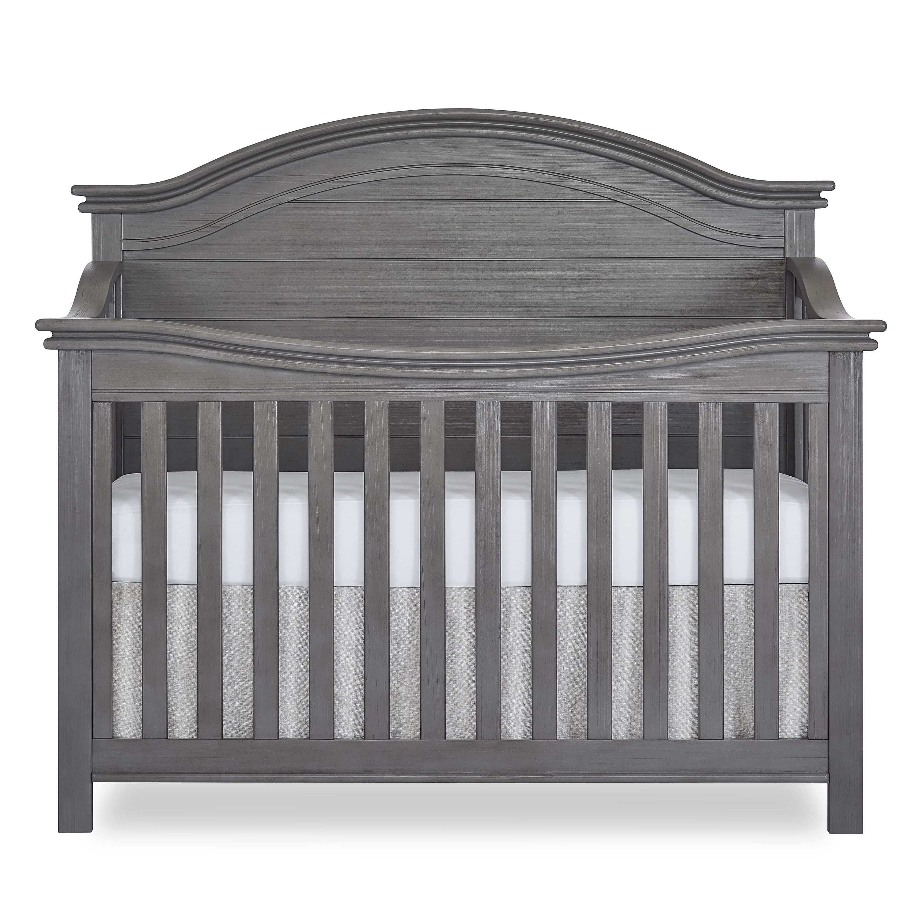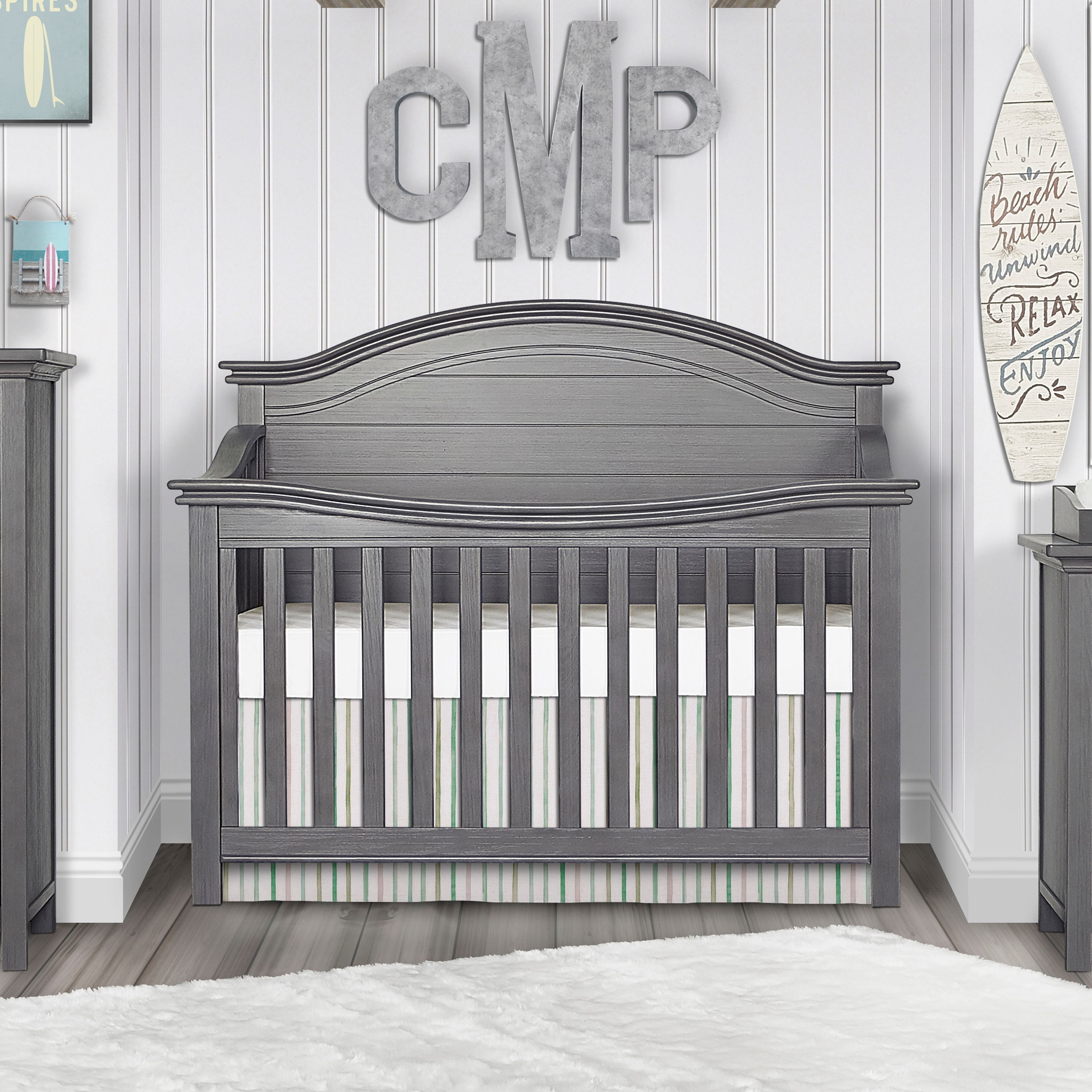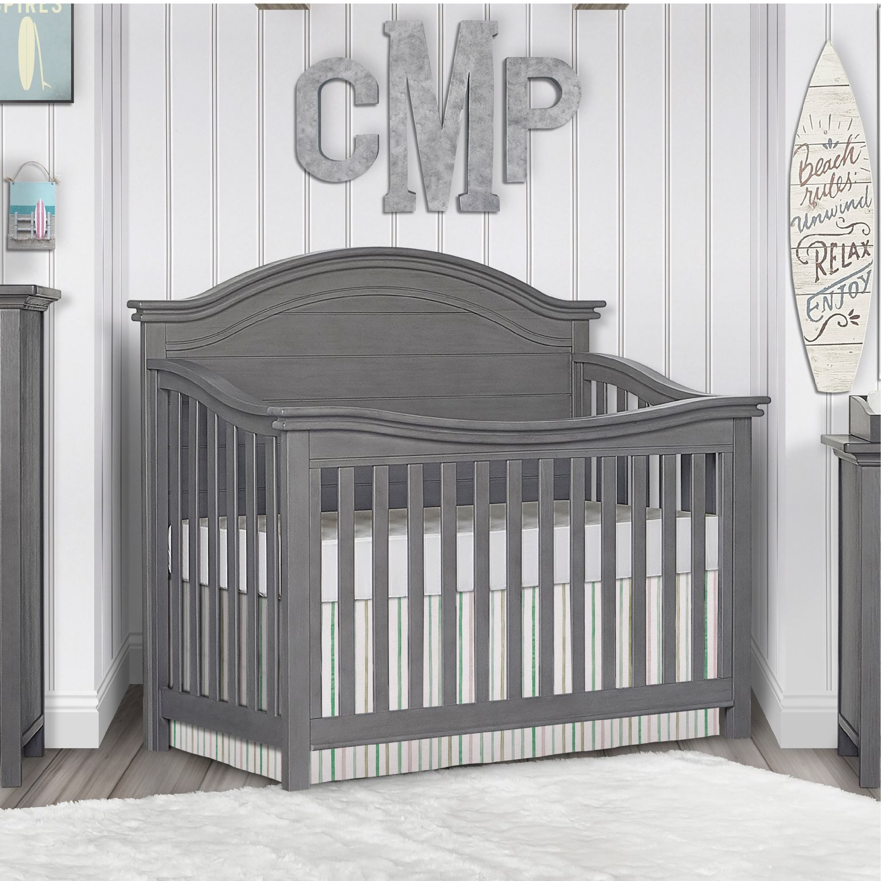 A tale of bonfires and sandcastles, beaches and seashells, the Evolur Belmar 5-in-1 Convertible Crib is inspired by coastal design Taking inspiration from the iconic Adirondack chairs that are found on the golden sands of our coasts, the Belmar 5-in-1 Convertible Crib features clean, simple lines, shiplap details, and routing lines Its gender-neutral and timeless styling makes it an excellent fit for a variety of decor themes Constructed out of kiln-dried hardwood with hardwood veneers, the Belmar is built to last and is truly a lifetime investment. We believe in creating furniture that evolves with your growing child The Belmar 5-in-1 Convertible Crib does exactly that The Belmar features 3 mattress height settings that can be adjusted depending on your child Set it at its highest setting during the newborn months and lower it as your child starts to pull up and stand It converts to a toddler bed with our conversion kit (sold separately) and daybed Add our wooden bed frame (sold separately) to convert it into a full-size bed . The Belmar is available in two sophisticated finishes – Rustic Grey and Weathered White, and in two designs – Flat Top and Curved Top At Evolur, safety is always our No 1 priority – This crib is Greenguard Gold certified which means that it has been tested for thousands of chemicals and VOCs and helps in providing a safe and healthy environment for your baby and family Our cribs are built to the highest safety standards that meet/exceed those set by the CPSC, JPMA, and ASTM . Each of our cribs undergoes rigorous testing by independent laboratories for compliance with all US and Canadian crib regulations Pick coordinating pieces from our Evolur Belmar Collection like the Double Dresser, Tall Chest, Hutch, and Nightstand to create a timeless nursery . For the best mattress fit, we recommend any Dream on Me or Evolur standard, full-size, non-toxic, Greenguard certified crib mattress (sold separately)