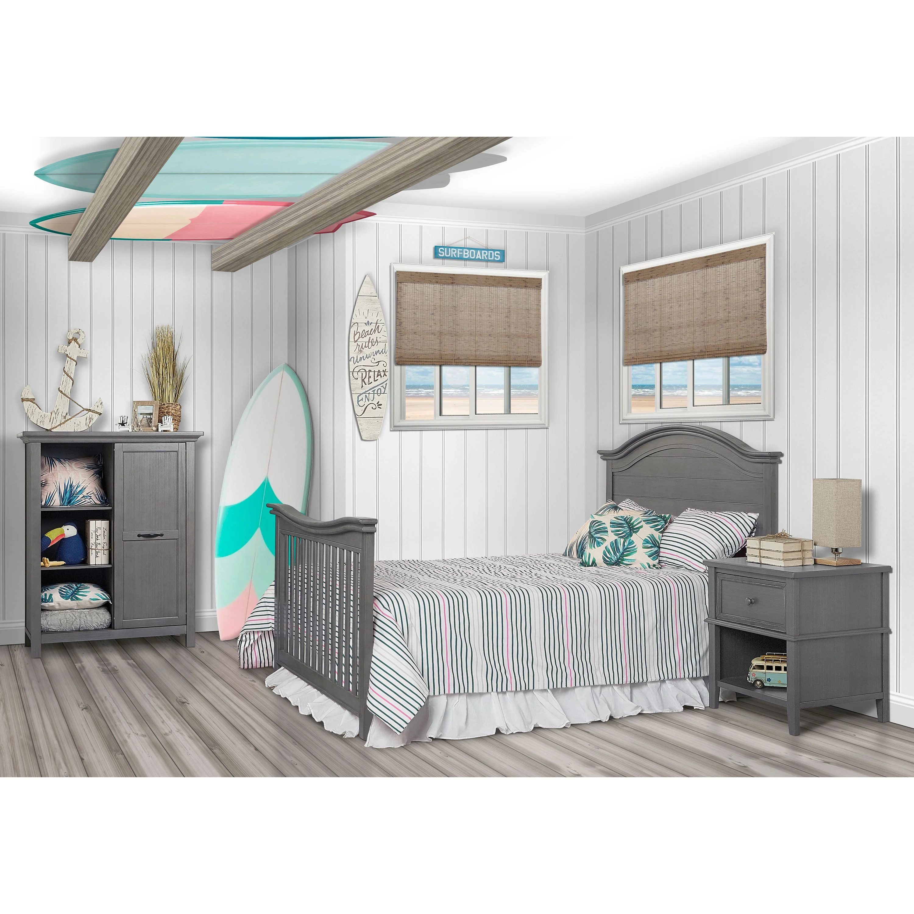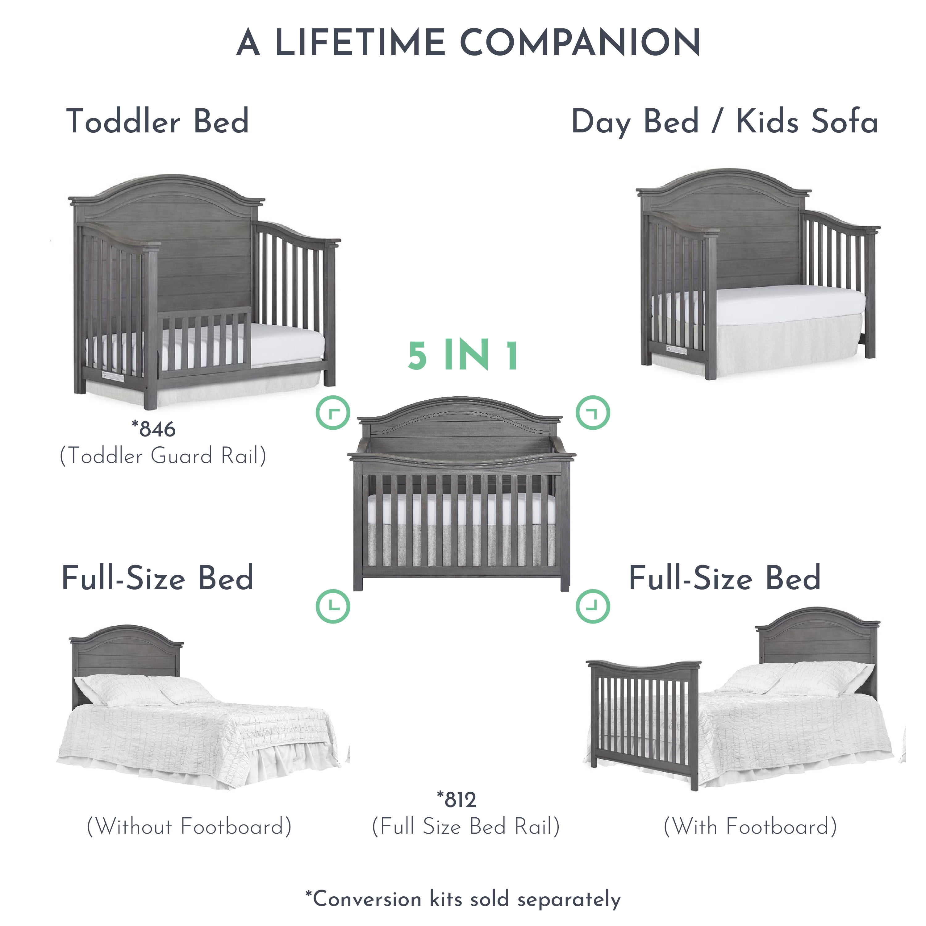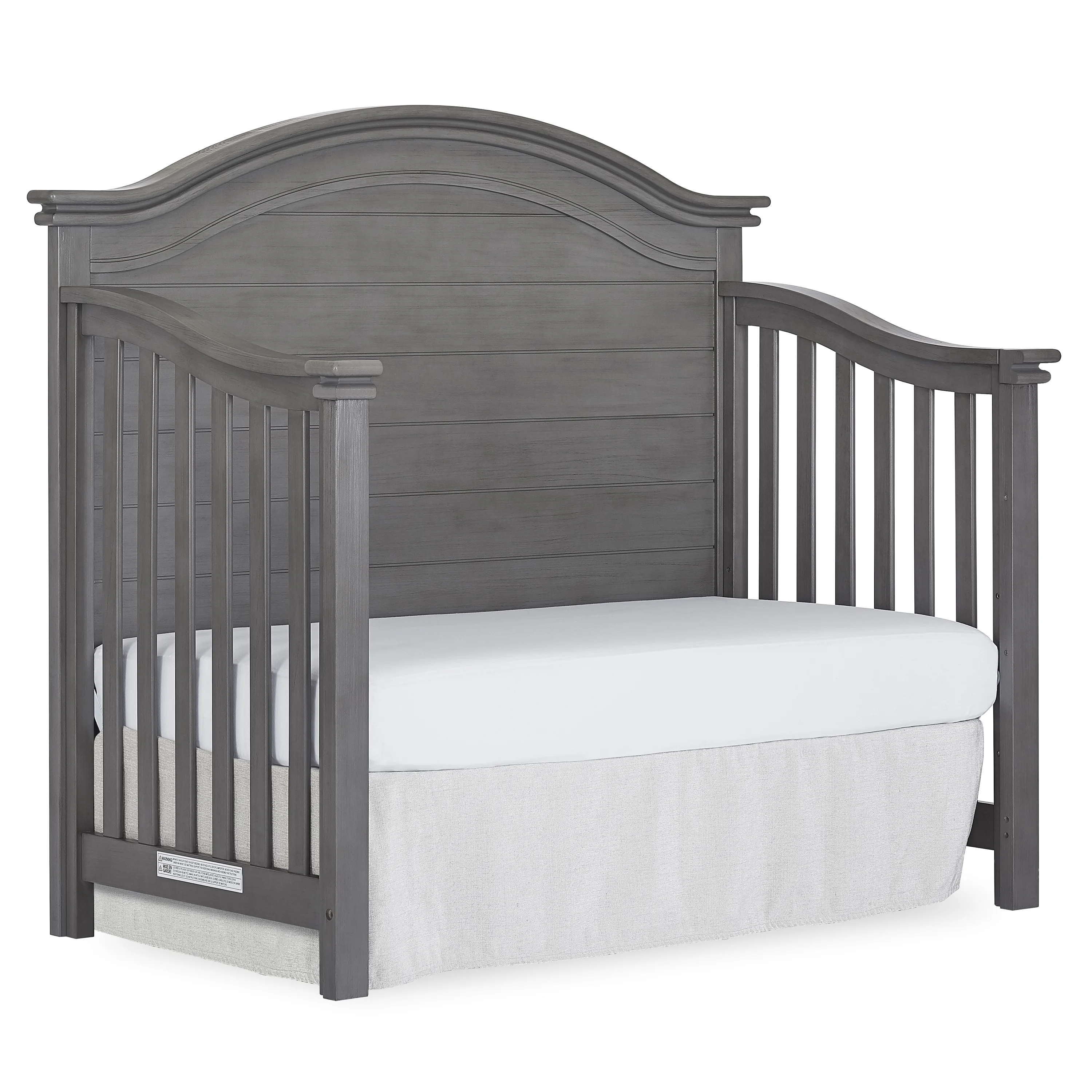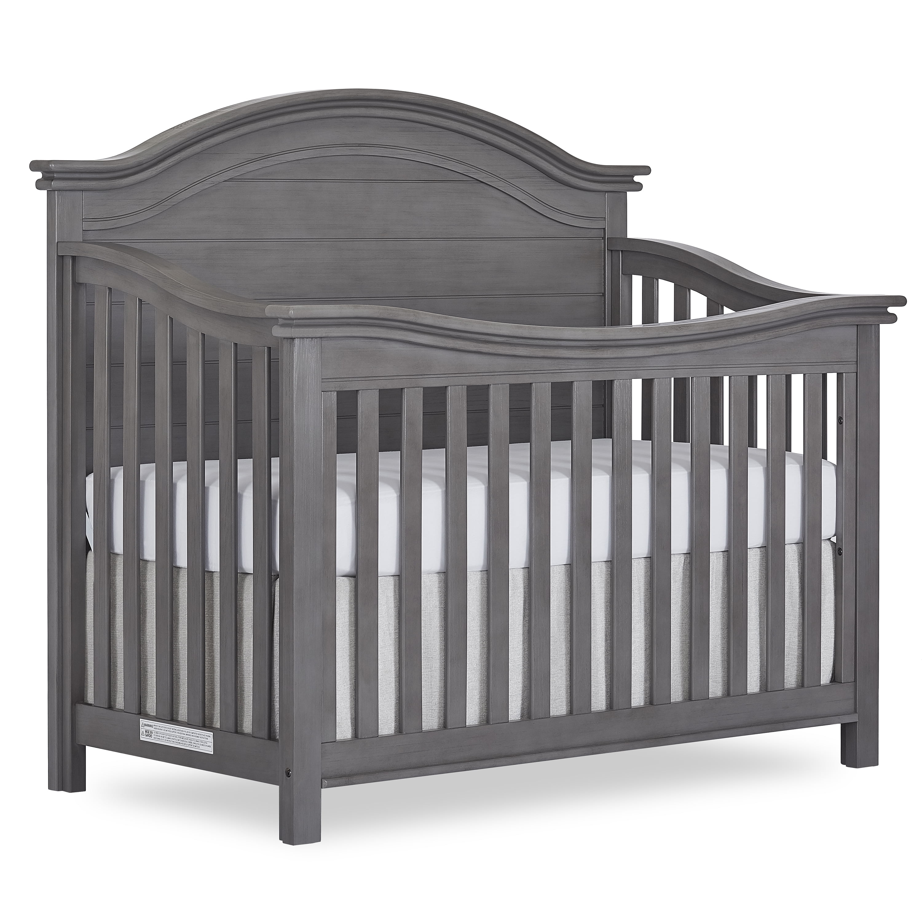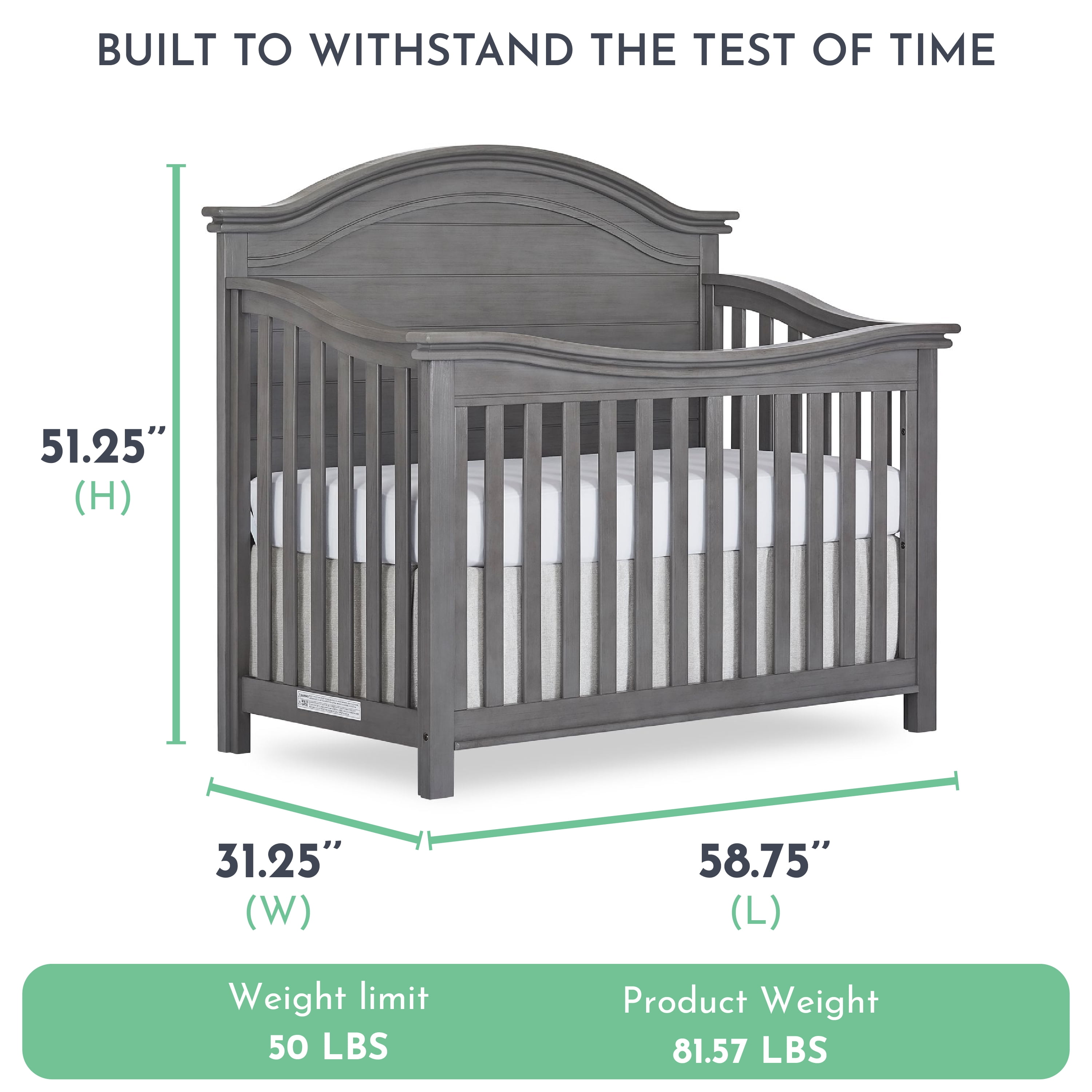 A tale of bonfires and sandcastles, beaches and seashells, the Evolur Belmar 5-in-1 Convertible Crib is inspired by coastal design Taking inspiration from the iconic Adirondack chairs that are found on the golden sands of our coasts, the Belmar 5-in-1 Convertible Crib features clean, simple lines, shiplap details, and routing lines Its gender-neutral and timeless styling makes it an excellent fit for a variety of decor themes Constructed out of kiln-dried hardwood with hardwood veneers, the Belmar is built to last and is truly a lifetime investment. We believe in creating furniture that evolves with your growing child The Belmar 5-in-1 Convertible Crib does exactly that The Belmar features 3 mattress height settings that can be adjusted depending on your child Set it at its highest setting during the newborn months and lower it as your child starts to pull up and stand It converts to a toddler bed with our conversion kit (sold separately) and daybed Add our wooden bed frame (sold separately) to convert it into a full-size bed . The Belmar is available in two sophisticated finishes – Rustic Grey and Weathered White, and in two designs – Flat Top and Curved Top At Evolur, safety is always our No 1 priority – This crib is Greenguard Gold certified which means that it has been tested for thousands of chemicals and VOCs and helps in providing a safe and healthy environment for your baby and family Our cribs are built to the highest safety standards that meet/exceed those set by the CPSC, JPMA, and ASTM . Each of our cribs undergoes rigorous testing by independent laboratories for compliance with all US and Canadian crib regulations Pick coordinating pieces from our Evolur Belmar Collection like the Double Dresser, Tall Chest, Hutch, and Nightstand to create a timeless nursery . For the best mattress fit, we recommend any Dream on Me or Evolur standard, full-size, non-toxic, Greenguard certified crib mattress (sold separately)