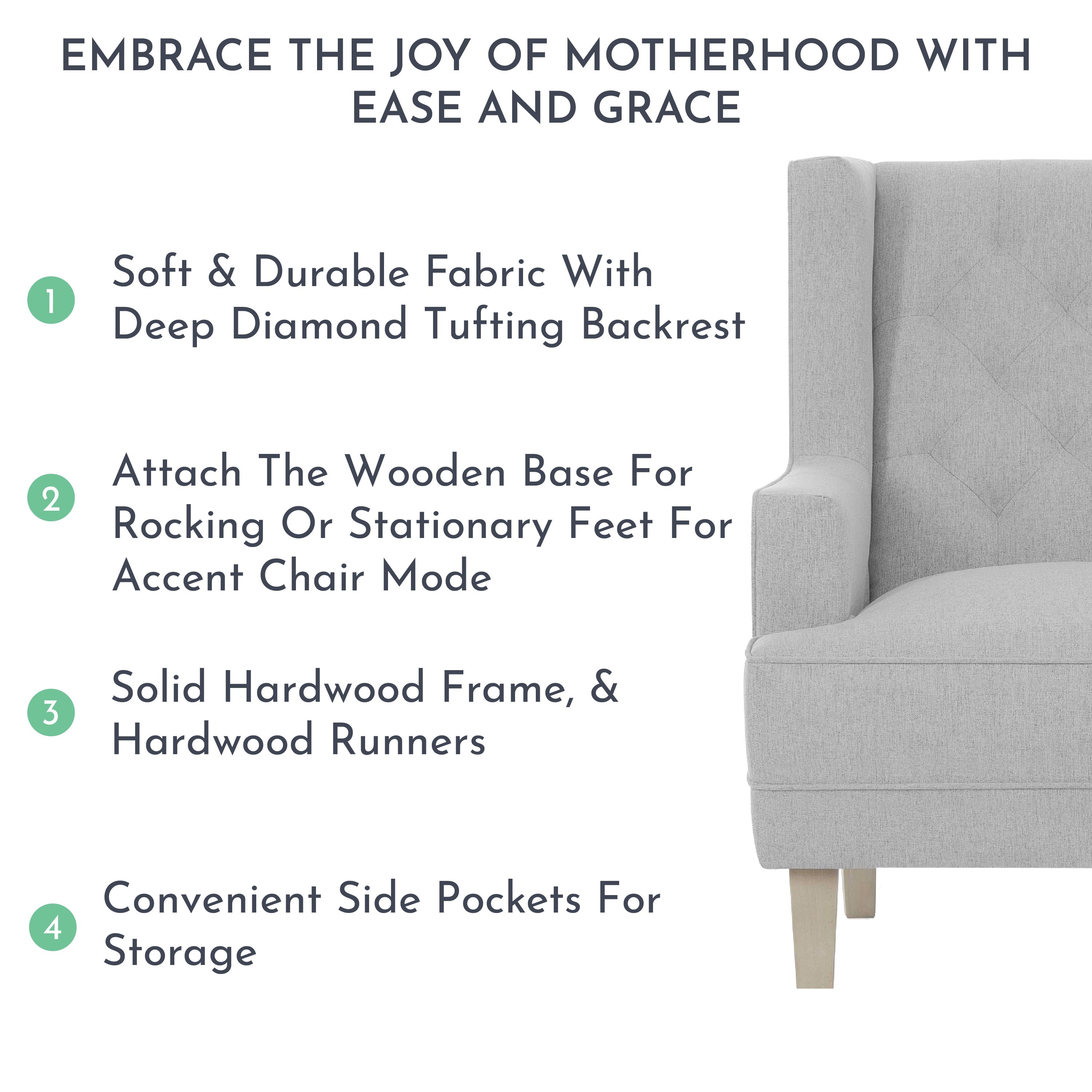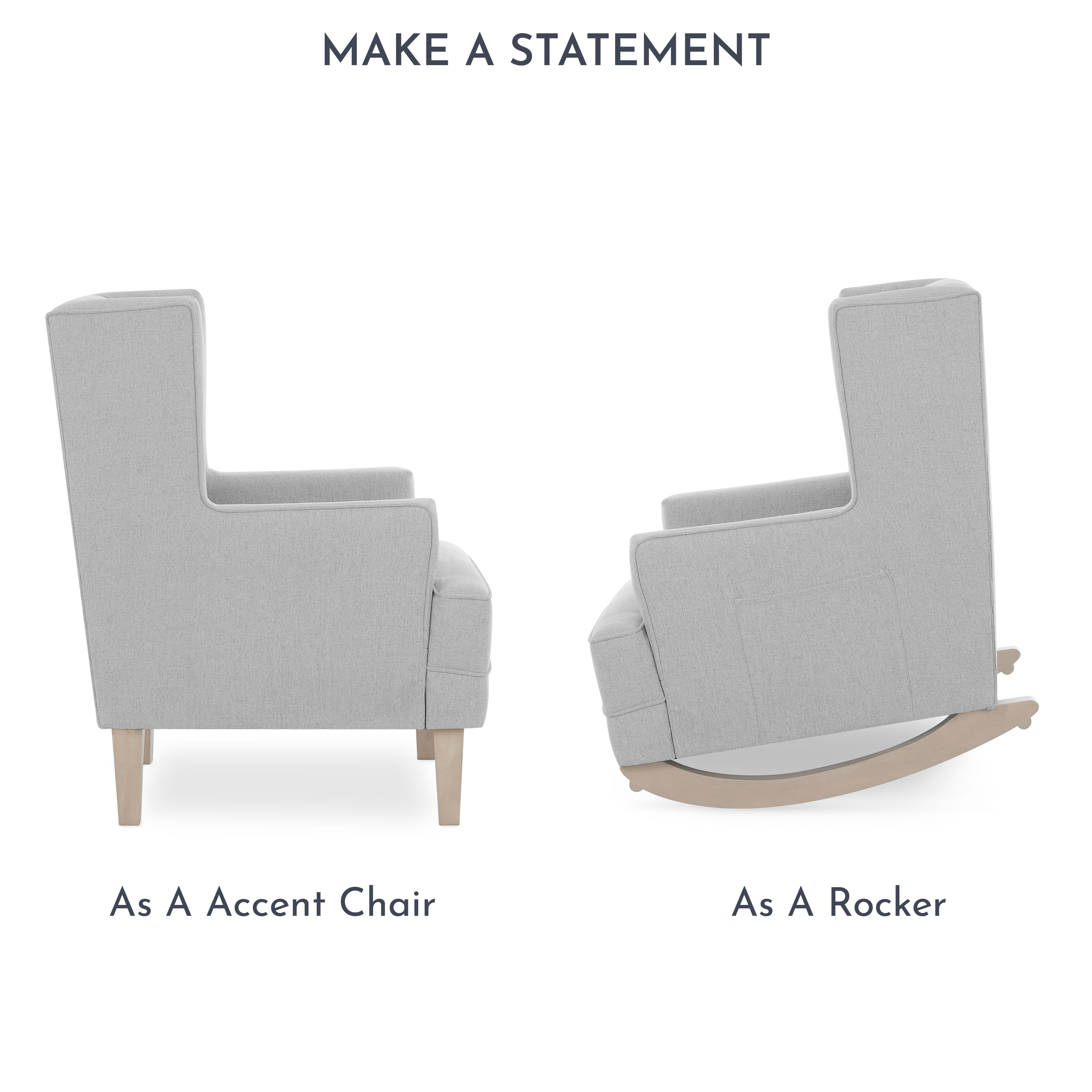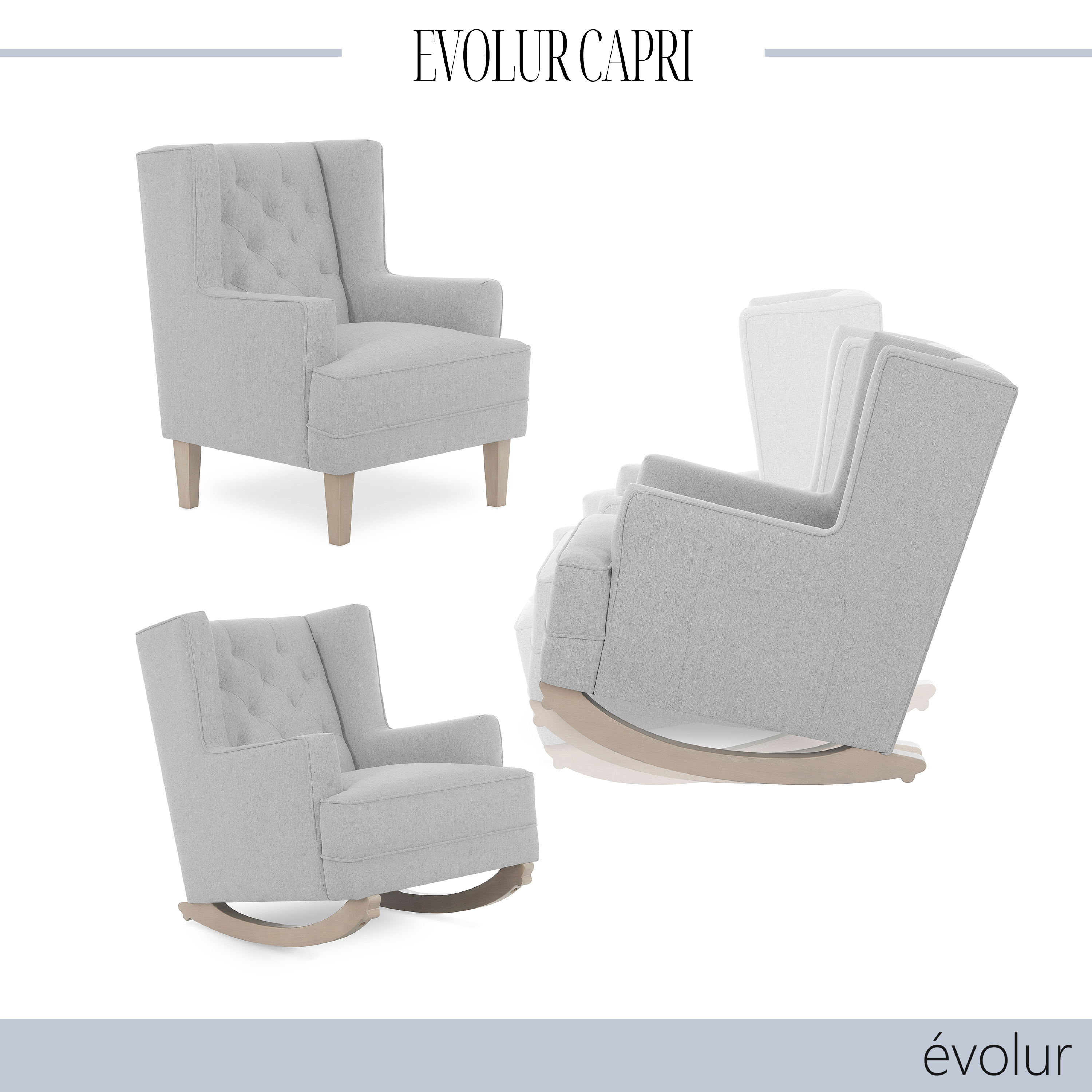 Evolur Capri Wingback 2-In-1 Rocker And Accent Chair I Modern Convertible Chair I Tufted Rocker I Bonus Convertible Feet I Accent Chair, Harbor SEATING SOLUTION: Wingback style rocker, High backrest offers head and neck support, which makes it easier to relax. DESIGNED FOR PARENT AND BABY: Wooden base that allows for a smooth and rocking motion and forward and backward gliding so you can be comfortable as you feed or rock your baby to sleep EASY SET UP: Some customer assembly required STURDY BUILD: Built to stand the test of time, the fabric is super soft to the touch, durable and easy to clean. Tested for safety and expertly crafted for durability. This chair can be converted into a stylish accent chair with the stationary feet (Included) FARMHOUSE DESIGN: Chair features clean lines with welt trim Upholstered in easy-to-clean fabric Perfect for the nursery, living room, bedroom I Side pocket for storage
