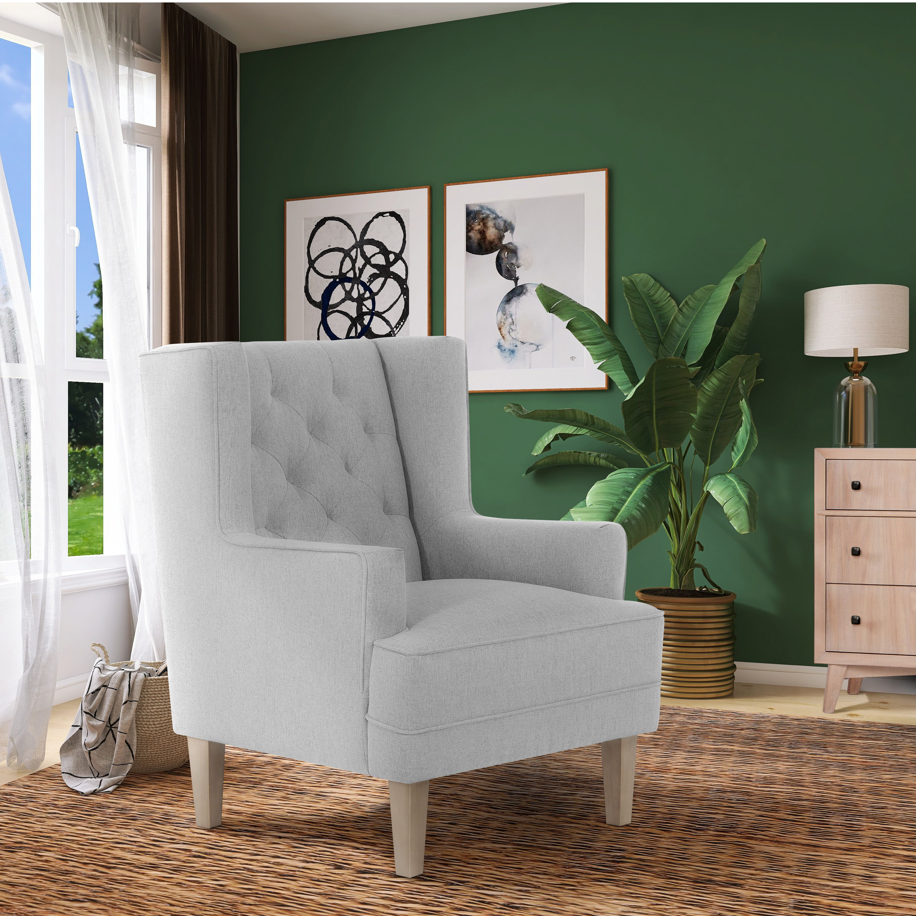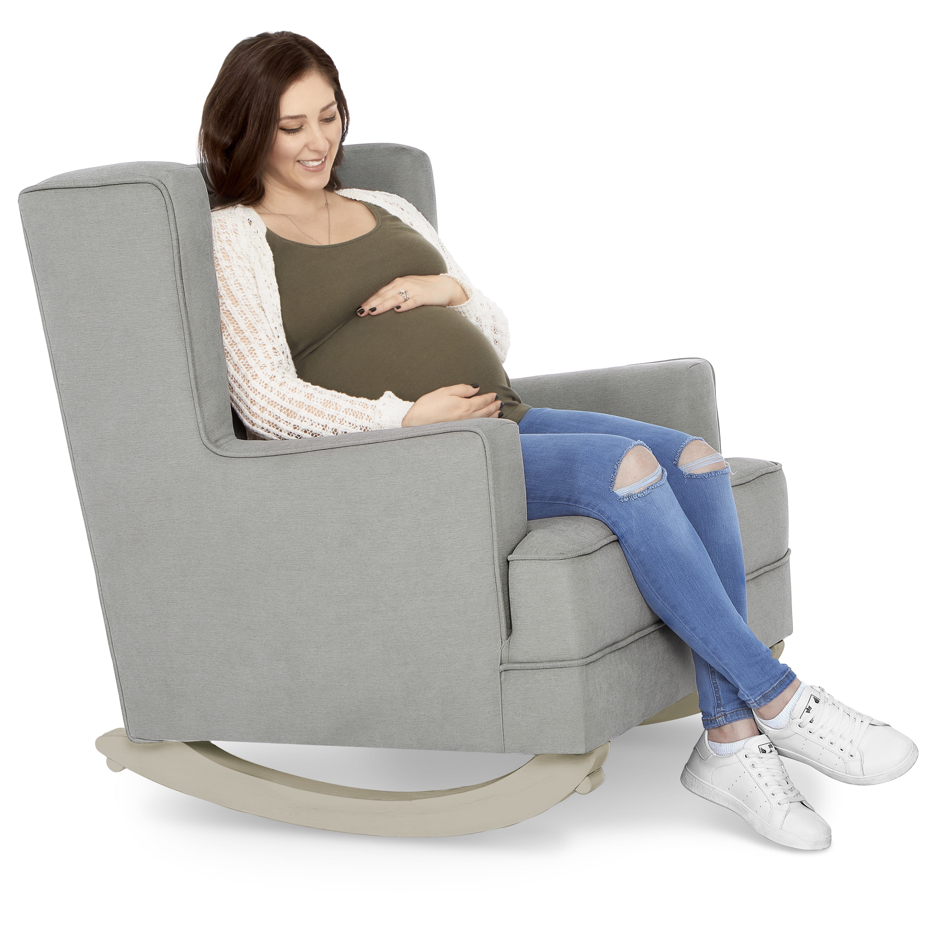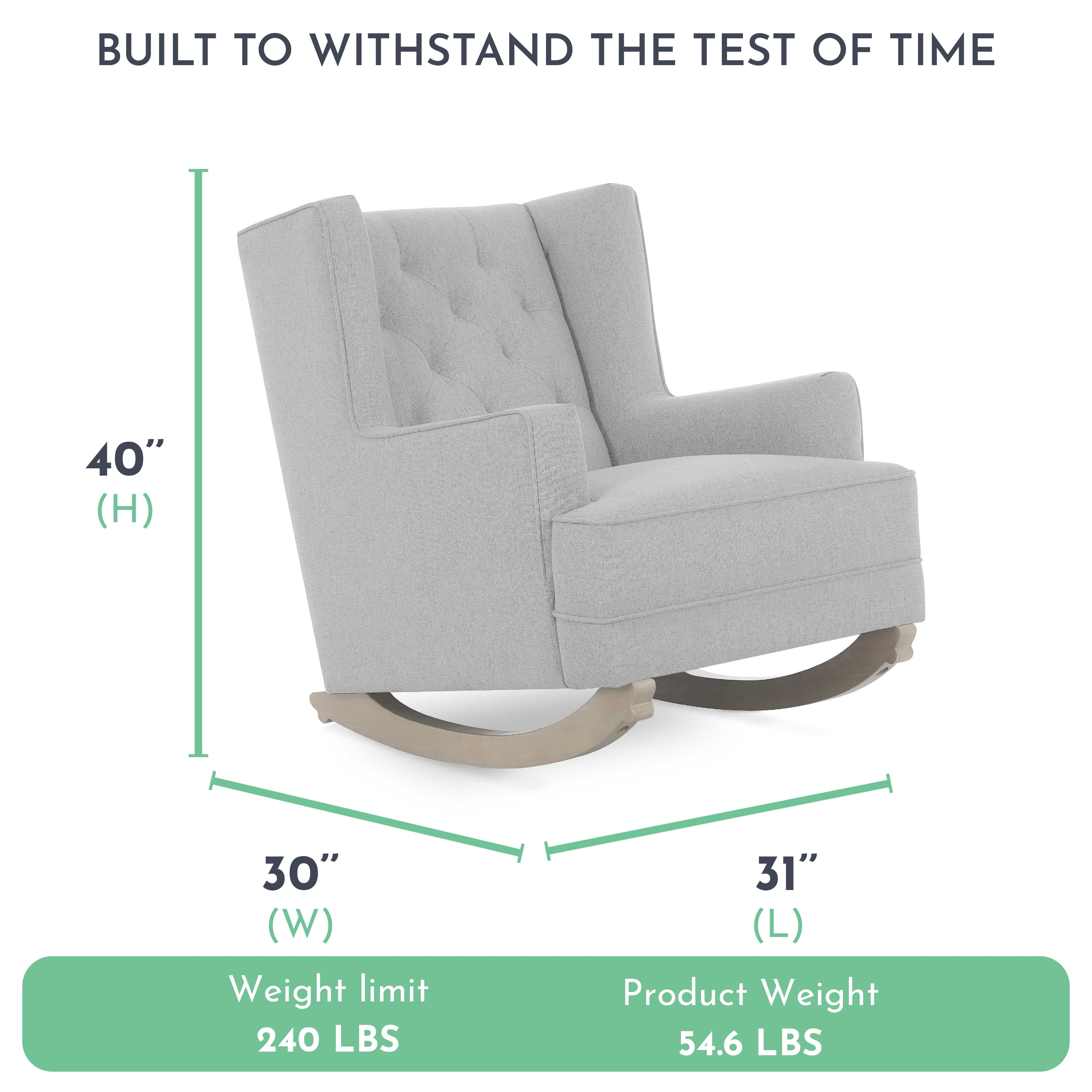 Evolur Capri Wingback 2-In-1 Rocker And Accent Chair I Modern Convertible Chair I Tufted Rocker I Bonus Convertible Feet I Accent Chair, Harbor SEATING SOLUTION: Wingback style rocker, High backrest offers head and neck support, which makes it easier to relax. DESIGNED FOR PARENT AND BABY: Wooden base that allows for a smooth and rocking motion and forward and backward gliding so you can be comfortable as you feed or rock your baby to sleep EASY SET UP: Some customer assembly required STURDY BUILD: Built to stand the test of time, the fabric is super soft to the touch, durable and easy to clean. Tested for safety and expertly crafted for durability. This chair can be converted into a stylish accent chair with the stationary feet (Included) FARMHOUSE DESIGN: Chair features clean lines with welt trim Upholstered in easy-to-clean fabric Perfect for the nursery, living room, bedroom I Side pocket for storage