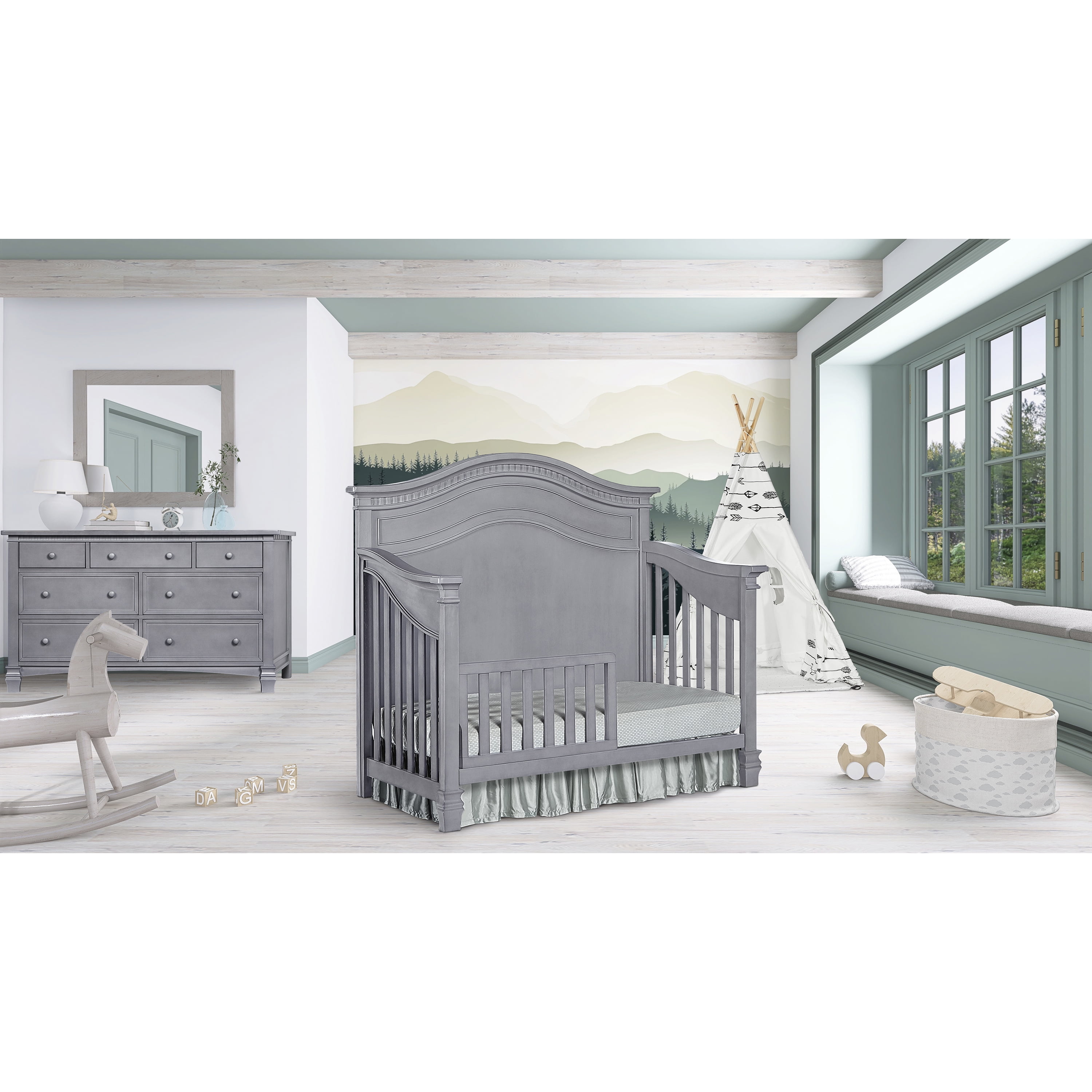 The Cheyenne is crafted out of Kiln-dried hardwood with fine veneers. The Cheyenne is designed with contemporary routing in an elegant framed high arch headboard;, showcasing traditional dentil molding, fluting and imperial feet create a design that is both timeless and thoroughly modern. Features hidden hardware with a 3 mattress height setting to accommodate your growing baby and fixed stationary sides rails. The Cheyenne converts to a charming toddler bed with our conversion kit ( sold separately ), daybed and the back panel converts to a full-size headboard with the simple addition of our wooden bed frame ( sold separately) Our cribs are designed and engineered to the highest safety standard that meets and exceeds those set by the Consumer Product Safety Commission and American Society for testing and materials. Each of our cribs undergoes rigorous testing by independent laboratories for compliance with all US and Canadian crib regulation. Fits standard size evolur crib mattress Also available in the evolur Cheyenne Collection are coordinating piece such as the Cheyenne Double Dresser, Cheyenne 6 Drawer Dresser, Cheyenne nightstand that offers an ageless nursery set that grows with your child. This collection is available in Vintage Gray, storm Gray and Distressed White colors