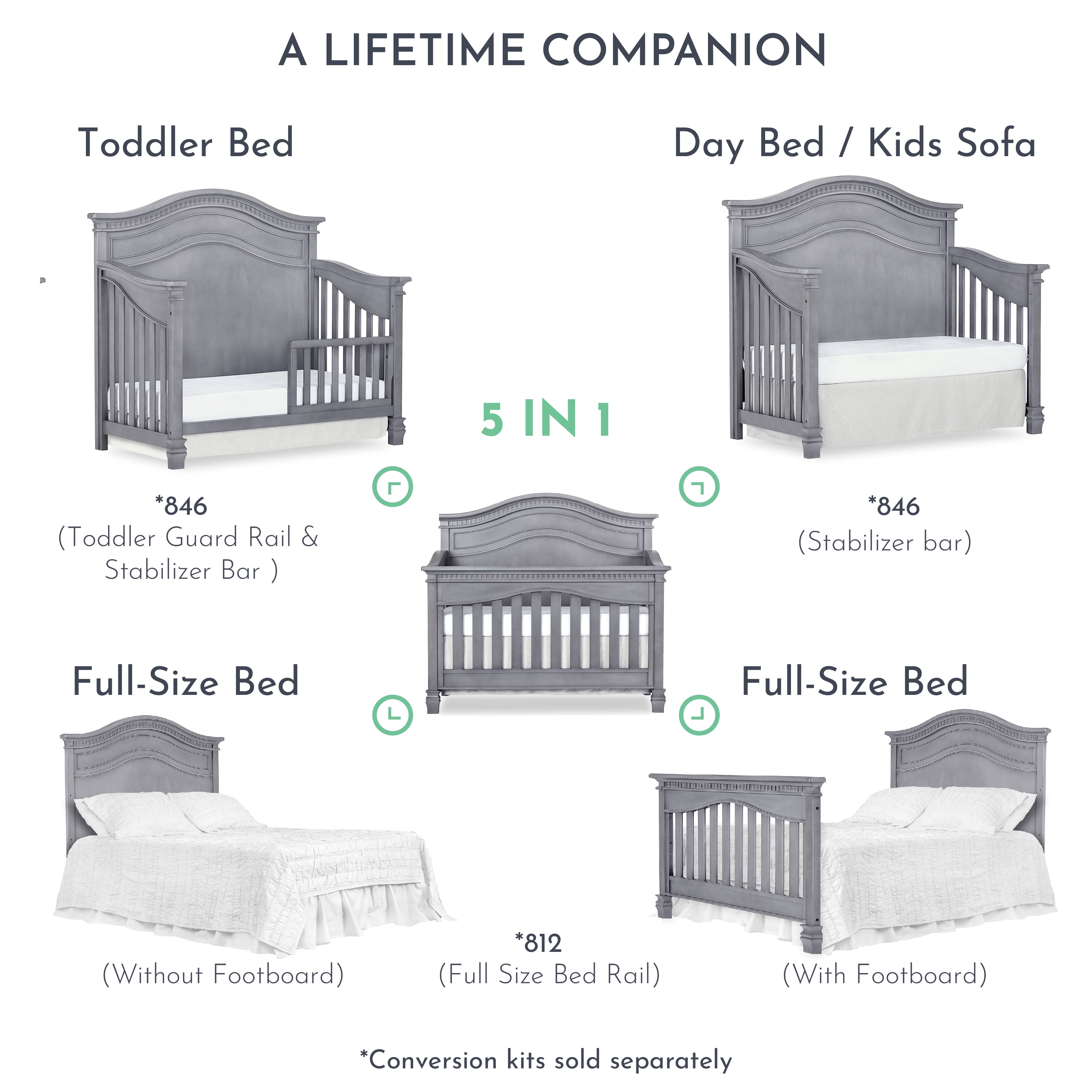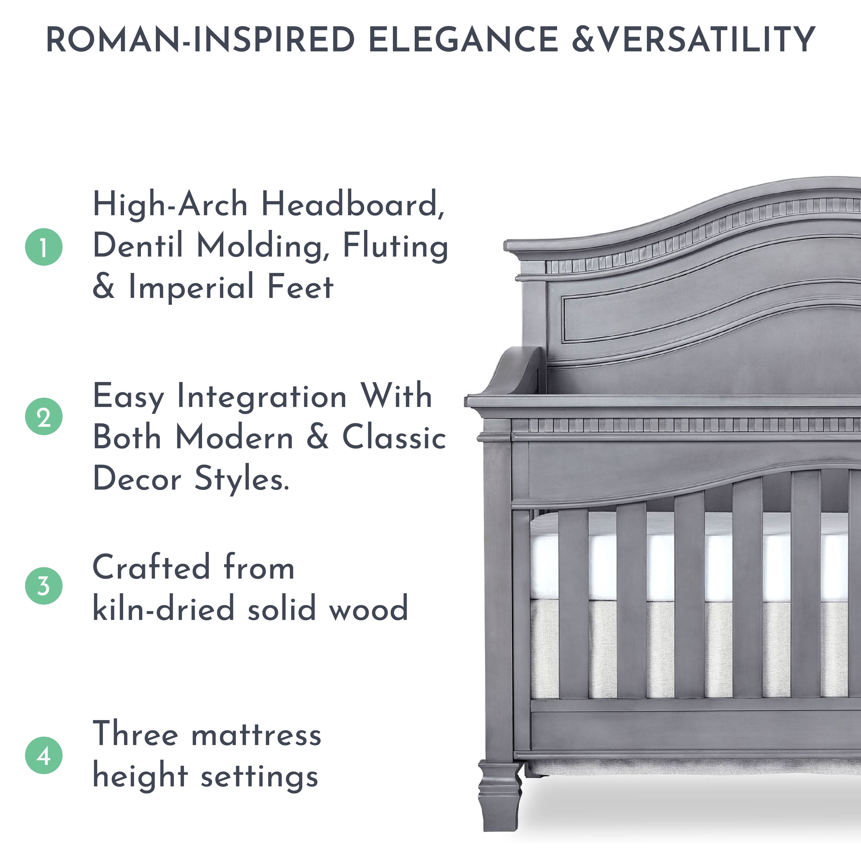 Inspired by Roman architecture, the Cheyenne 5-in-1 convertible crib incorporates contemporary routing in an elegant framed high arch full panel headboard, showcasing traditional dentil molding, fluting, and imperial feet to create a design that is both timeless and thoroughly modern. The Cheyenne 5-in-1 collection offers long-term value paired with its matching Double Dresser, Chest, Hutch/Bookcase, and Nightstand, to complete your nursery. The Cheyenne converts to a charming toddler bed with our conversion kit (sold separately), daybed and the back panel converts to a full-size headboard with the simple addition of our wooden bed frame (sold separately).