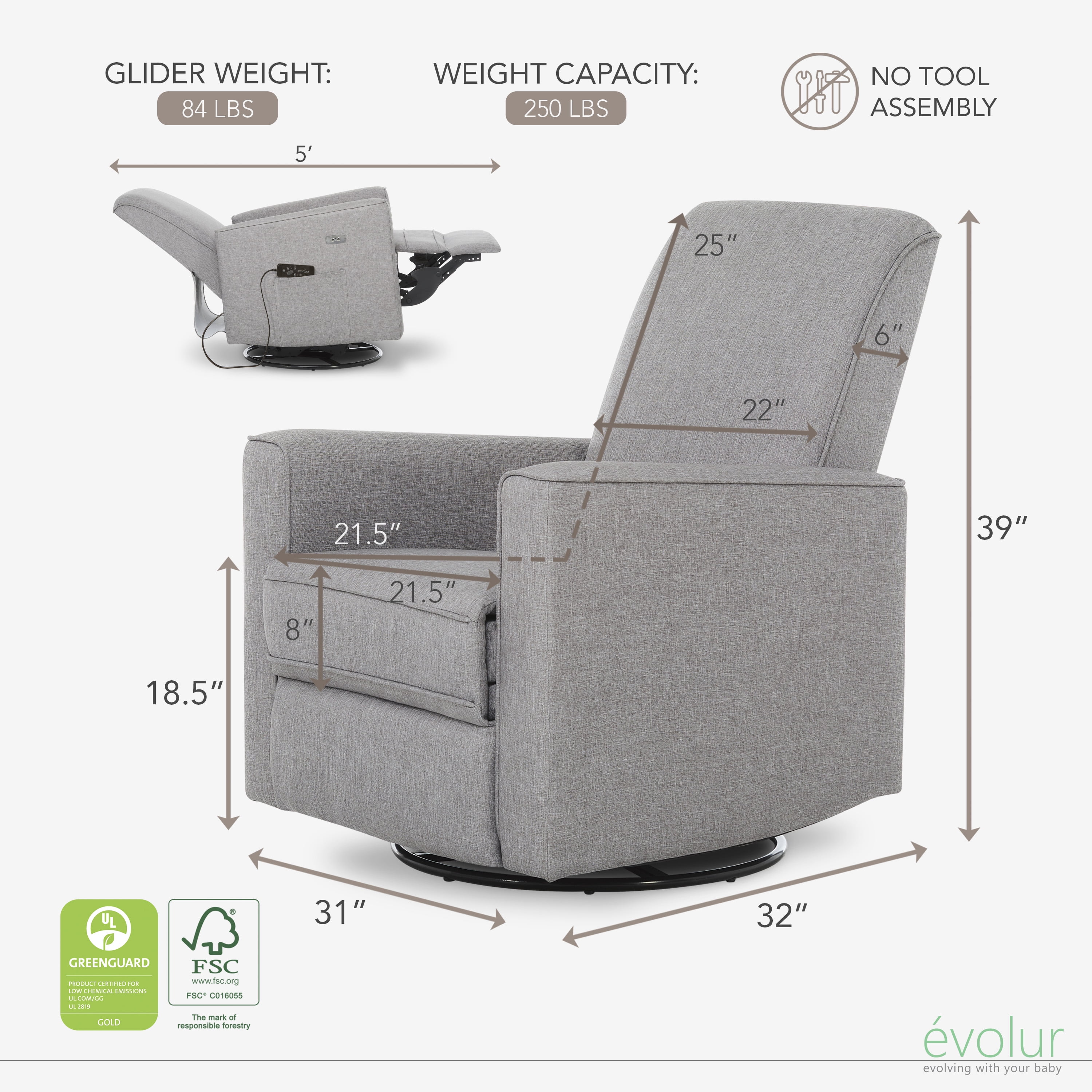 Embrace comfort as you sink into the Harlow. A no-tool assembly, it has ergonomic backrest support, multiple reclining positions, comfortable side rests, 240° swivel, and smooth gliding and rocking motions, designed to provide full comfort to your body Reclining has never been this easy, thanks to Harlow’s convenient electronic push-button panel on the armrest. There is also a built-in USB port (power cord included) to ensure your electronics are always charged and at hand Bye-Bye Back Pain: With an inbuilt, massager in the backrest, it comes with remote control, eight different massage modes The Harlow has a solid metal base that easily supports 240-degree swivel rotation and gliding capabilities. It is covered with an easy to clean durable polyester fabric with foam filling and has convenient side pockets The Harlow weighs 84 lbs and has a weight capacity of 250 lbs. Product dimensions are 31L x 32W x 39H inches. It meets all CA TB117-2013 flammability requirements and has a 1-year Limited Manufacturer’s Warranty with Greenguard Gold Certified Crowned as the Rocking Chair Product of the Year by Baby Innovations Awards 2023, experience ultimate relaxation with the Harlow Glider.