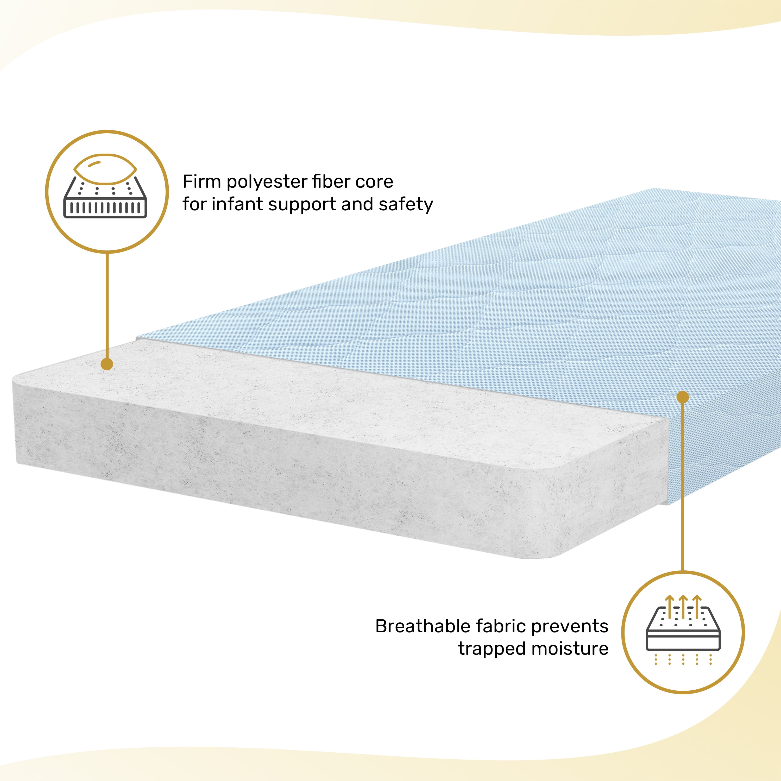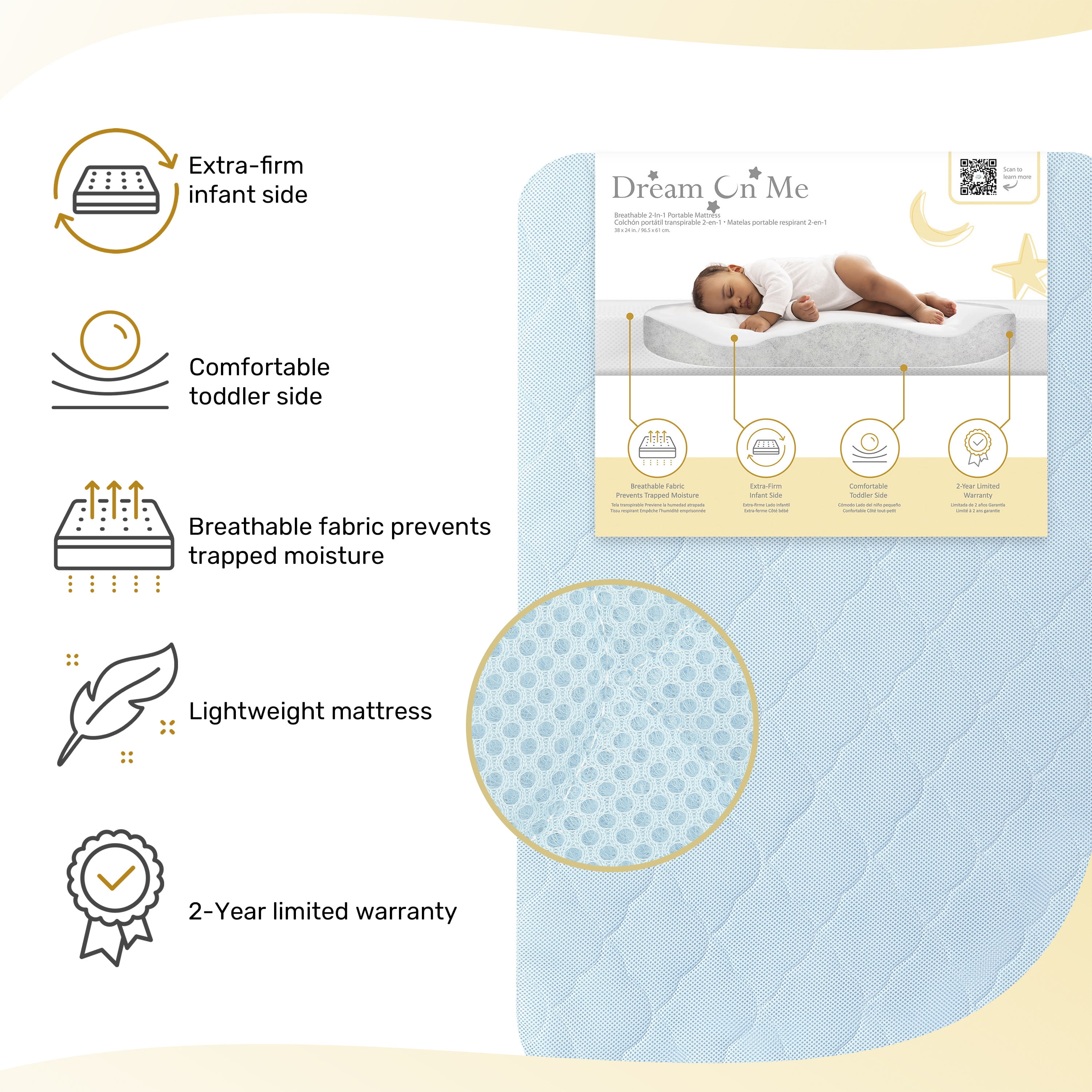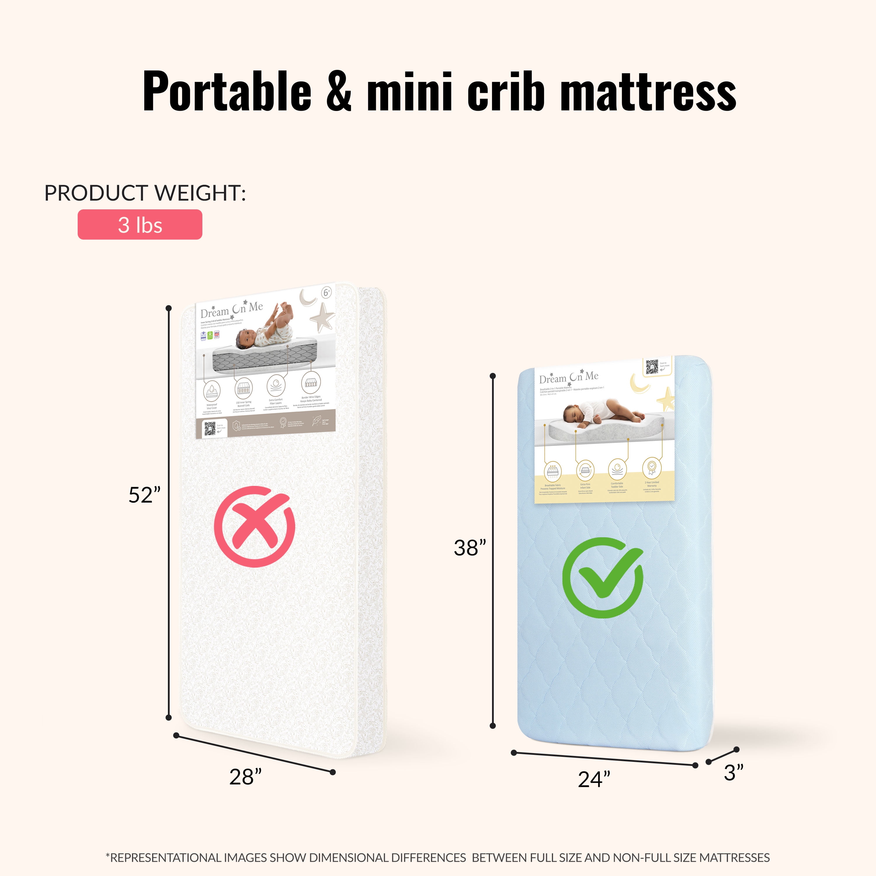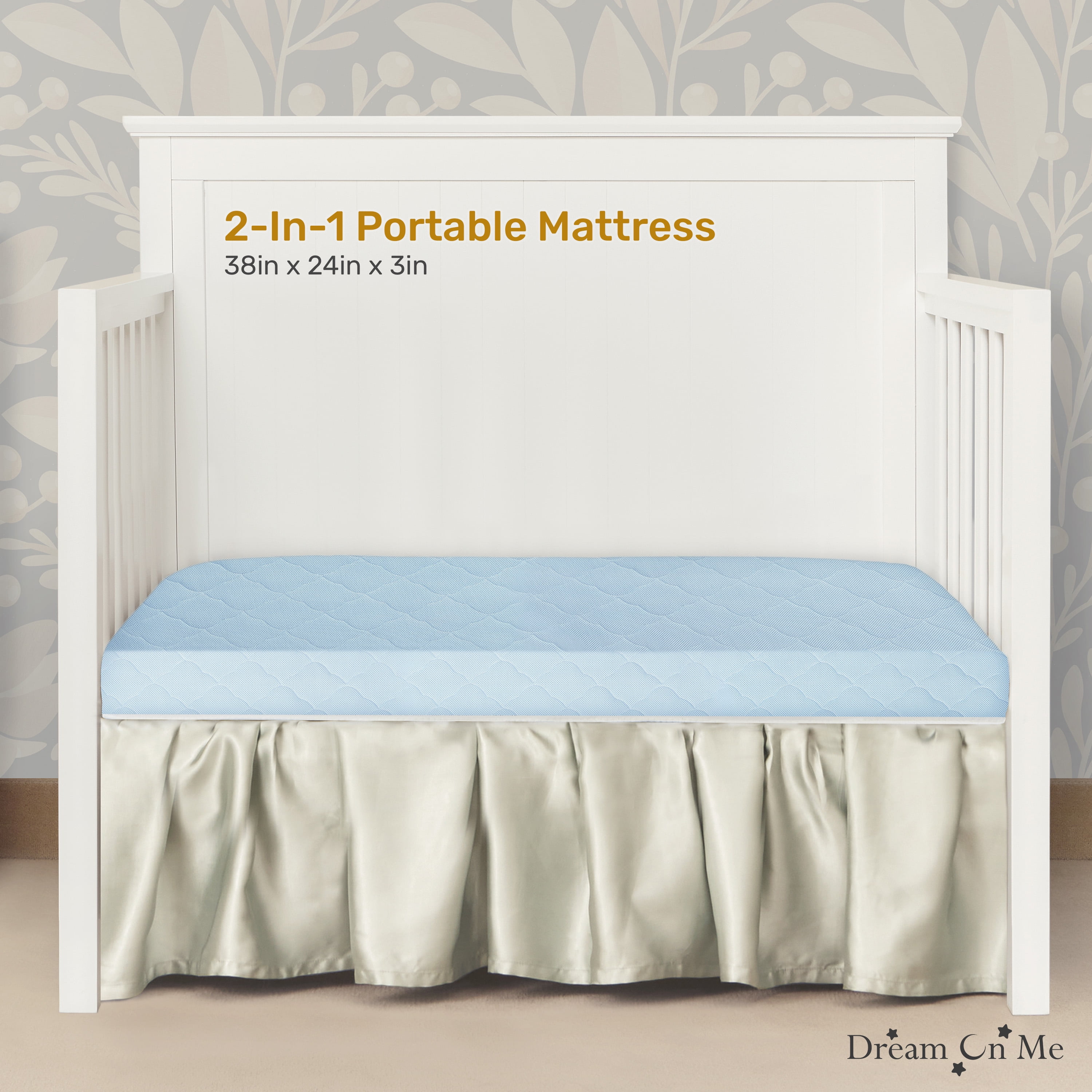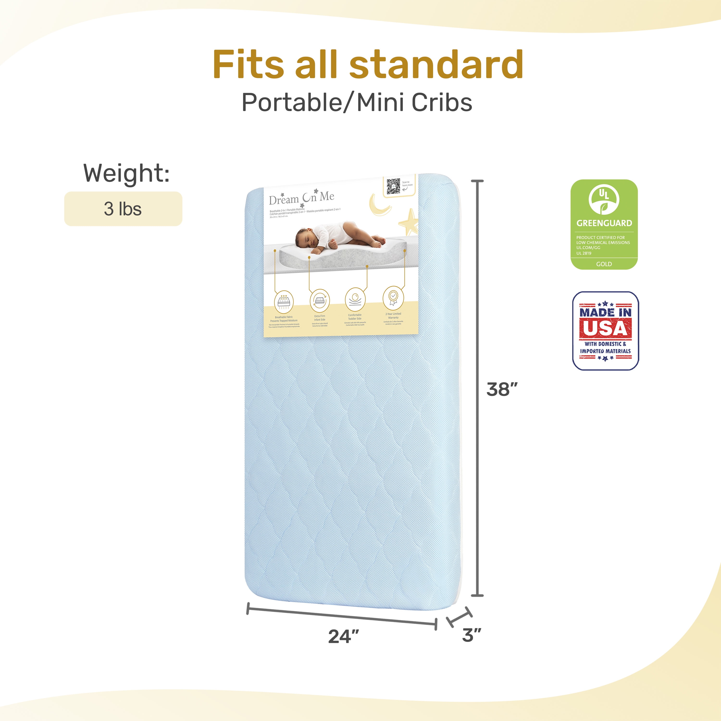 “DOUBLE THE COMFORT: Designed for your newborn and infant, our 2-in-1 dual-sided mattress offers the perfect balance of support and comfort. The extra-firm newborn side provides optimal support, while the plush comfort side is gentle and cozy for your growing infant. SAFETY FIRST: This thoughtfully designed mattress is JPMA and Greenguard Gold Certified, meeting the strictest safety standards for your peace of mind. THOUGHTFULLY DESIGNED: The Evolur Rest EZ 2 in 1 Mini Crib Mattress comes with a removable and washable cover, ensuring a hygienic sleep environment. Offering a perfect balance of firmness and coziness, this must-have mattress also comes in 3 soft finishes – White, Pink & Blue PRODUCT SPECS: Product dimensions are 38” L x 24” W x 3” H, with a weight of 3 Lbs.” SUSTAINABLE & BREATHABLE: Evolur Rest EZ 2 in 1 Mini Crib Mattress’ core is crafted from recycled sustainable materials, ensuring a green choice for your nursery. The breathable core allows increased air flow, keeping the sleep surface fresh and clean for a peaceful night’s rest.