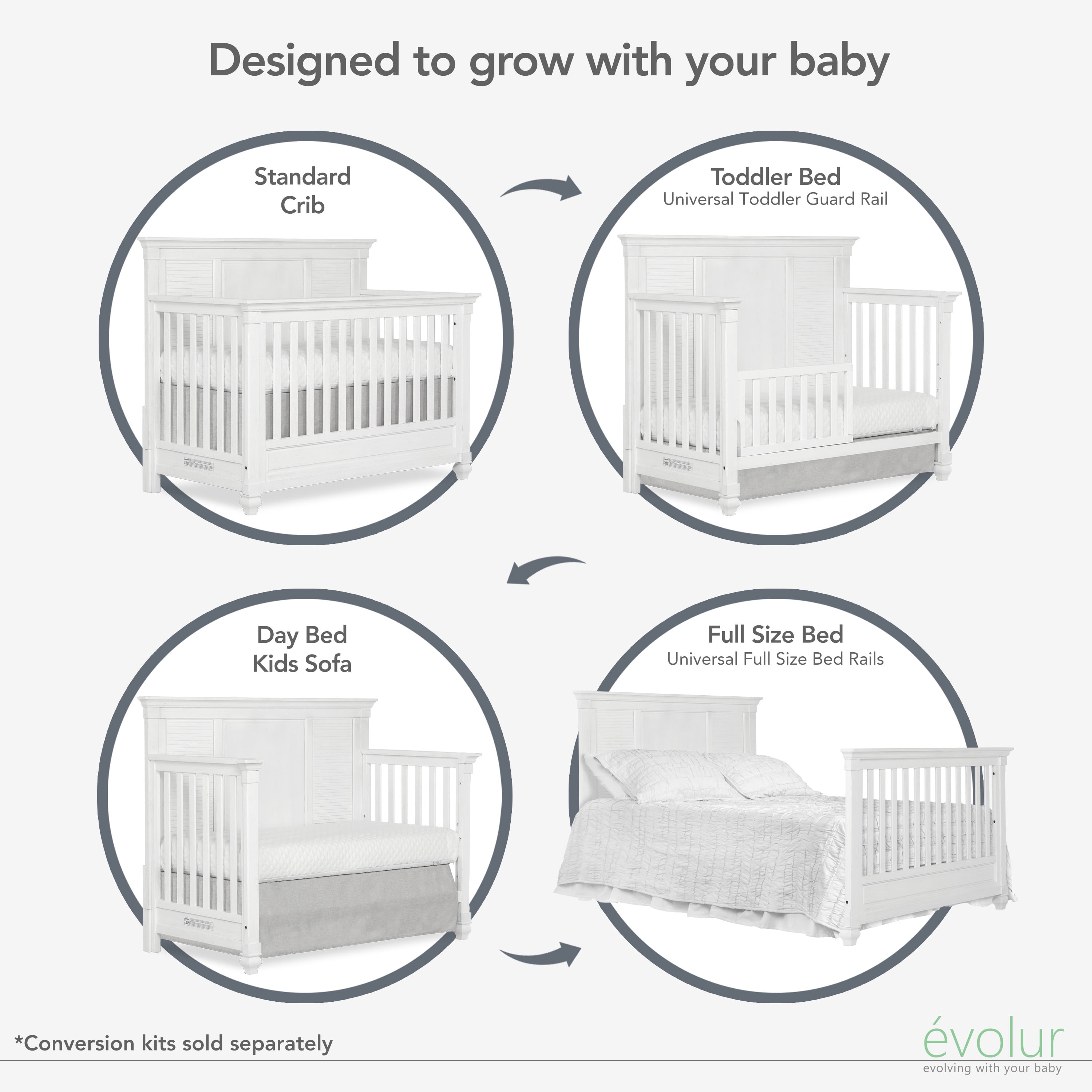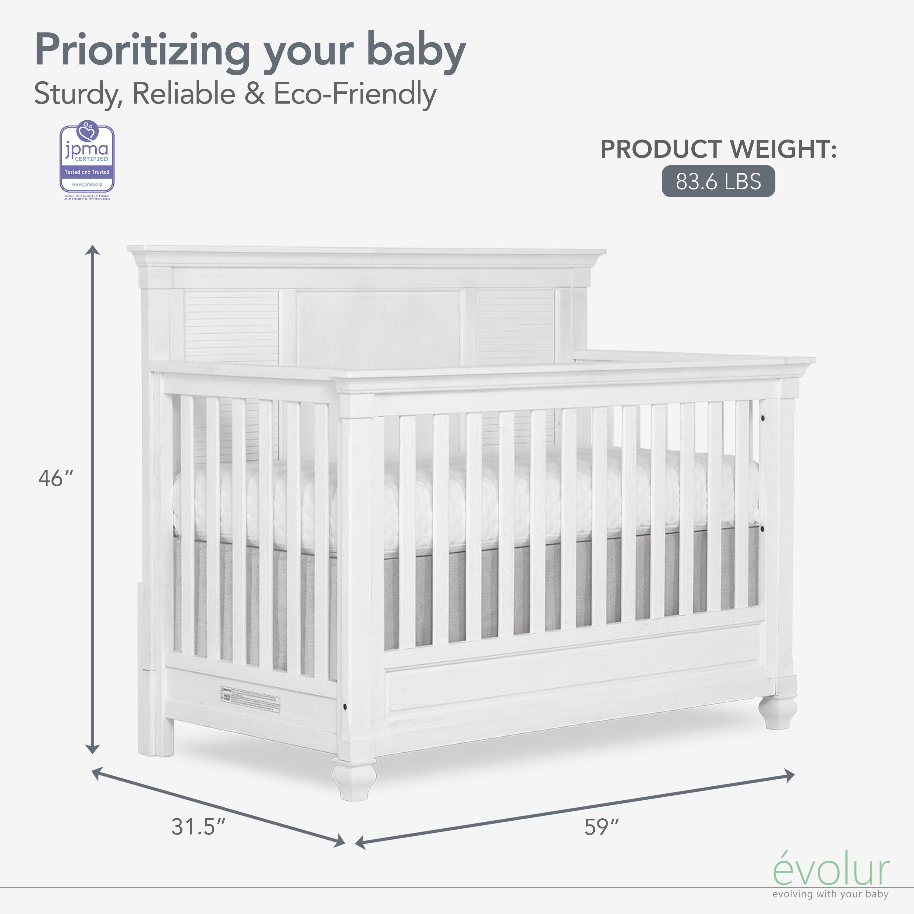Evolur Signature Cape May 5-in-1 Full Panel Convertible Crib: The Evolur Signature Cape May collection offers coastal luxury while keeping your child safe. The Cape May is crafted out of Kiln-dried hardwood with fine veneers. Features hidden hardware with a 3-mattress height setting to accommodate your growing baby, and fixed stationary sides rails. The Cape May converts to a charming toddler bed with our conversion kit (sold separately); daybed and the back panel converts to a full-size headboard with the simple addition of our wooden bed frame (sold separately) Our cribs are designed and engineered to the highest safety standard that meets and exceeds those set by the Consumer Product Safety Commission and the American Society for testing and materials. Each of our cribs undergoes rigorous testing by independent laboratories for compliance with all US and Canadian crib regulations. The crib is suitable for a standard-size crib mattress. We recommend Evolur Sleep or Dream On Me crib mattresses for a perfect fit. Also available in the Evolur Cape May Collection are coordinating pieces such as the Double Dresser; a Tall chest that offers a breezy beach nursery set that grows with your child. This collection can help you create a calming oasis in your home by making your baby’s room int-a favorite seaside holiday. It could be the seashells, dolphins jumping through the waves, surfers, sailboats off in the distance, or just lying on the sand listening to the waves that give you that special feeling that only the ocean can bring. While designing this collection the Evolur team of moms and dads took their children to the beach for a day filled with laughter, surfing, building sandcastles, collecting seashells, and watching the sunset over the horizon while the cool waves wash against our feet’s. From all of us at Evolur we hope that this collection creates a dreamy beach inspirited nursery for your little one.