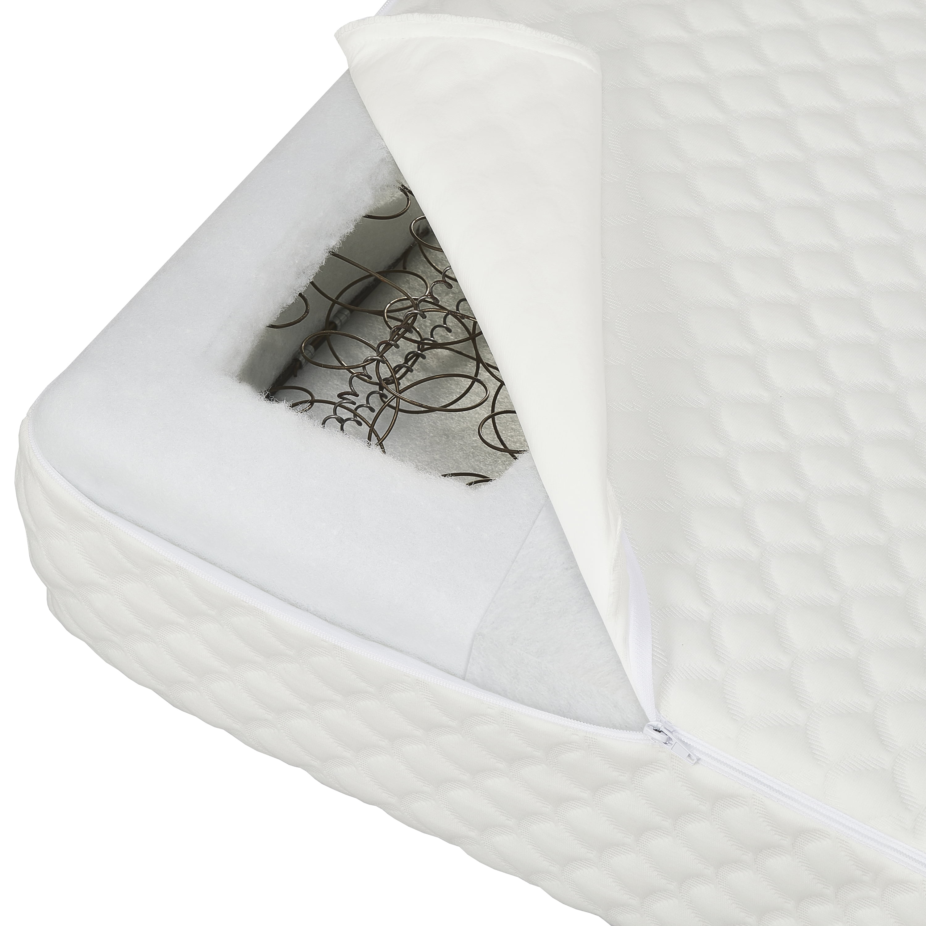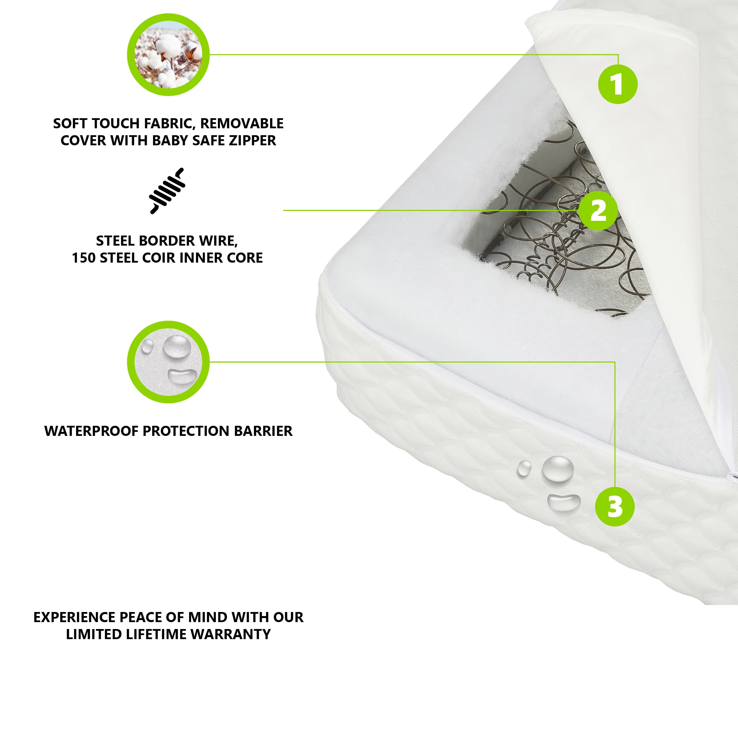 Removable Soft woven cover with baby safe zipper Waterproof binding to keeps liquids, bacteria, bed bugs and dust mites out yet allows air to flow 150 heavy duty coil 2 ½” Ultra Firm insulated layer Infant Side, 2 ½” Comfort Support insulated laye